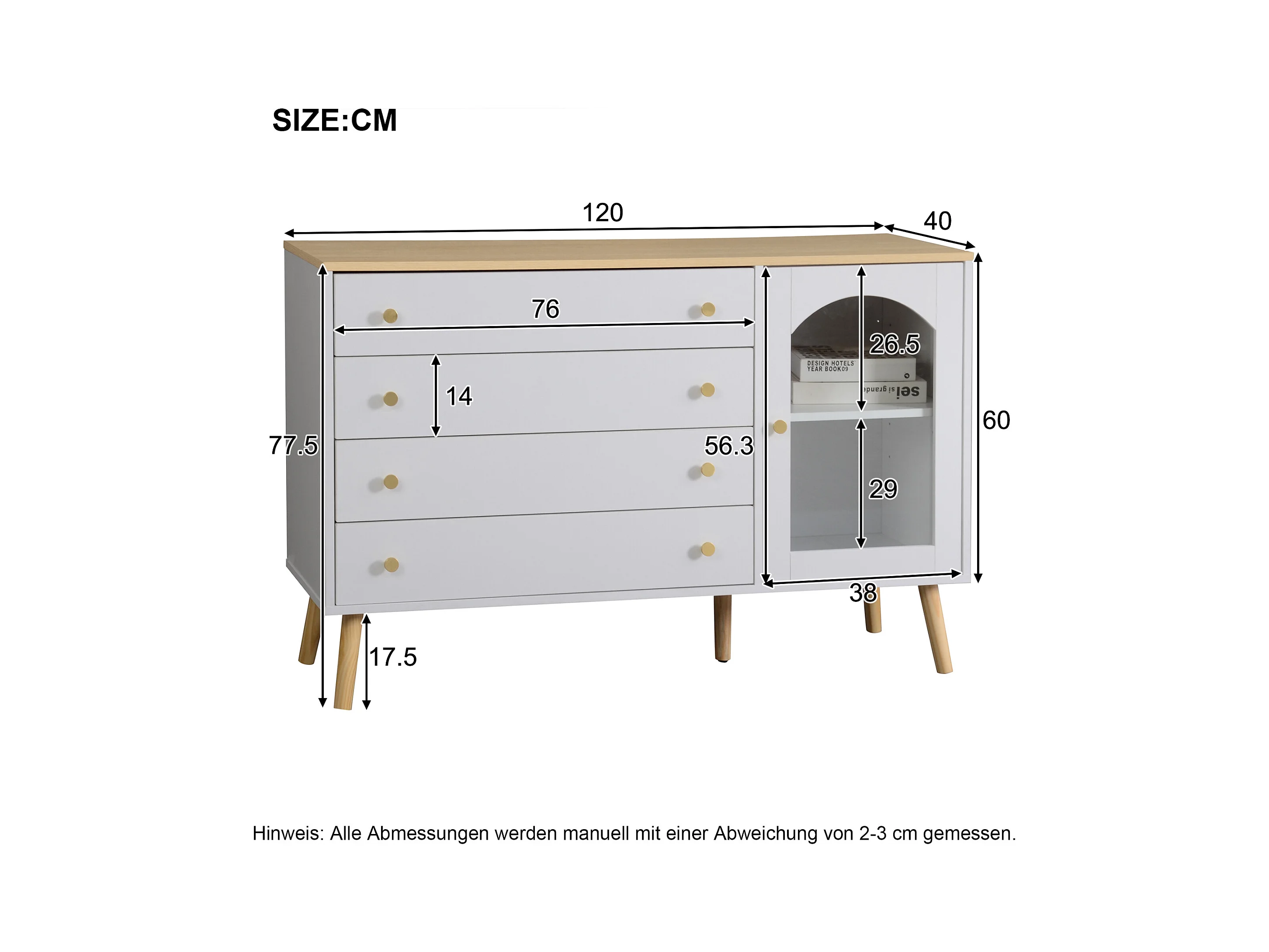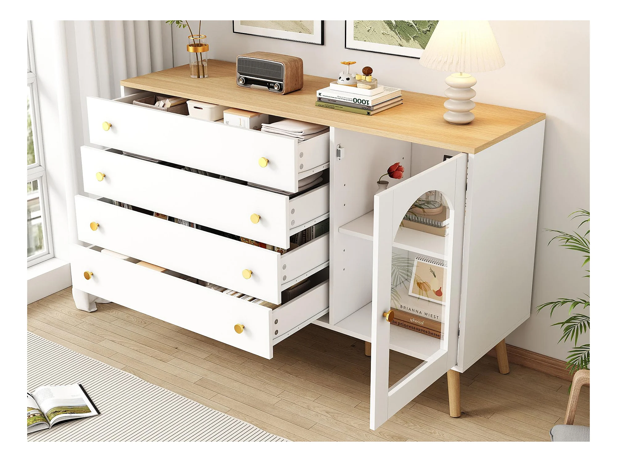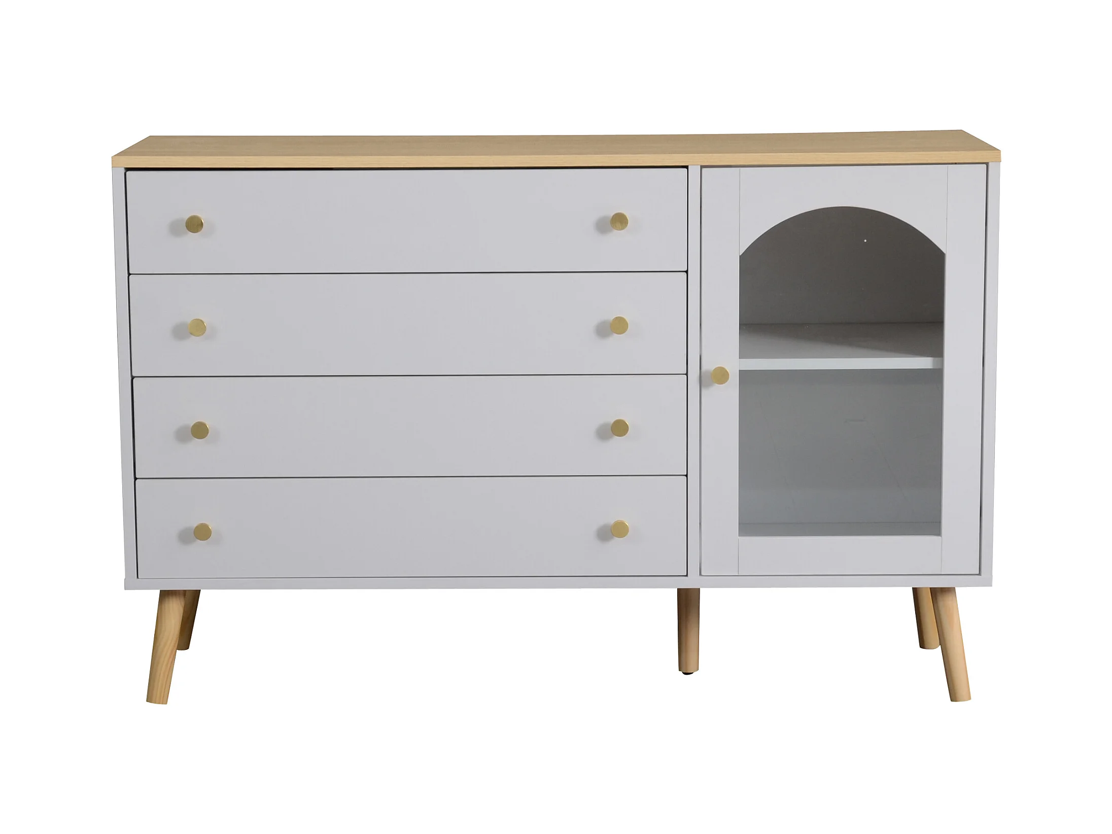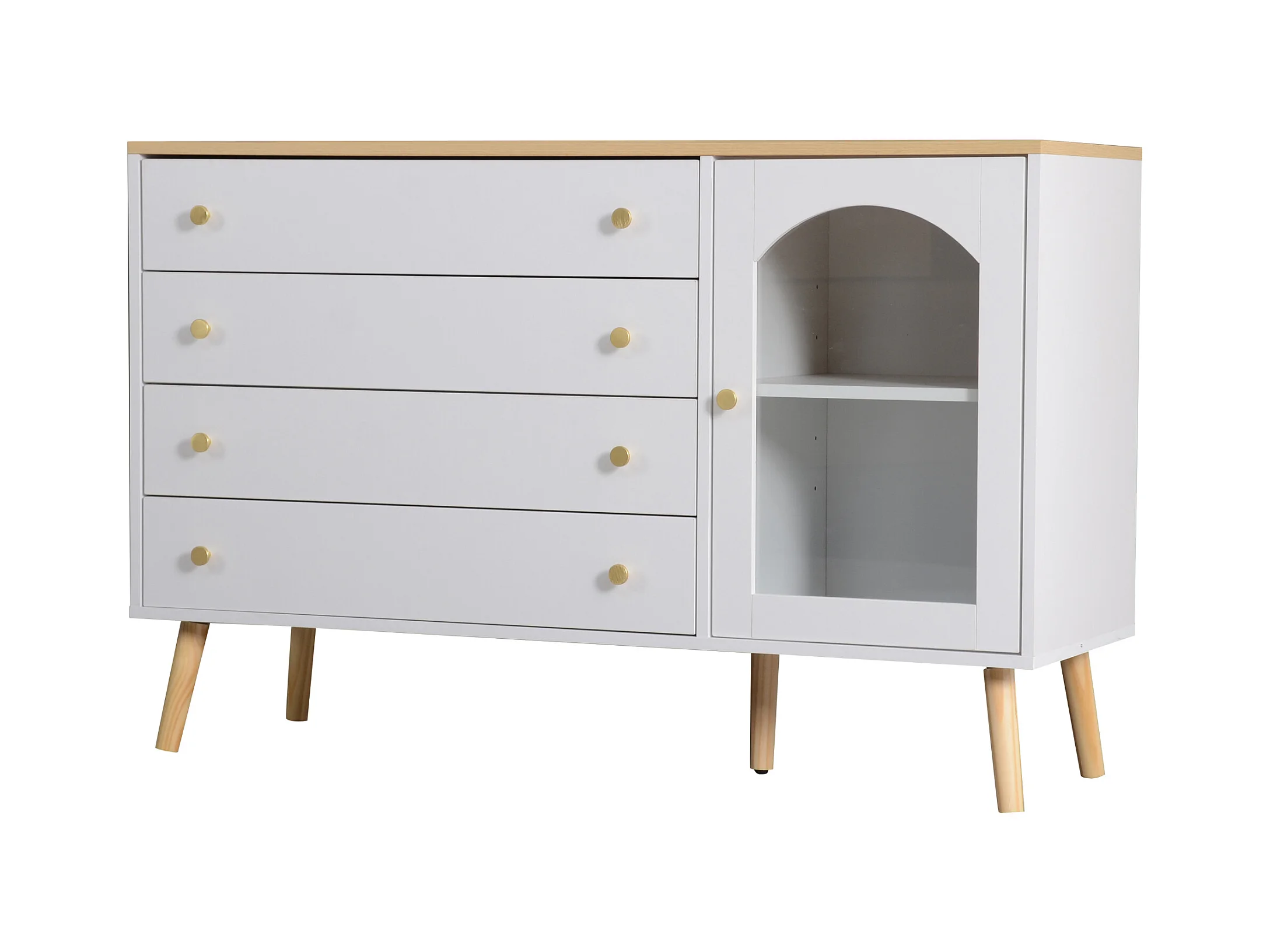 Buffet 40x120x77.5 cm - avec 4 tiroirs - avec 1 porte - panneaux de particules + verre - blanc