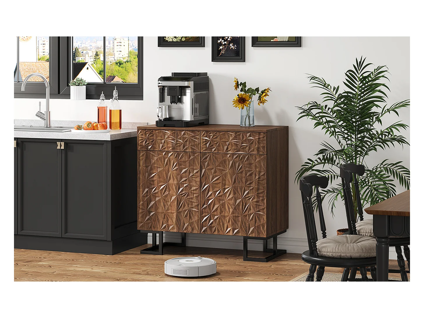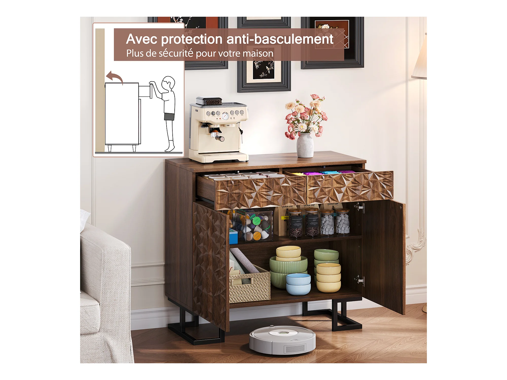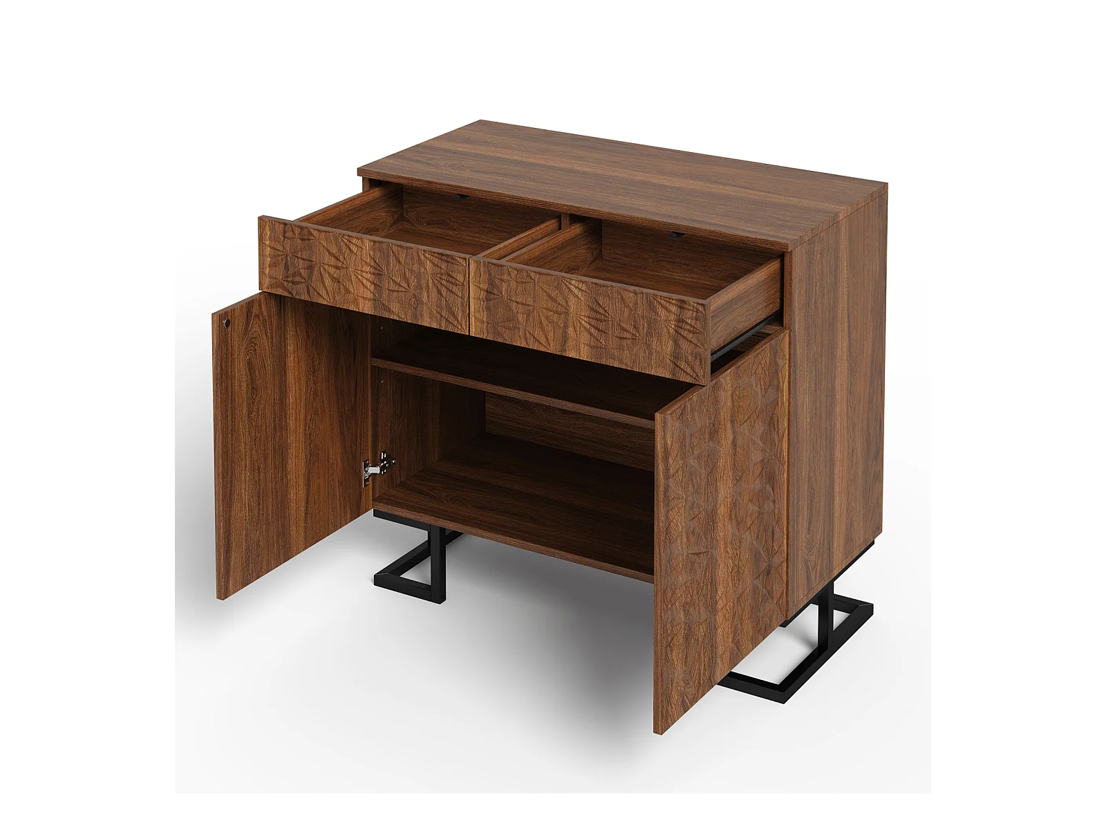 Buffet 80×40×78 cm série en noyer foncé avec relief feuilles, pieds métal, 2 tiroirs et 2 portes – Sans poignées, idéal salon et salle à manger