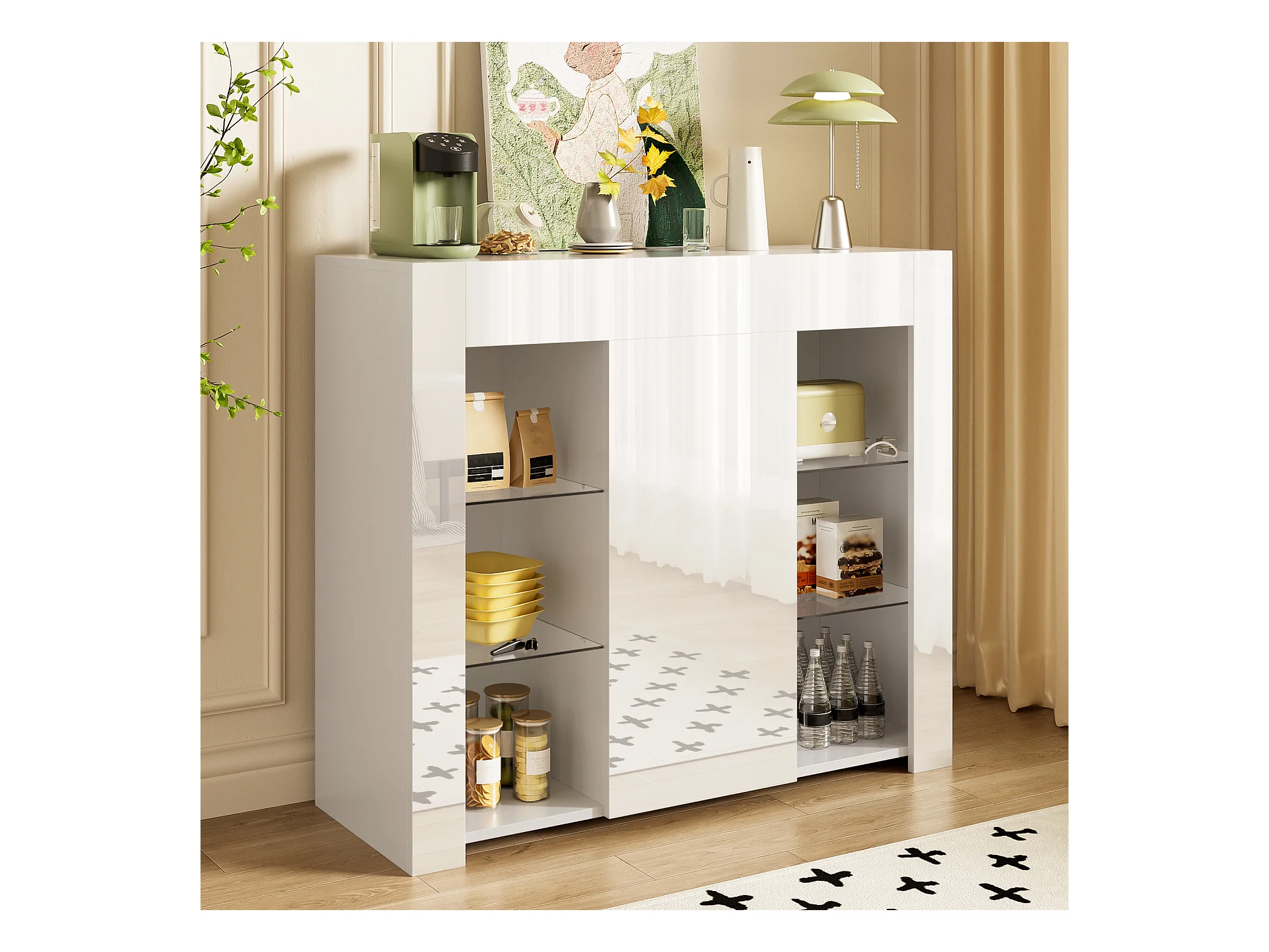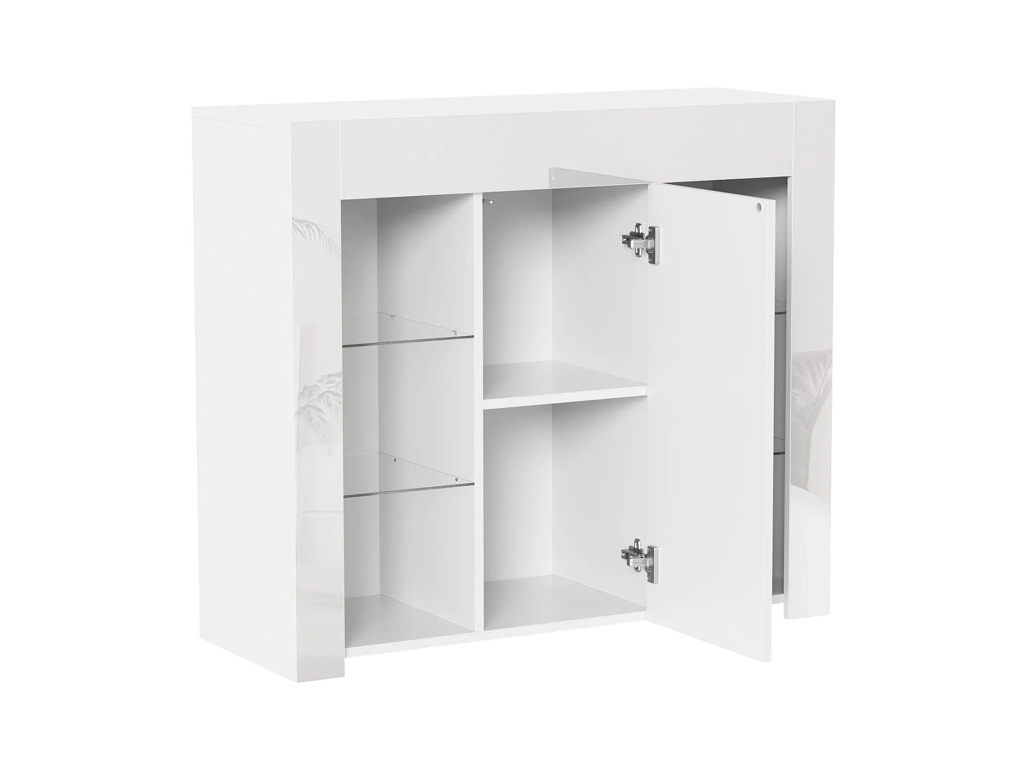 Buffet 95x35x83 cm - finition brillante - 1 porte - avec étagères en verre - panneaux de particules - blanc