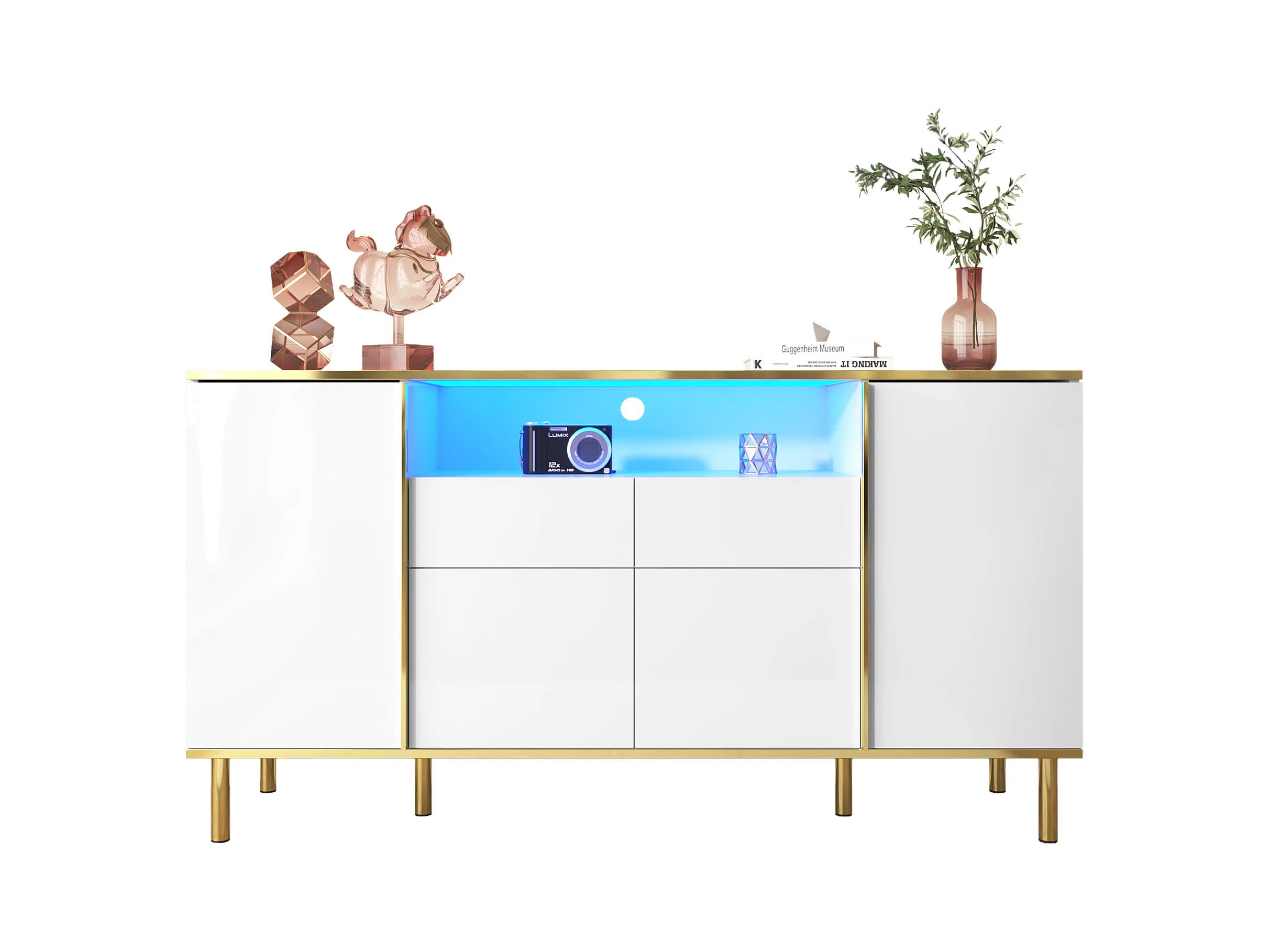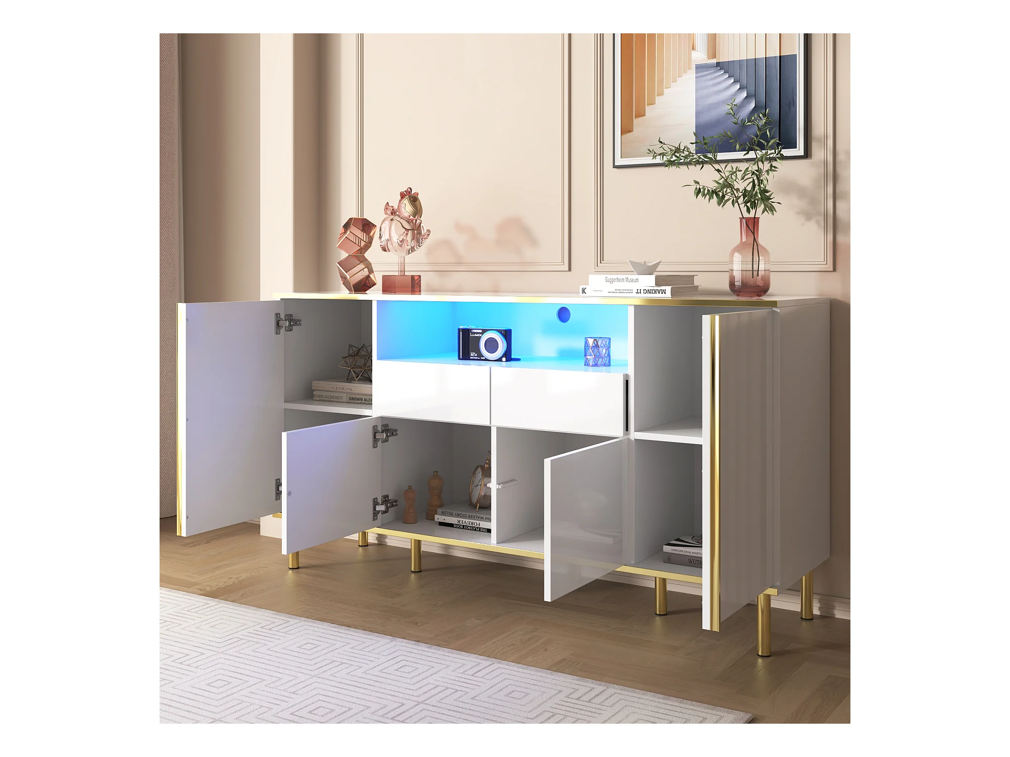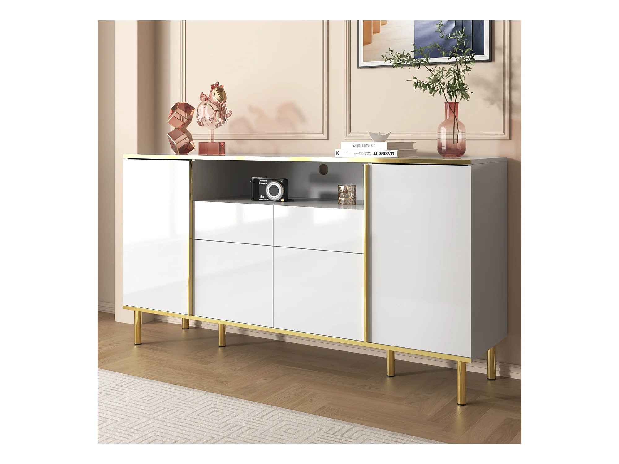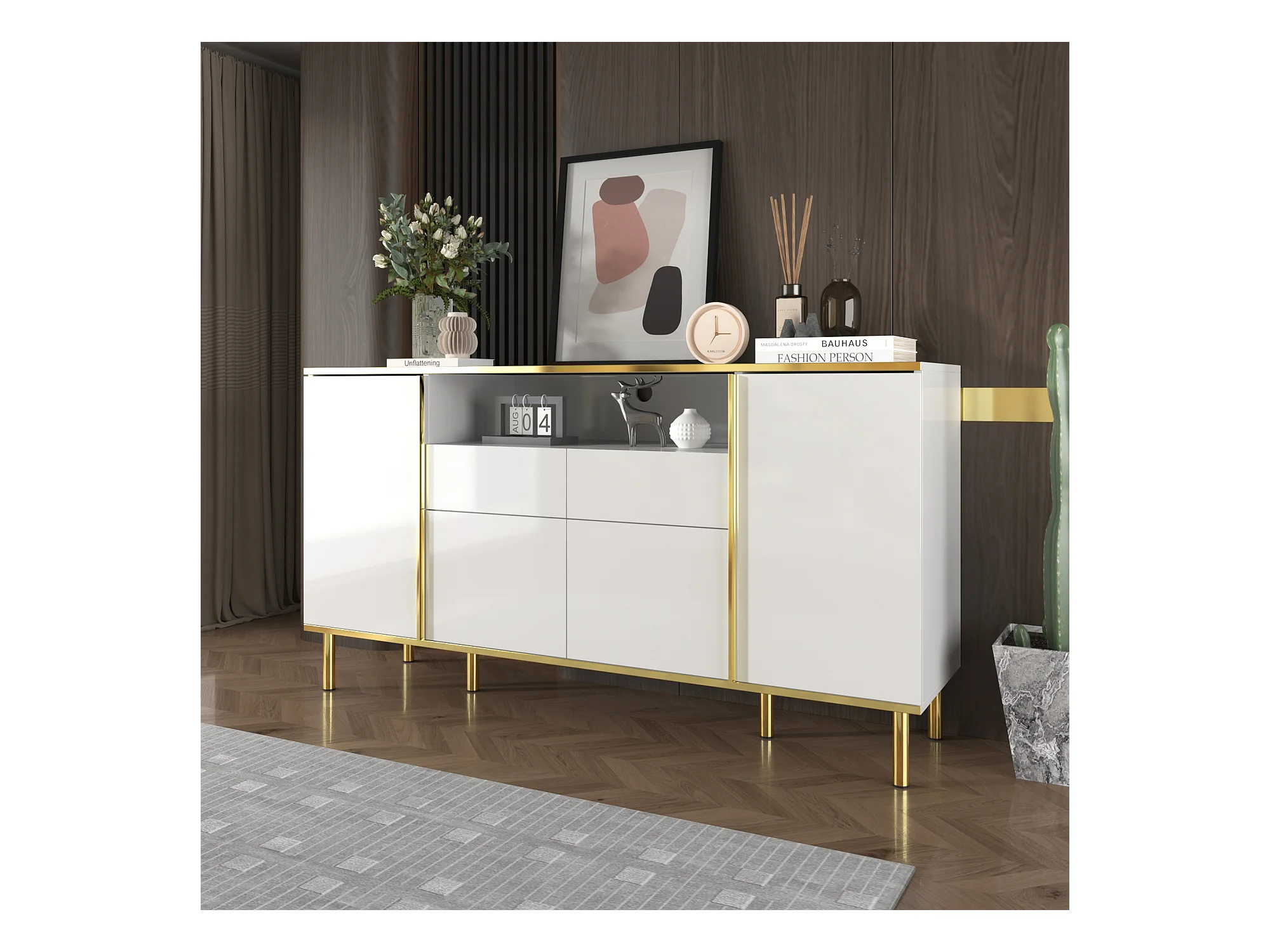 Buffet à haute brillance avec 4 portes, 2 tiroirs et un compartiment - 150 x 40 x 80 cm - Panneaux de particules - Blanc et or
