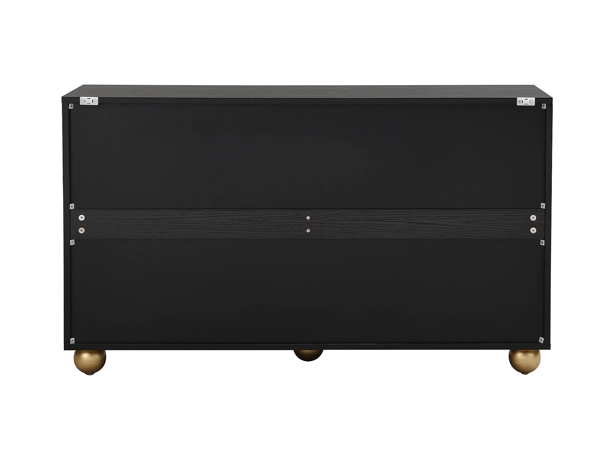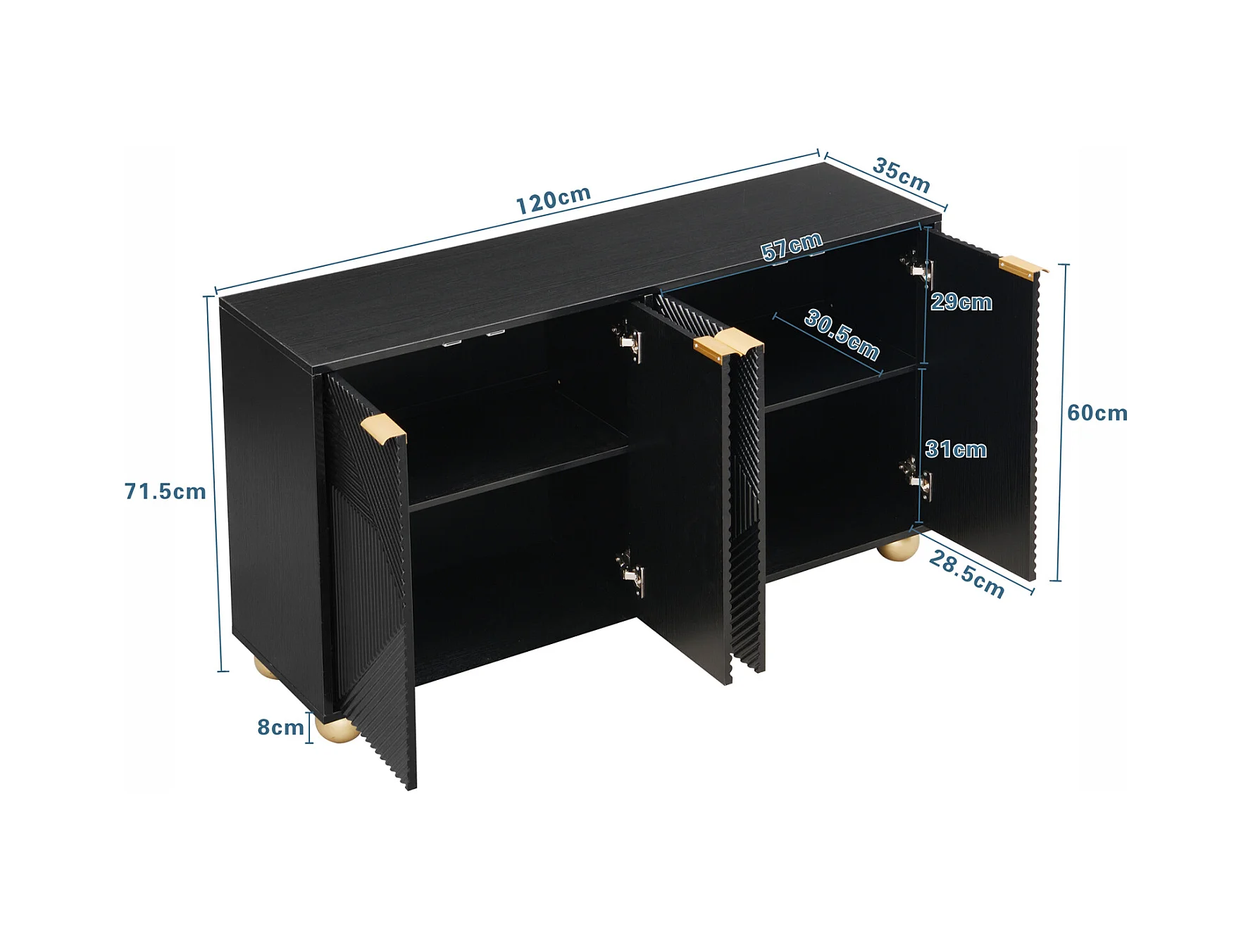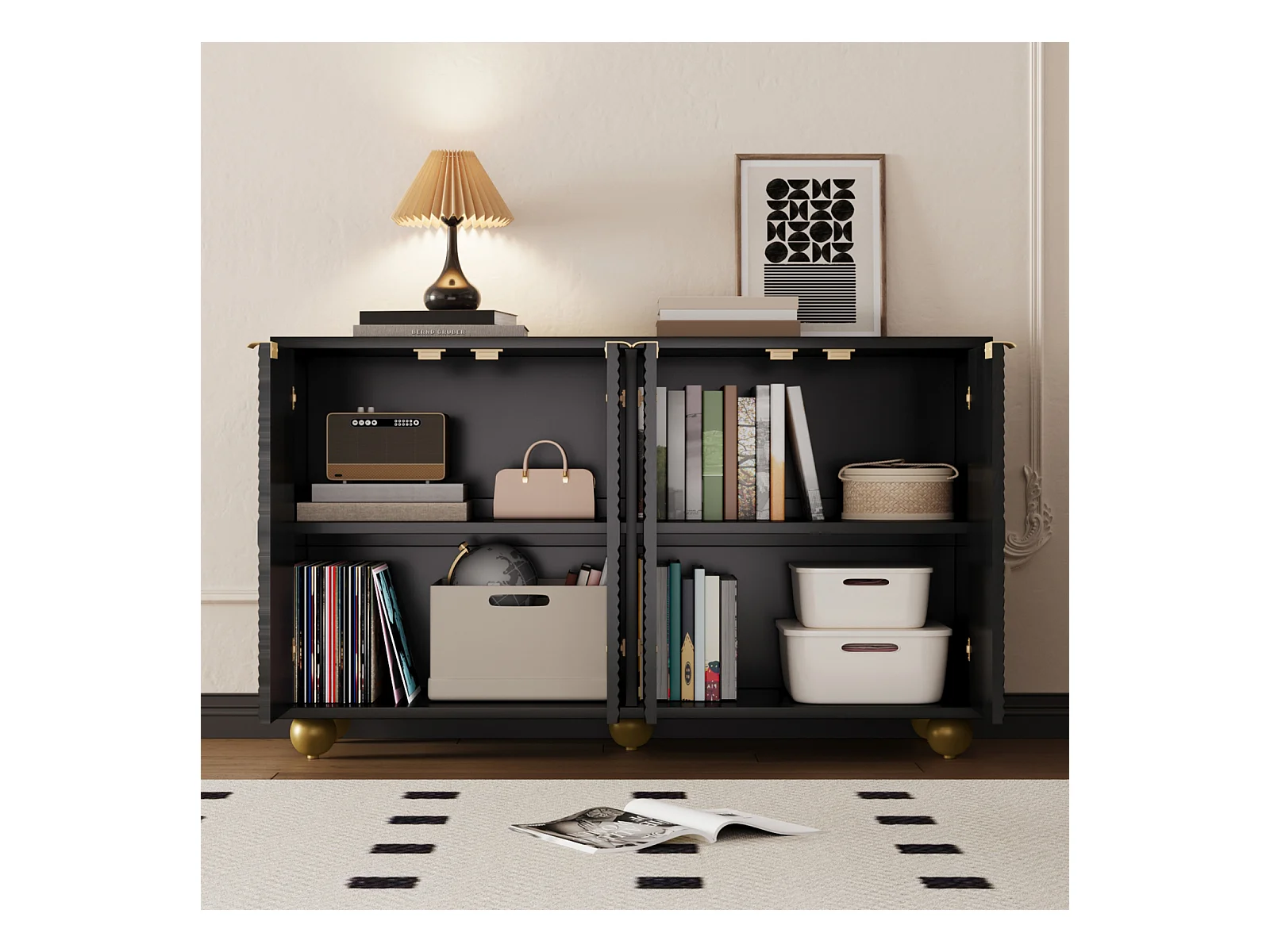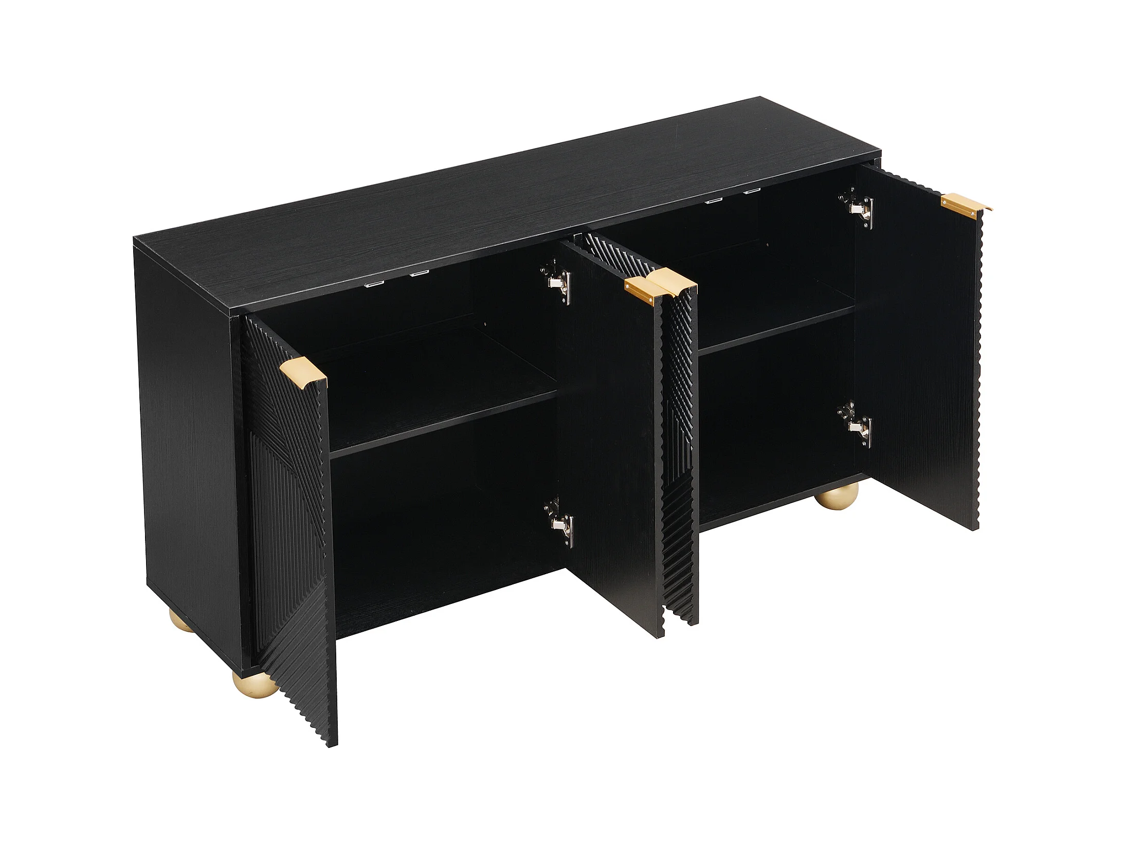 Buffet à quatre portes, étagères intérieures réglables, poignées en métal et pieds sphériques, noir