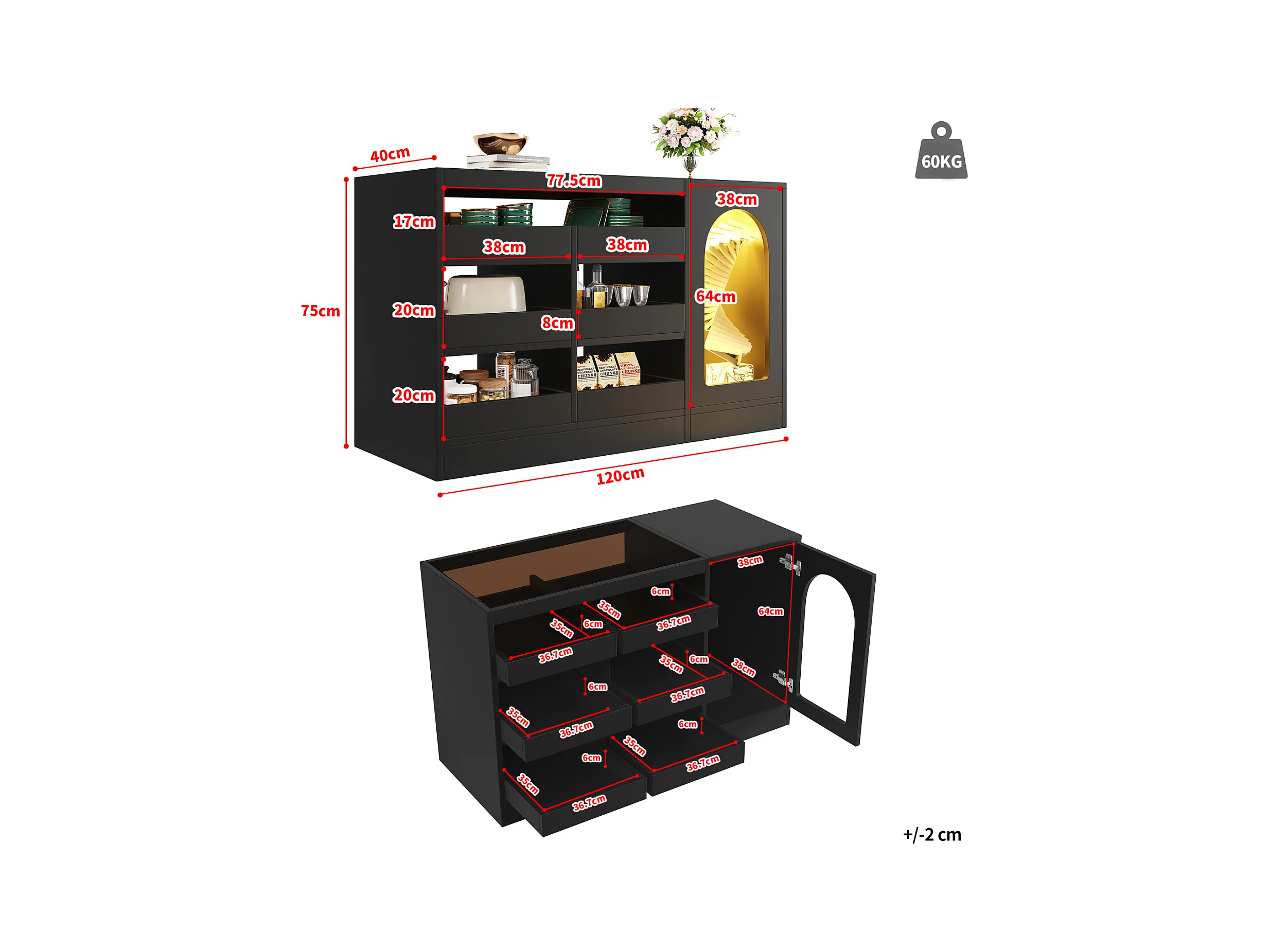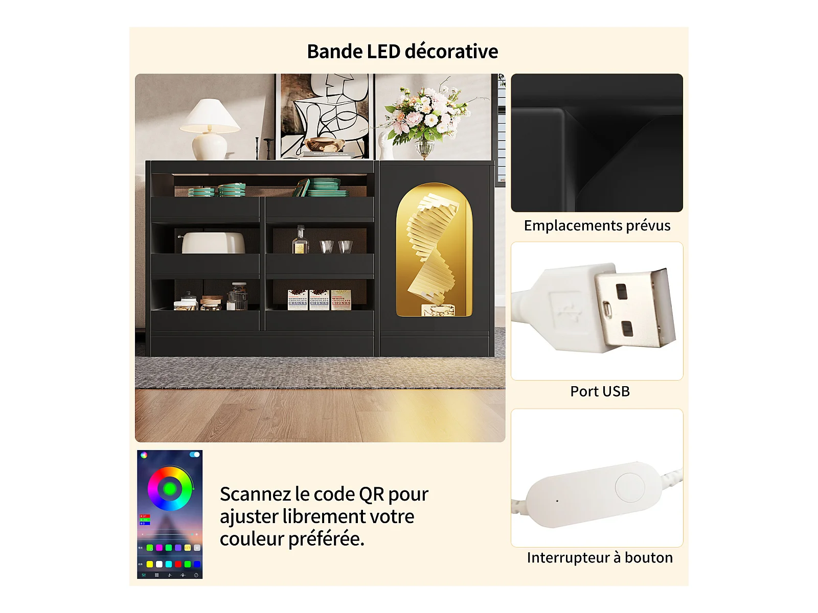Buffet à tiroirs noir moderne et épuré avec 6 tiroirs, porte haute et éclairage LED – Idéal pour chambre, salon et salle à manger