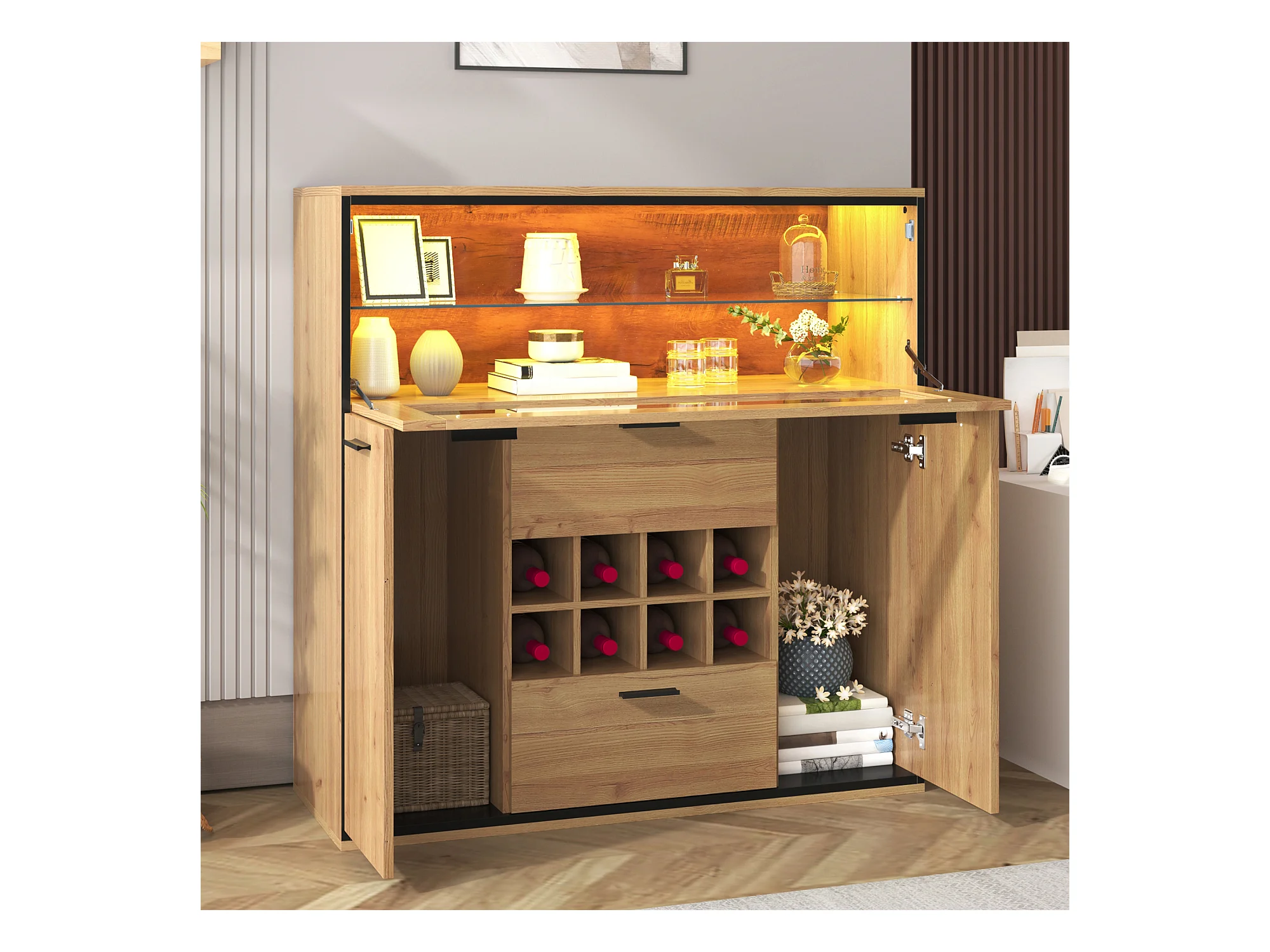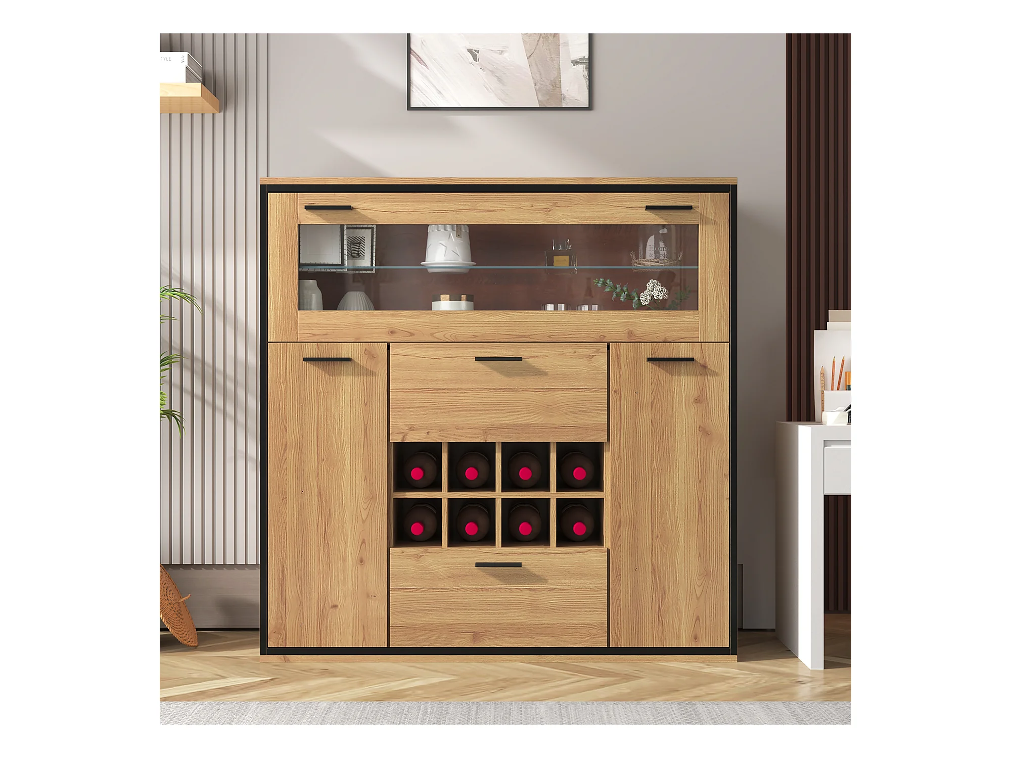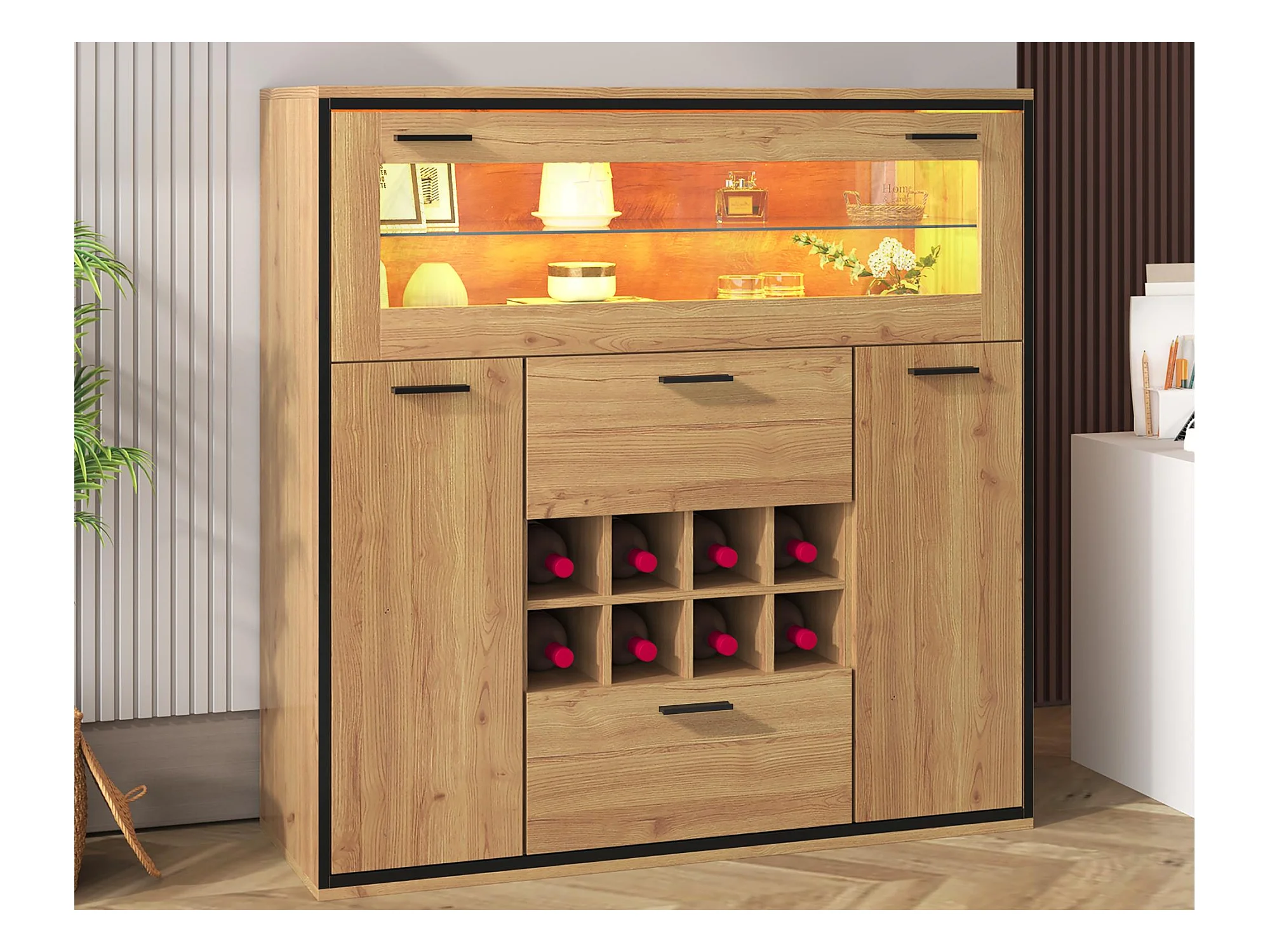 Buffet、Casier à vin avec LED - 2 portes & 2 tiroirs & clayettes en verre - Naturel