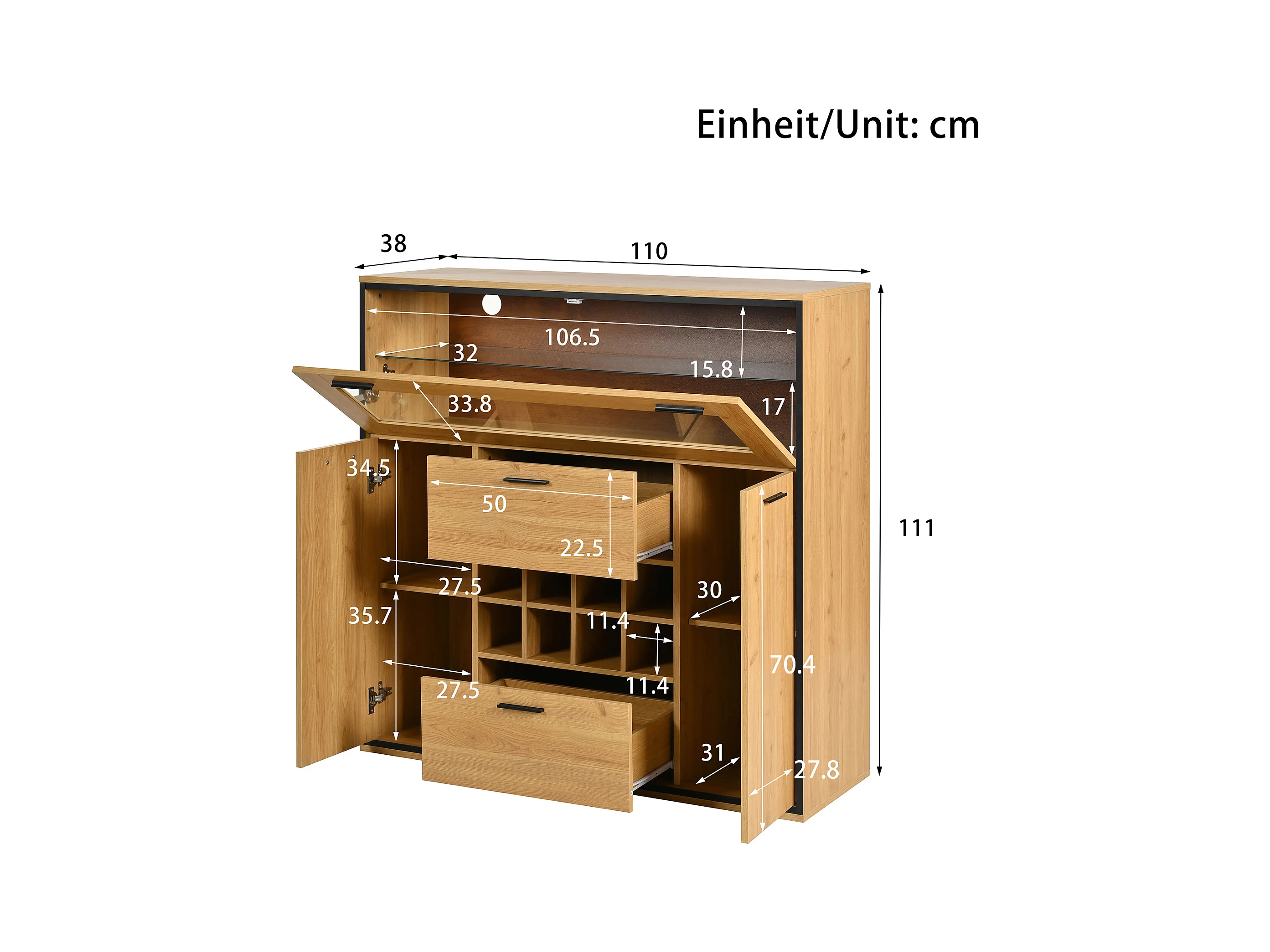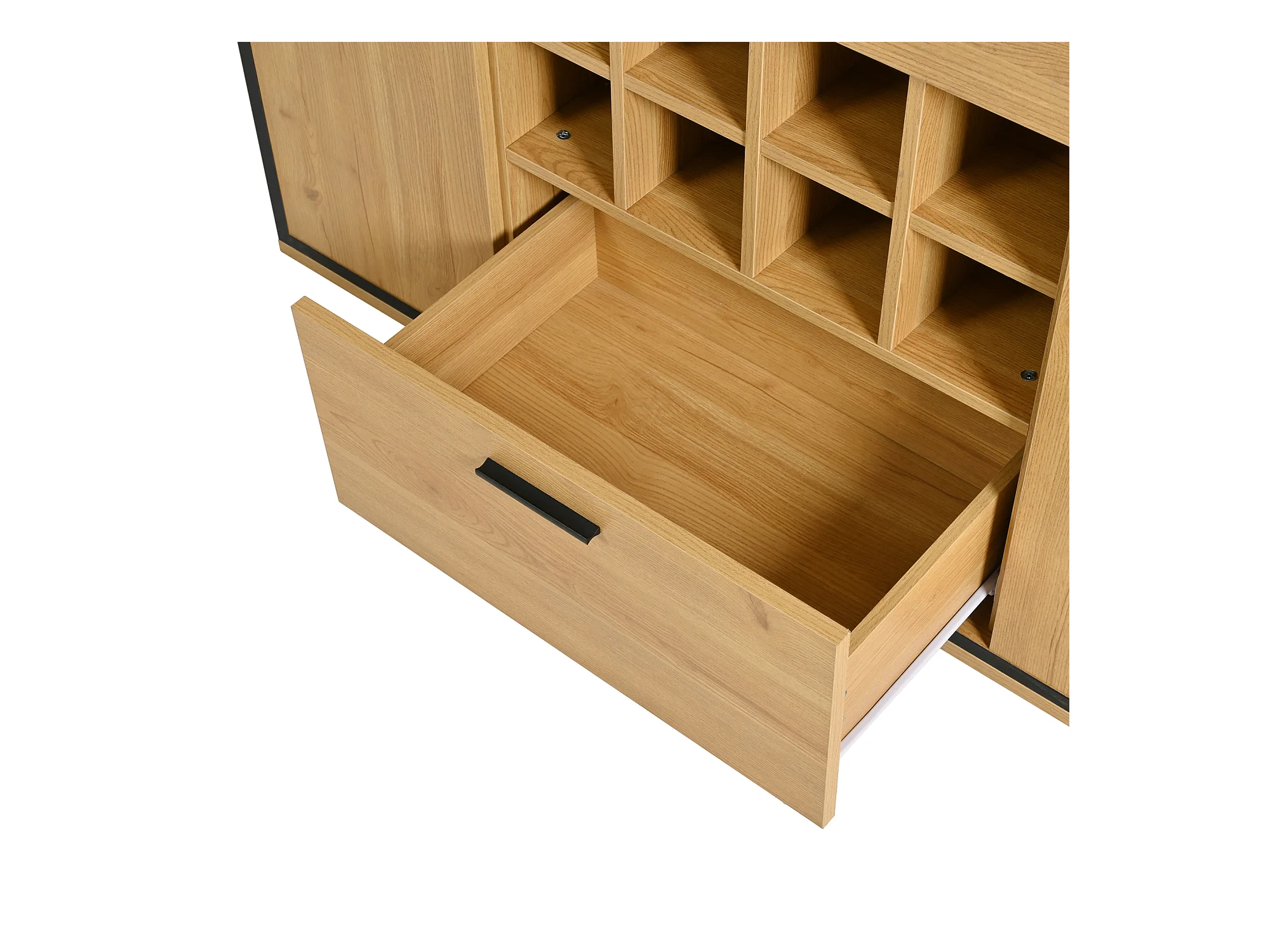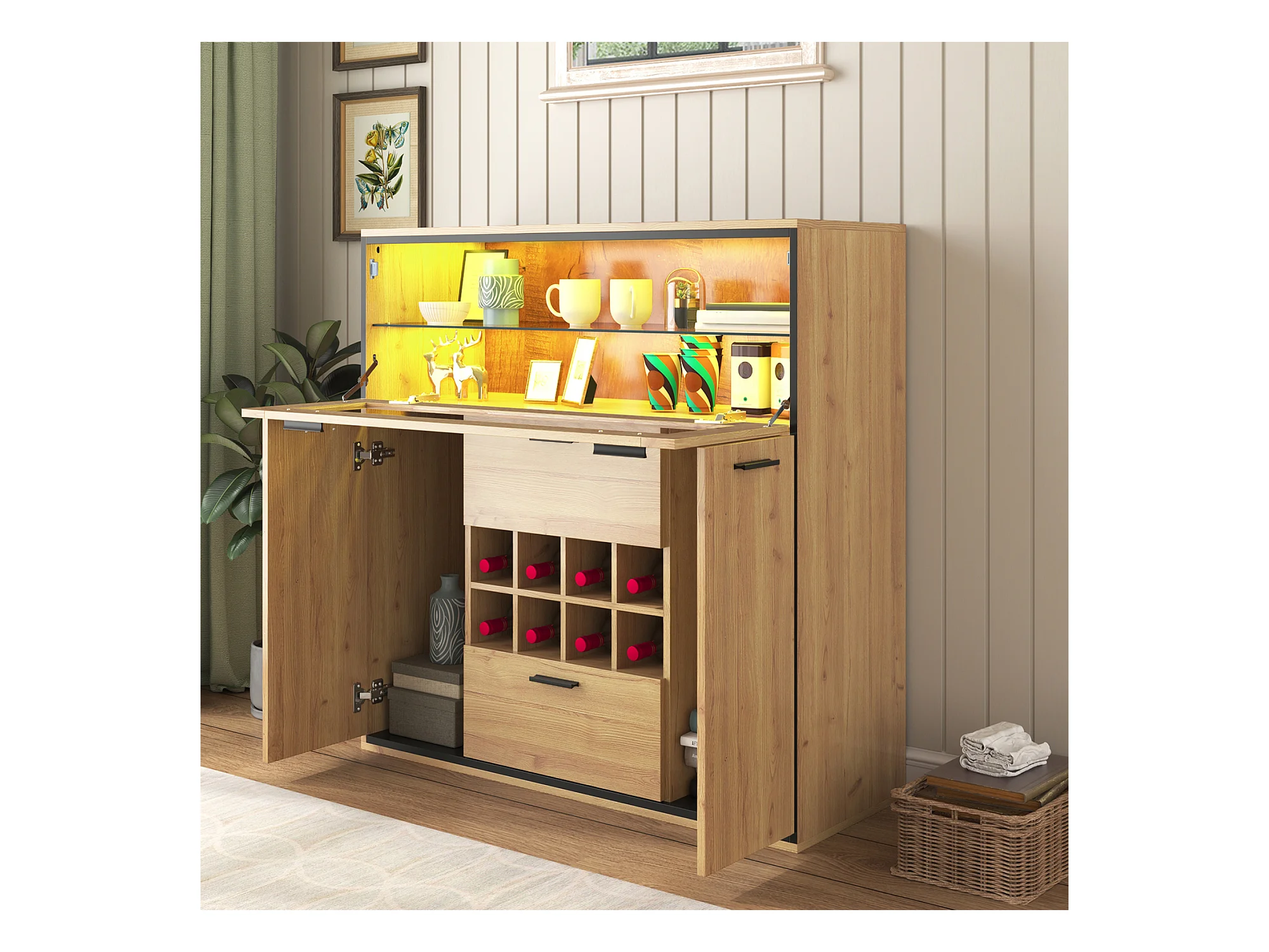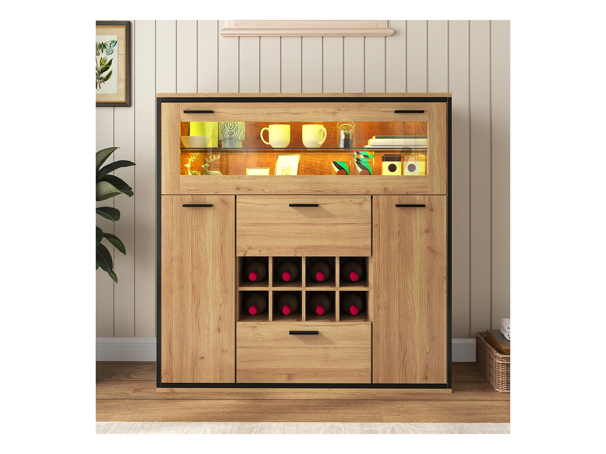 Buffet、Casier à vin avec LED - 2 portes & 2 tiroirs & clayettes en verre - Naturel