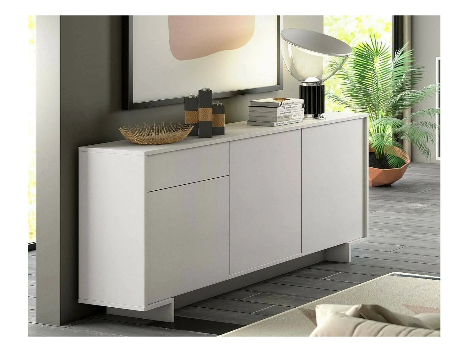Buffet Aneto, Buffet de salon, Buffet de salon avec 3 portes et 1 tiroir, 100% Made in Italy, 134x35h87 cm, Blanc et Ciment
