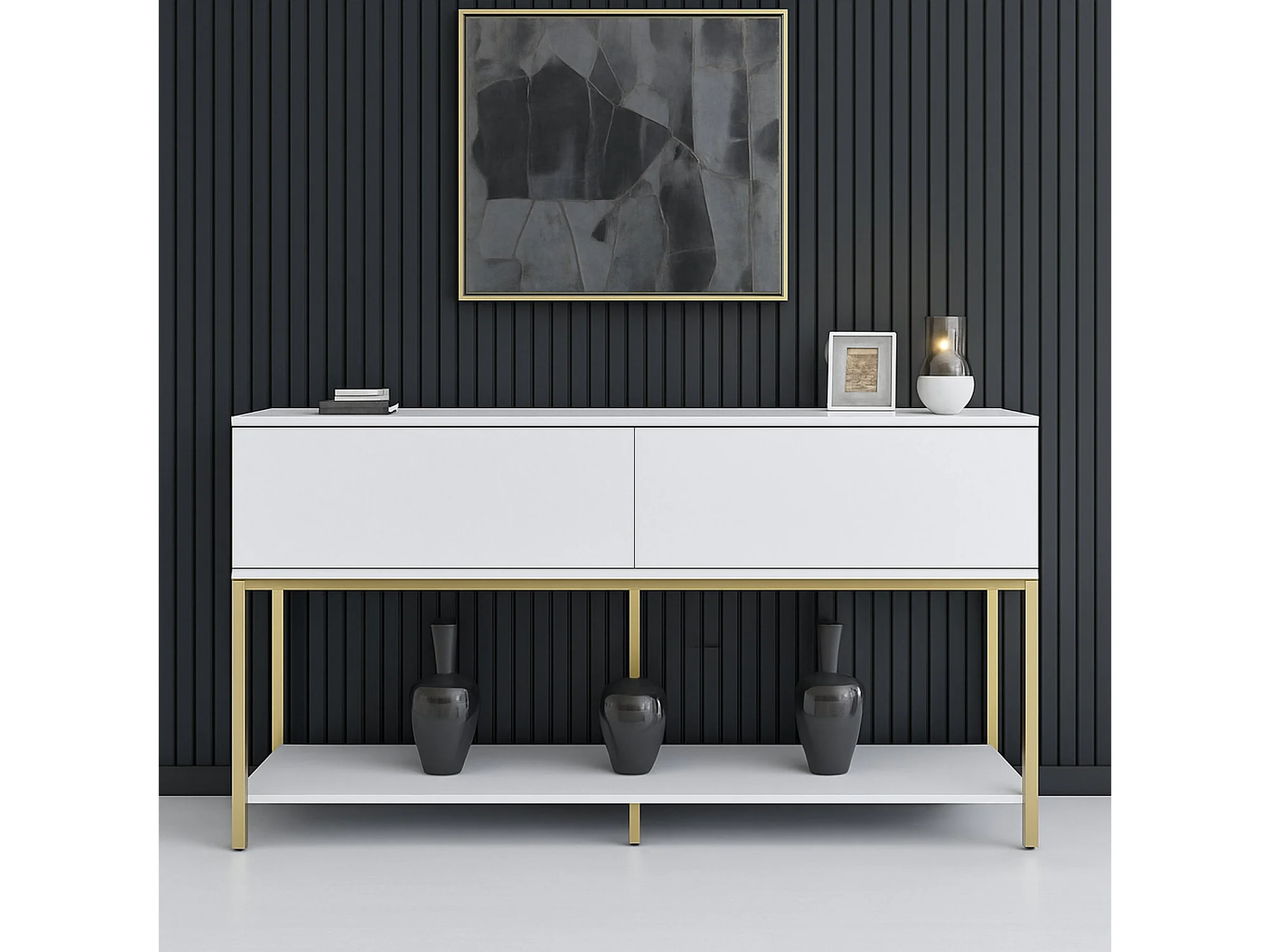Buffet Altair, Buffet du salon, Commode de salon, Garde-manger de cuisine, 150x30h80 cm, Blanc et Or