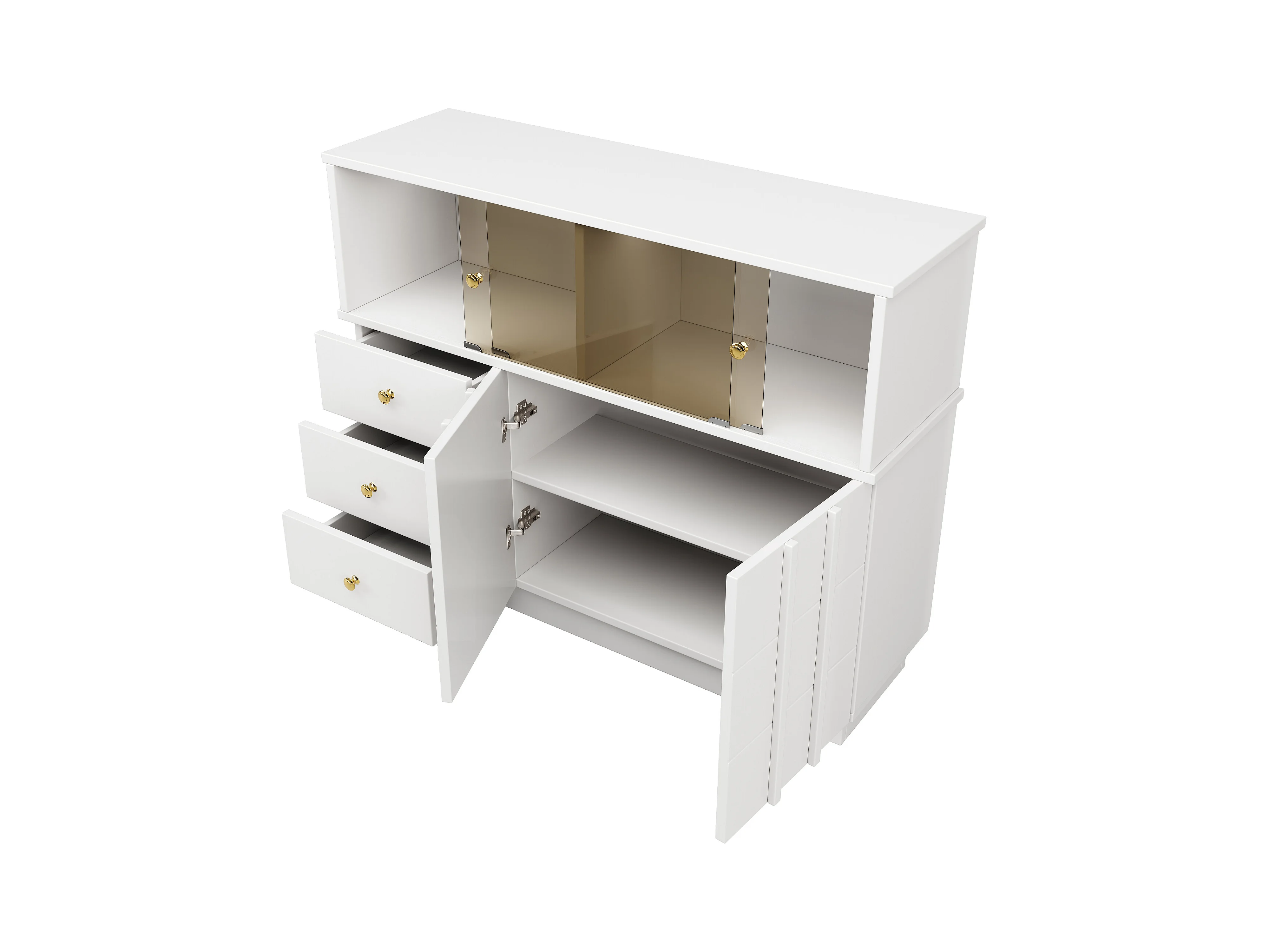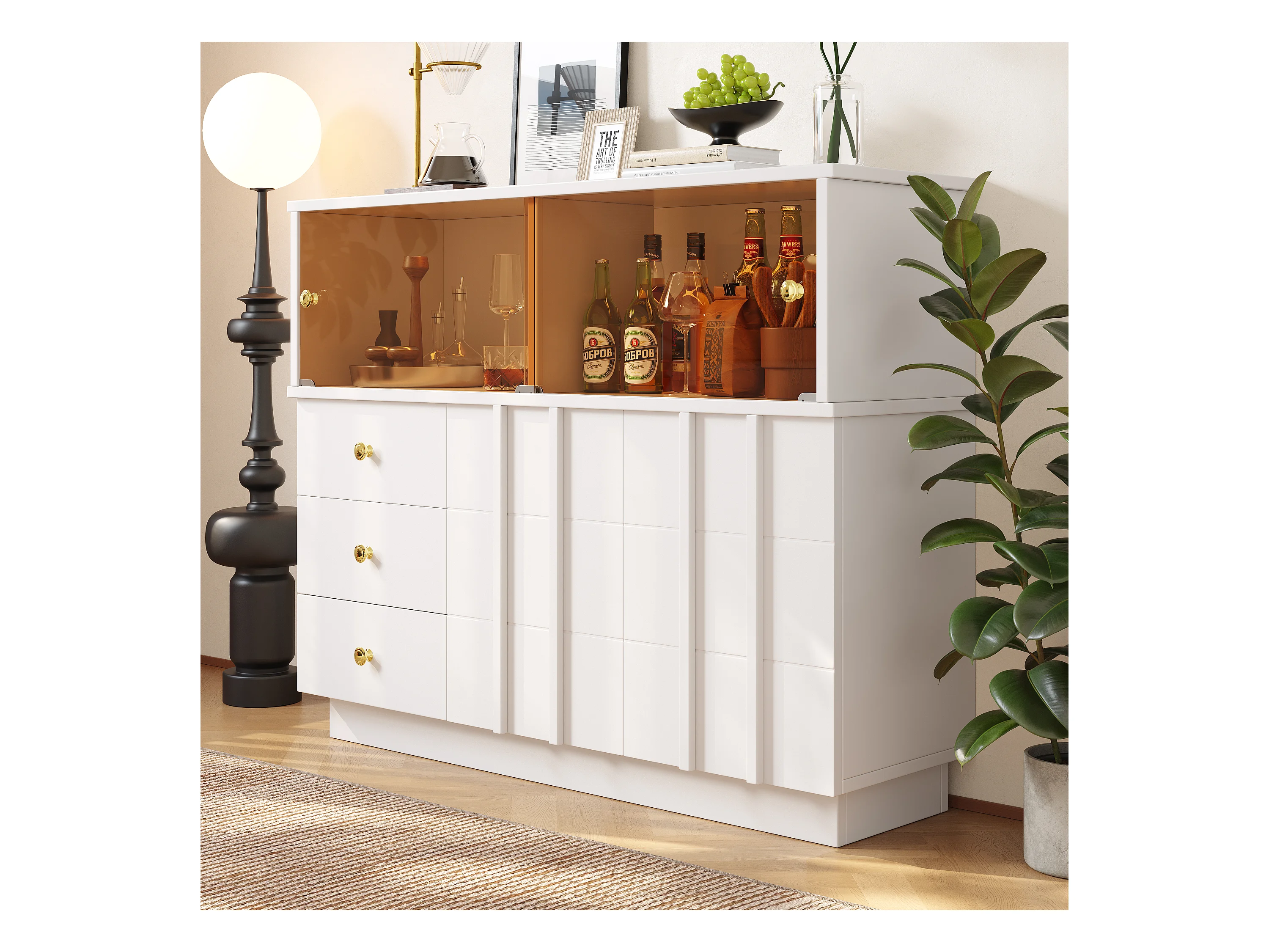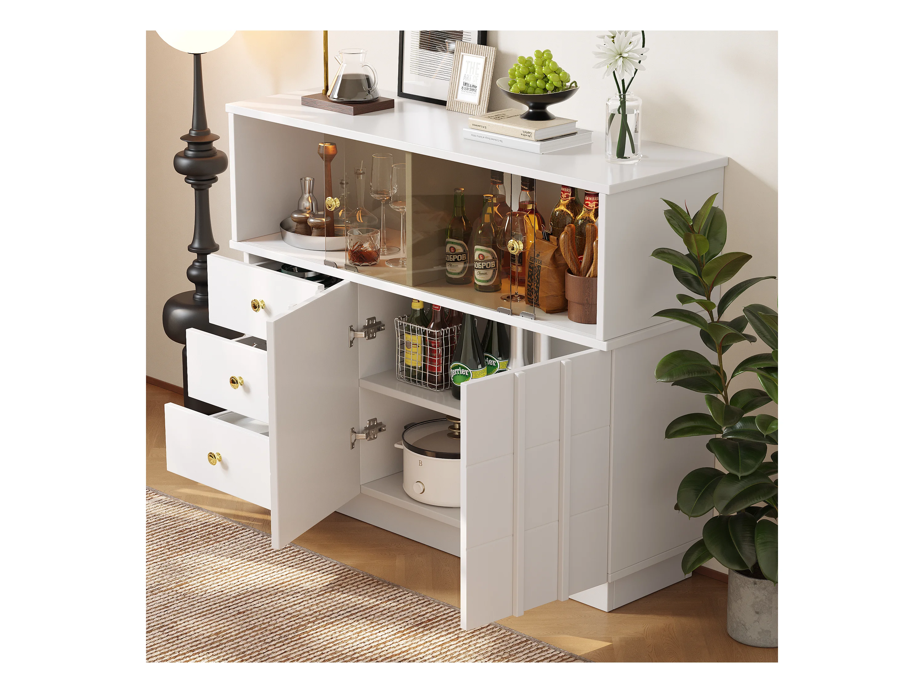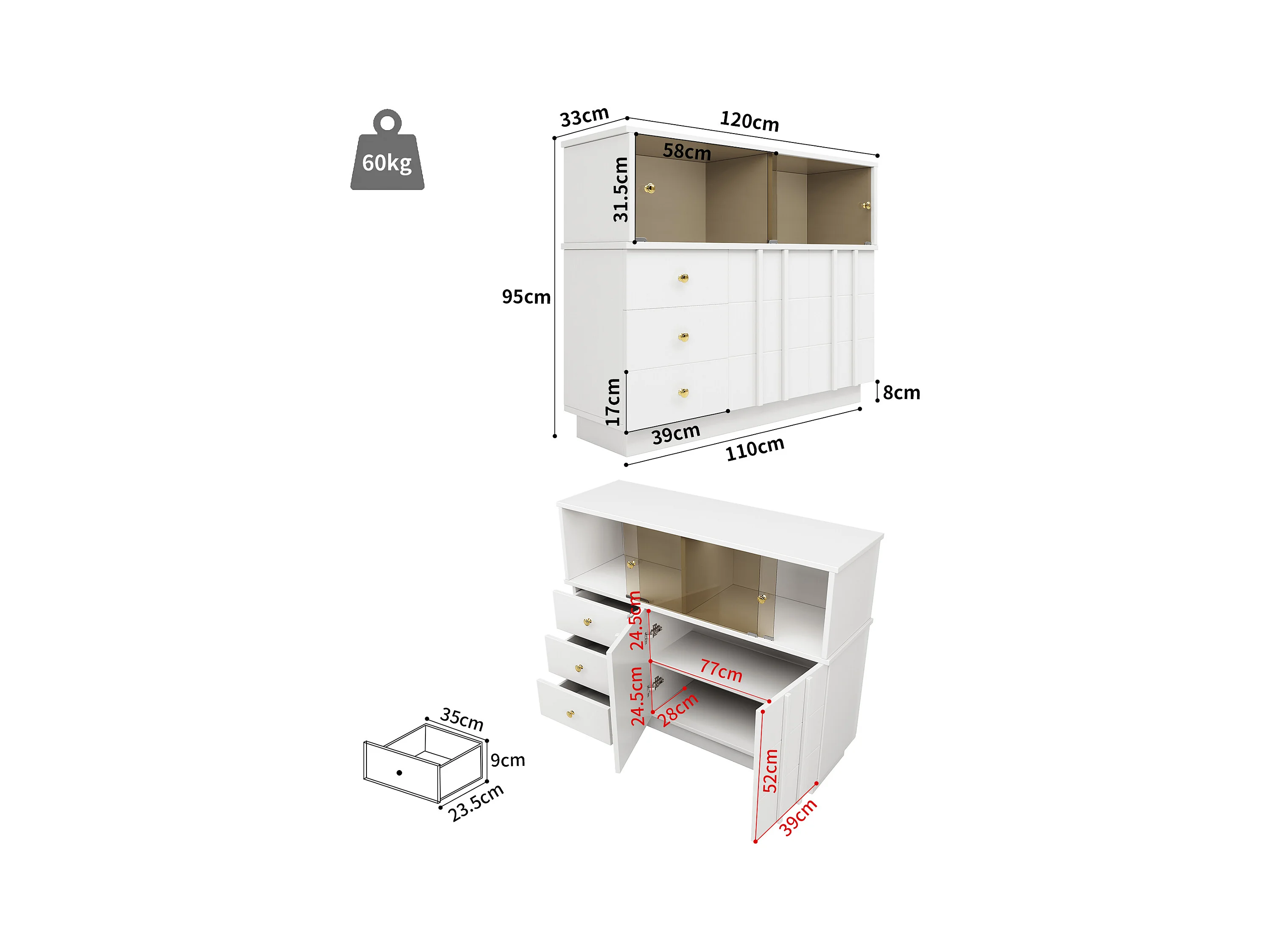 Buffet, armoire de cuisine avec 4 portes et 3 tiroirs - 120 x 33 x 95 cm - Bois MDF et portes en verre fumé - Blanc