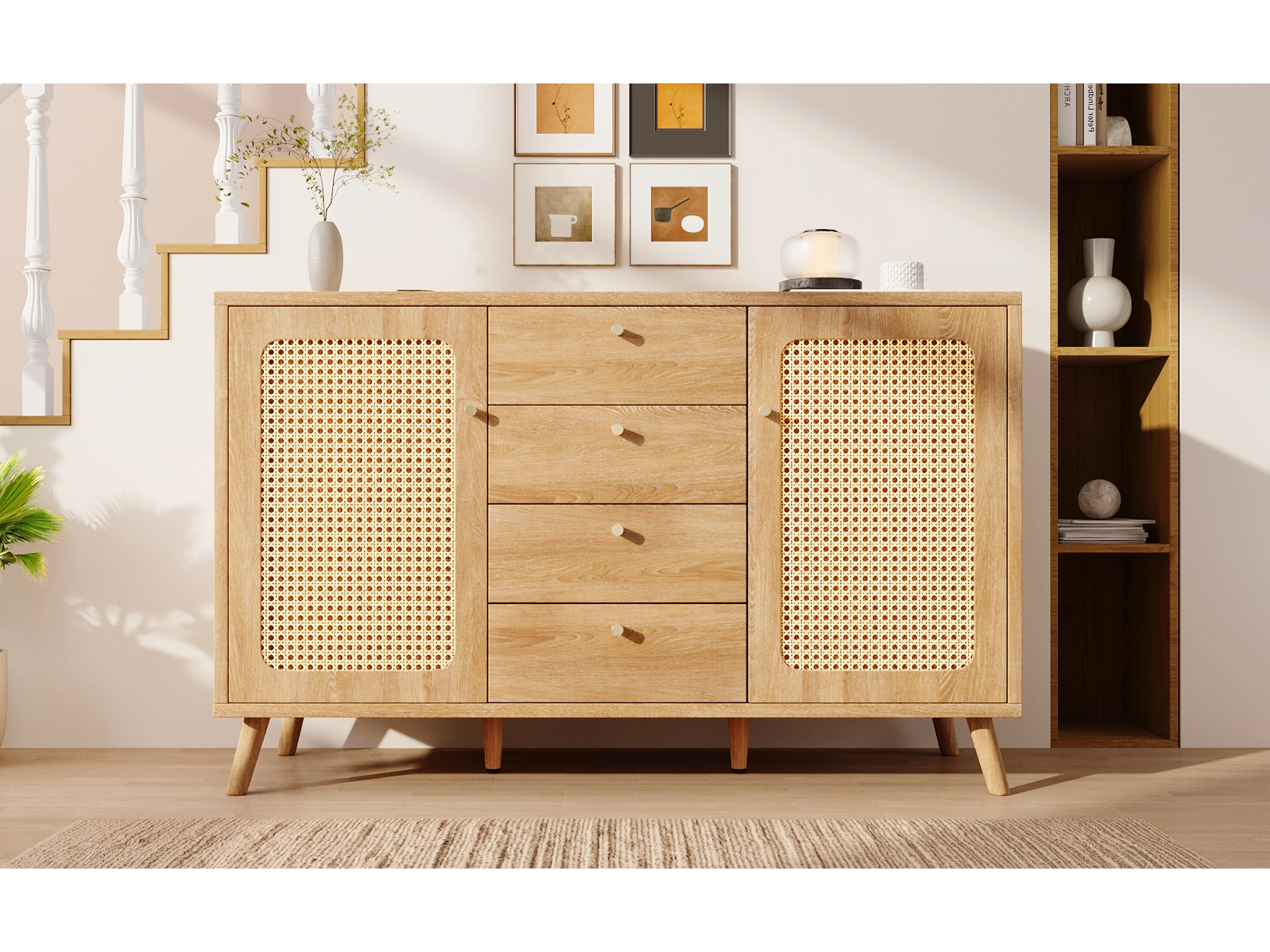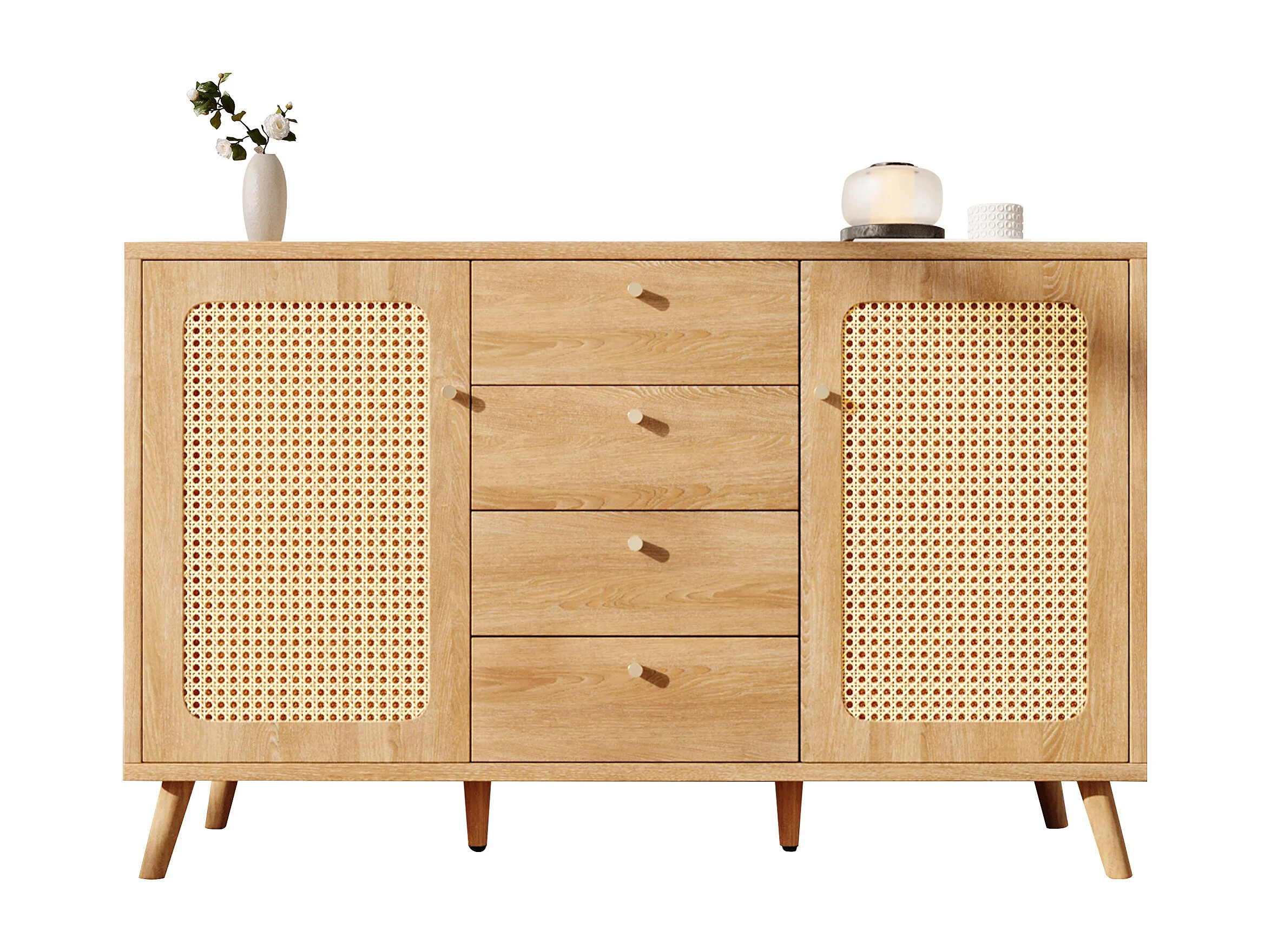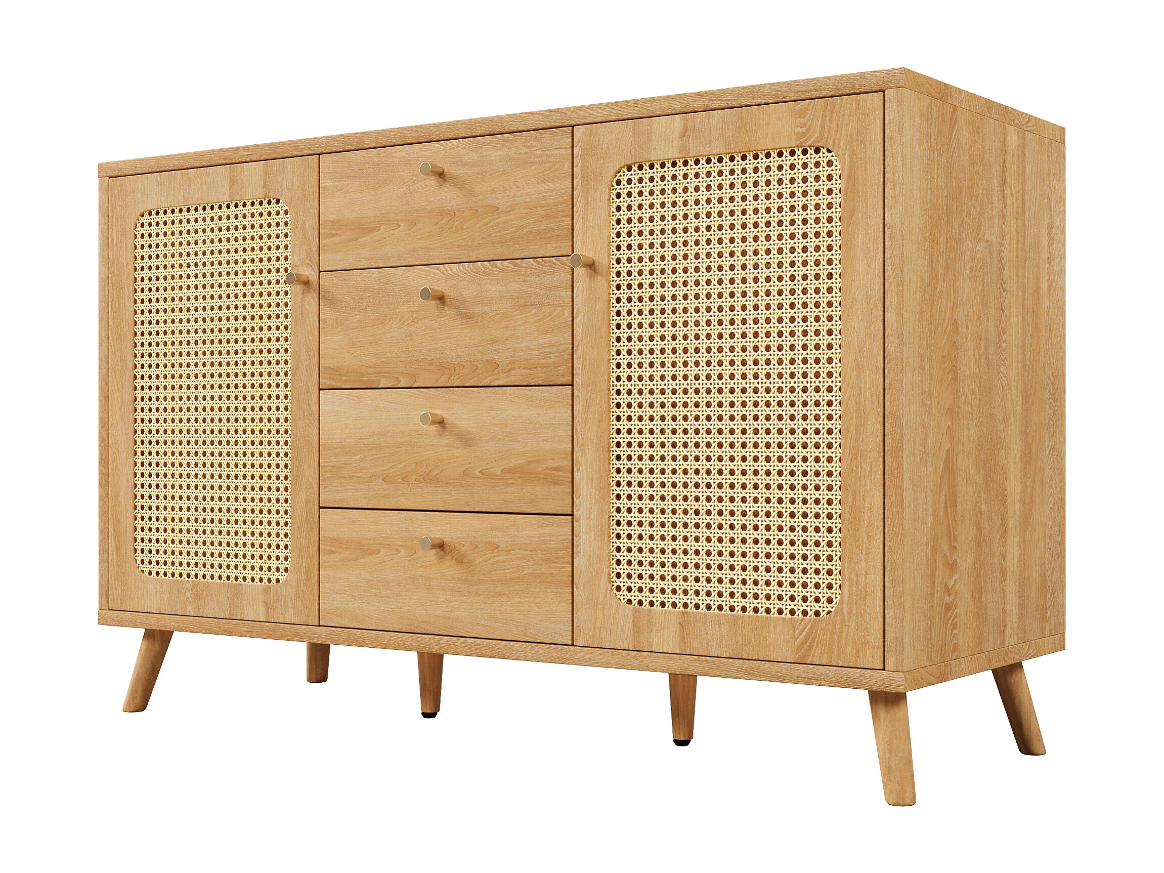 Buffet aspect rotin avec 4 tiroirs et 2 portes 140x40x86 cm - Naturel clair