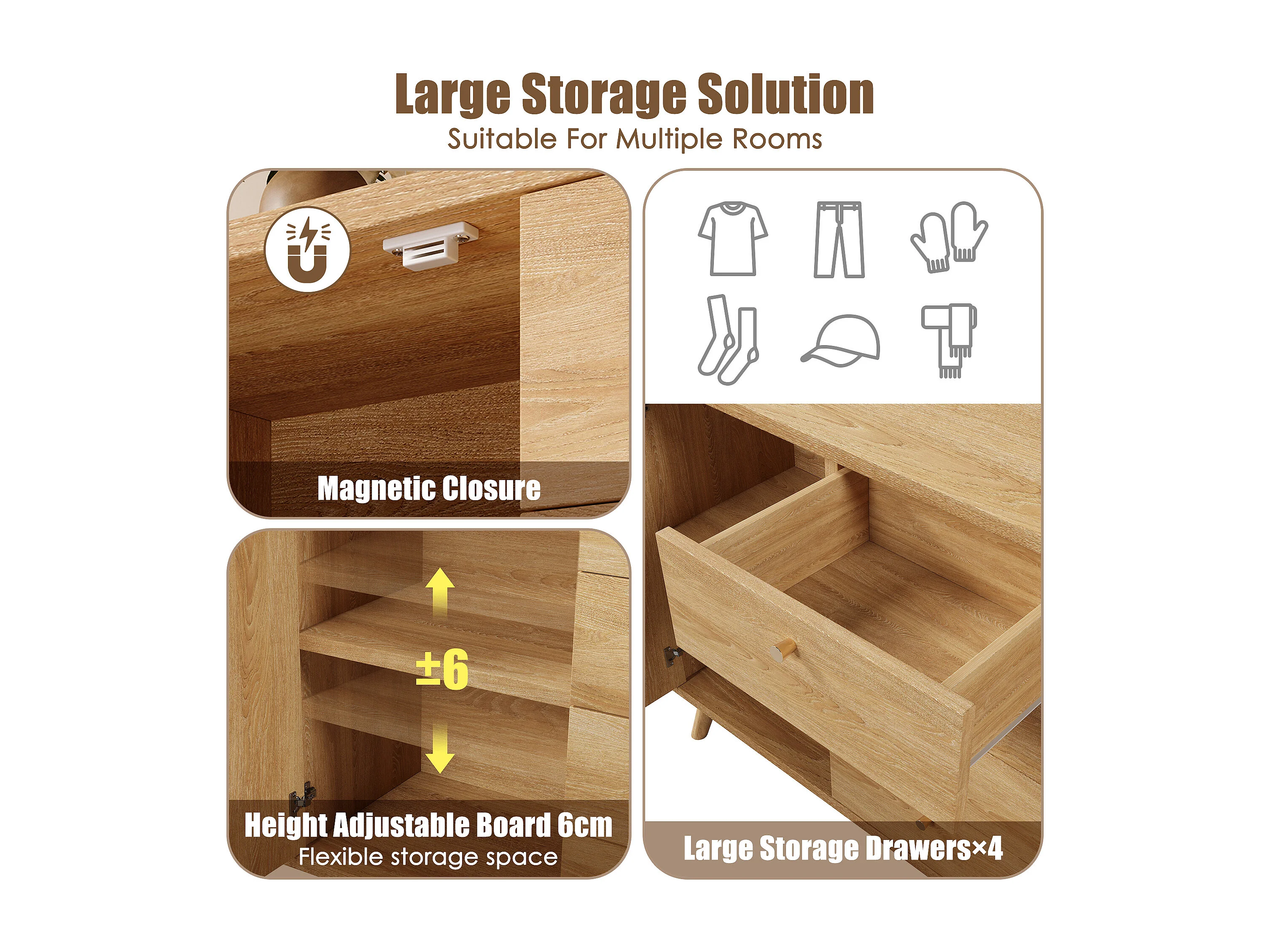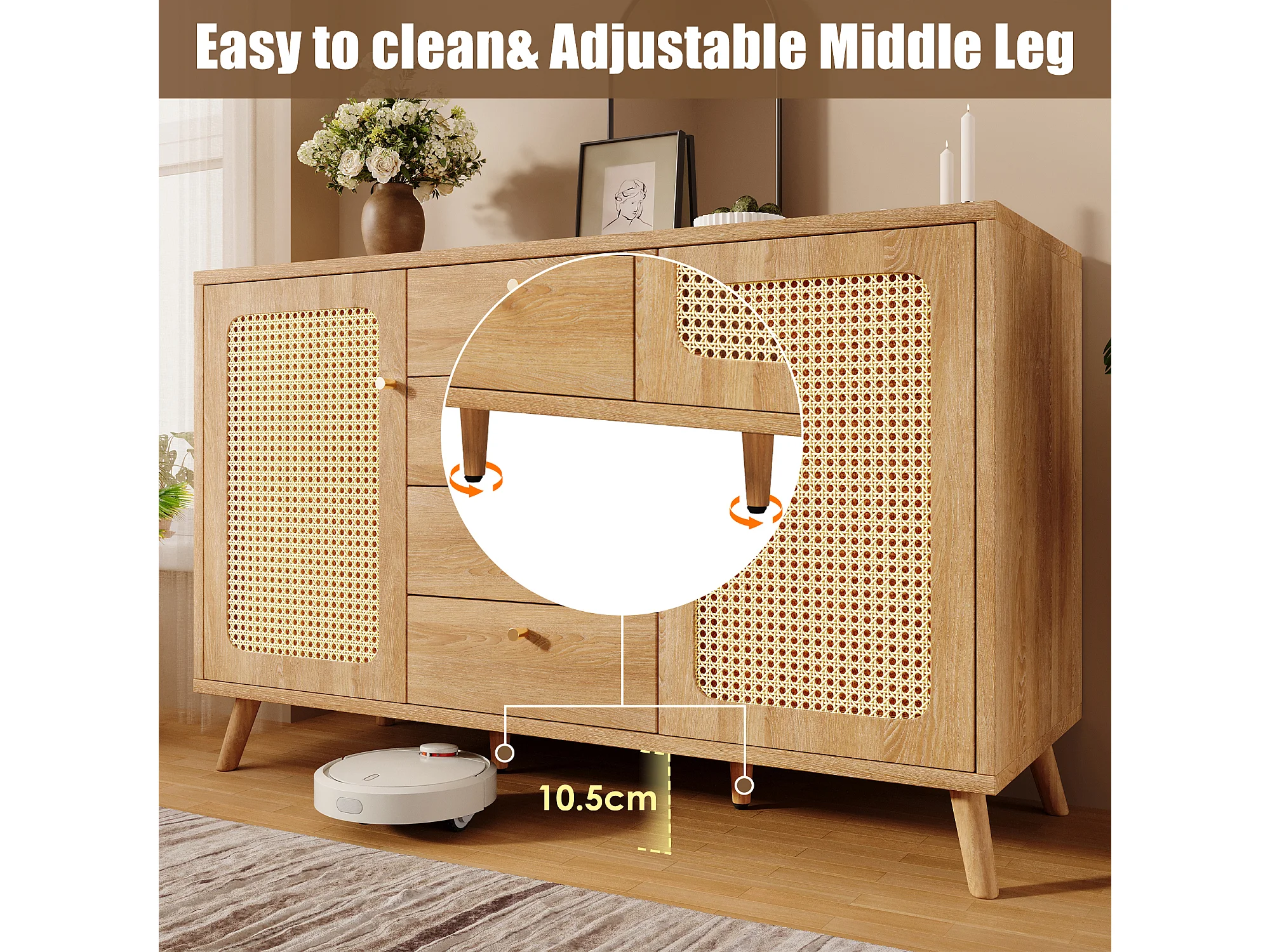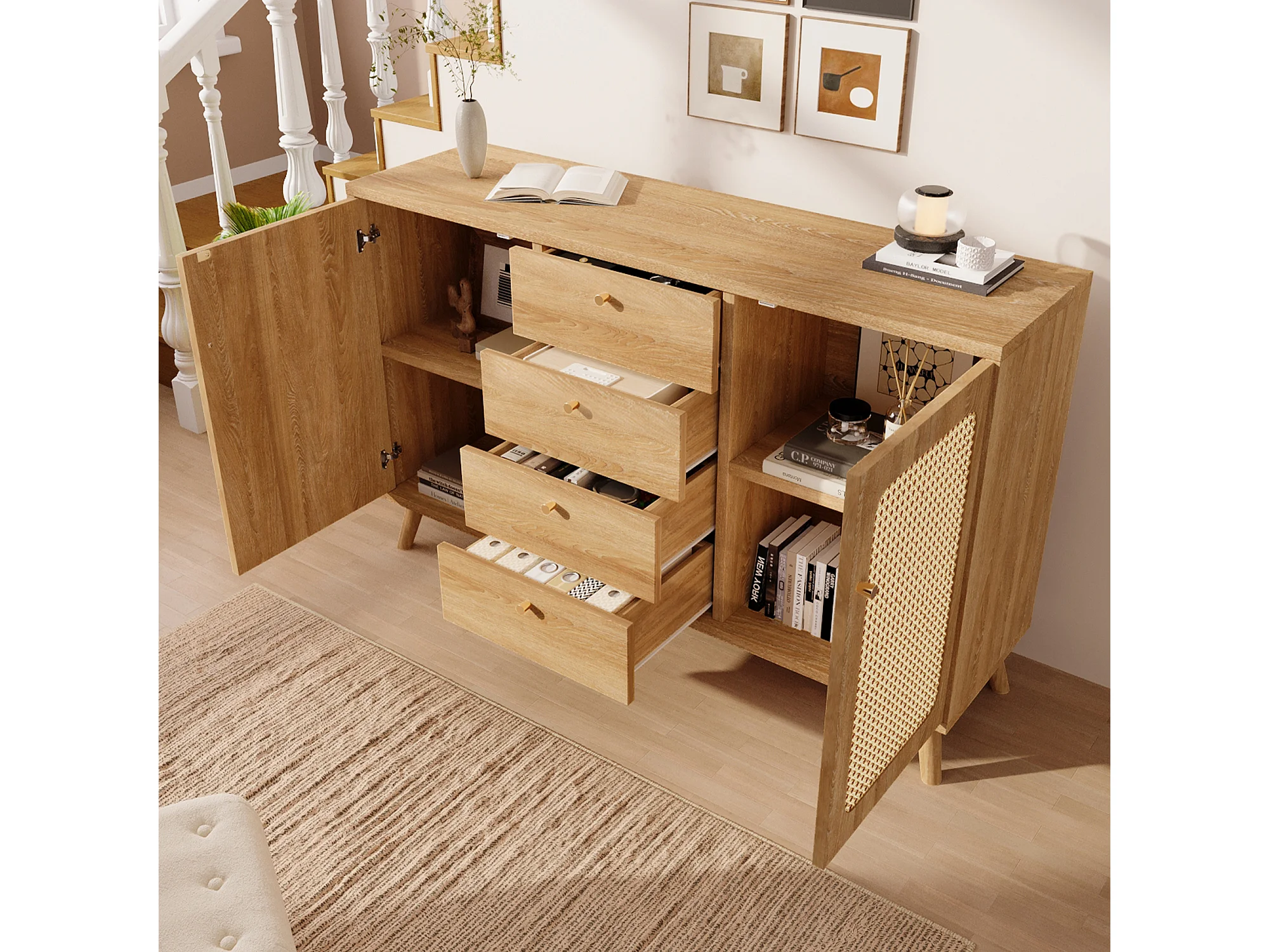 Buffet aspect rotin avec 4 tiroirs et 2 portes 140x40x86 cm - Naturel clair
