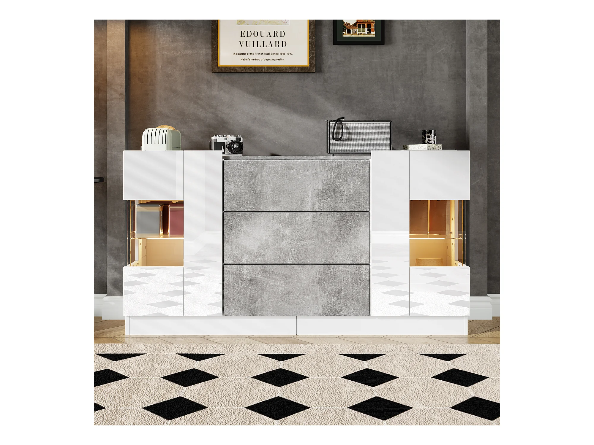 Buffet moderne avec 6 tiroirs, LED et plateau en verre trempé, design laqué blanc (140x35x70 cm)