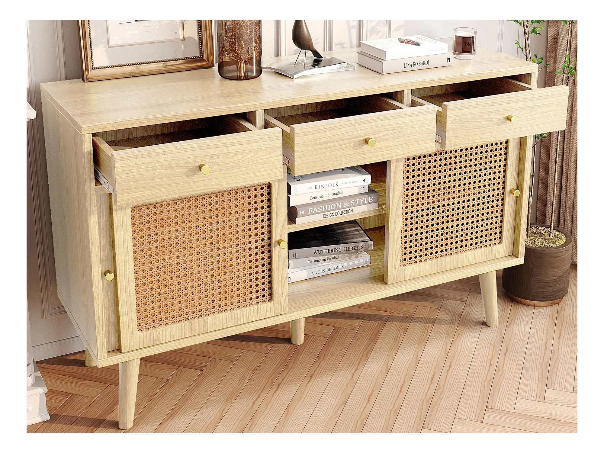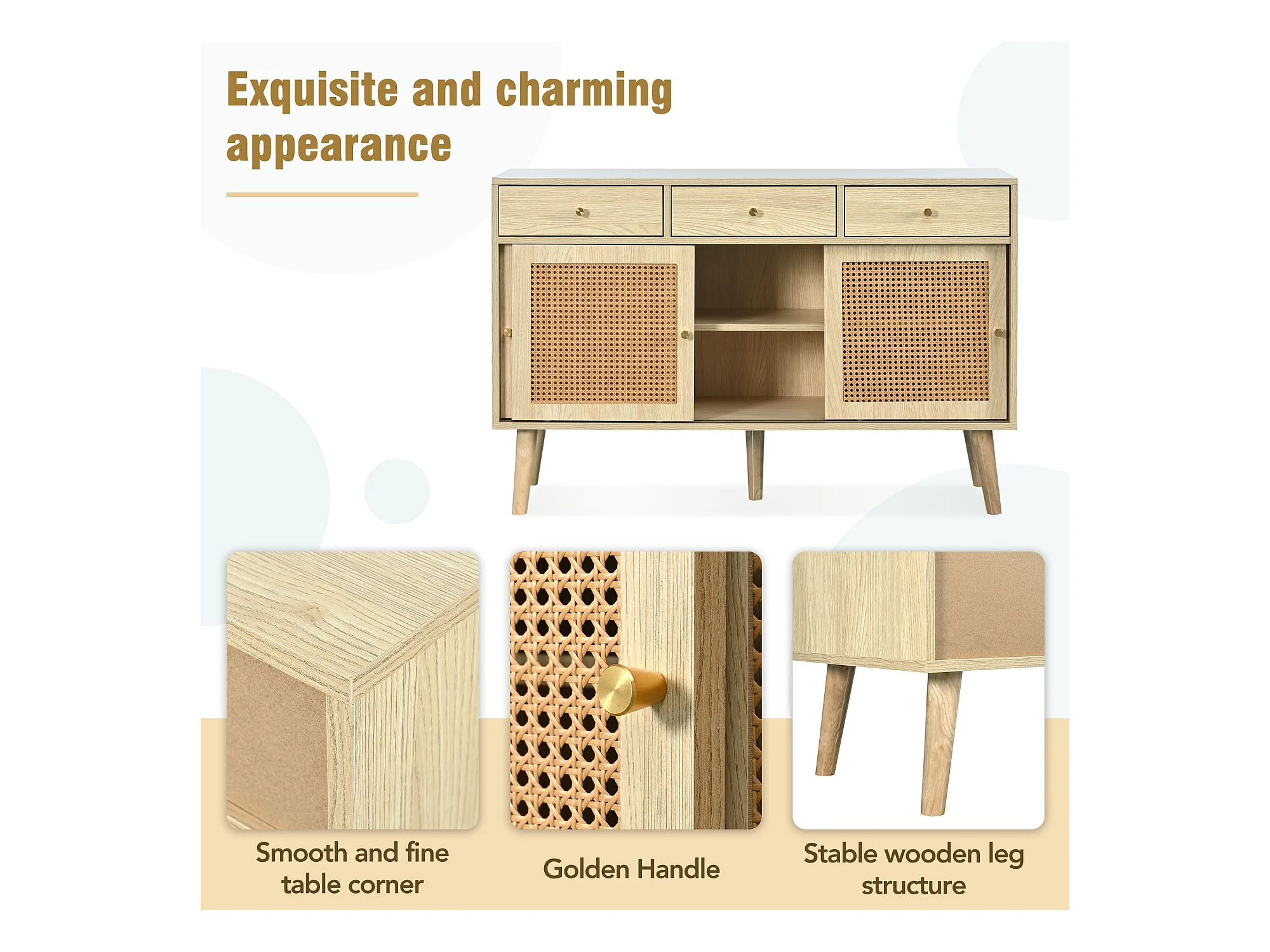Buffet avec 3 portes coulissantes et 3 tiroirs en MDF - effet rotin - coloris naturel
