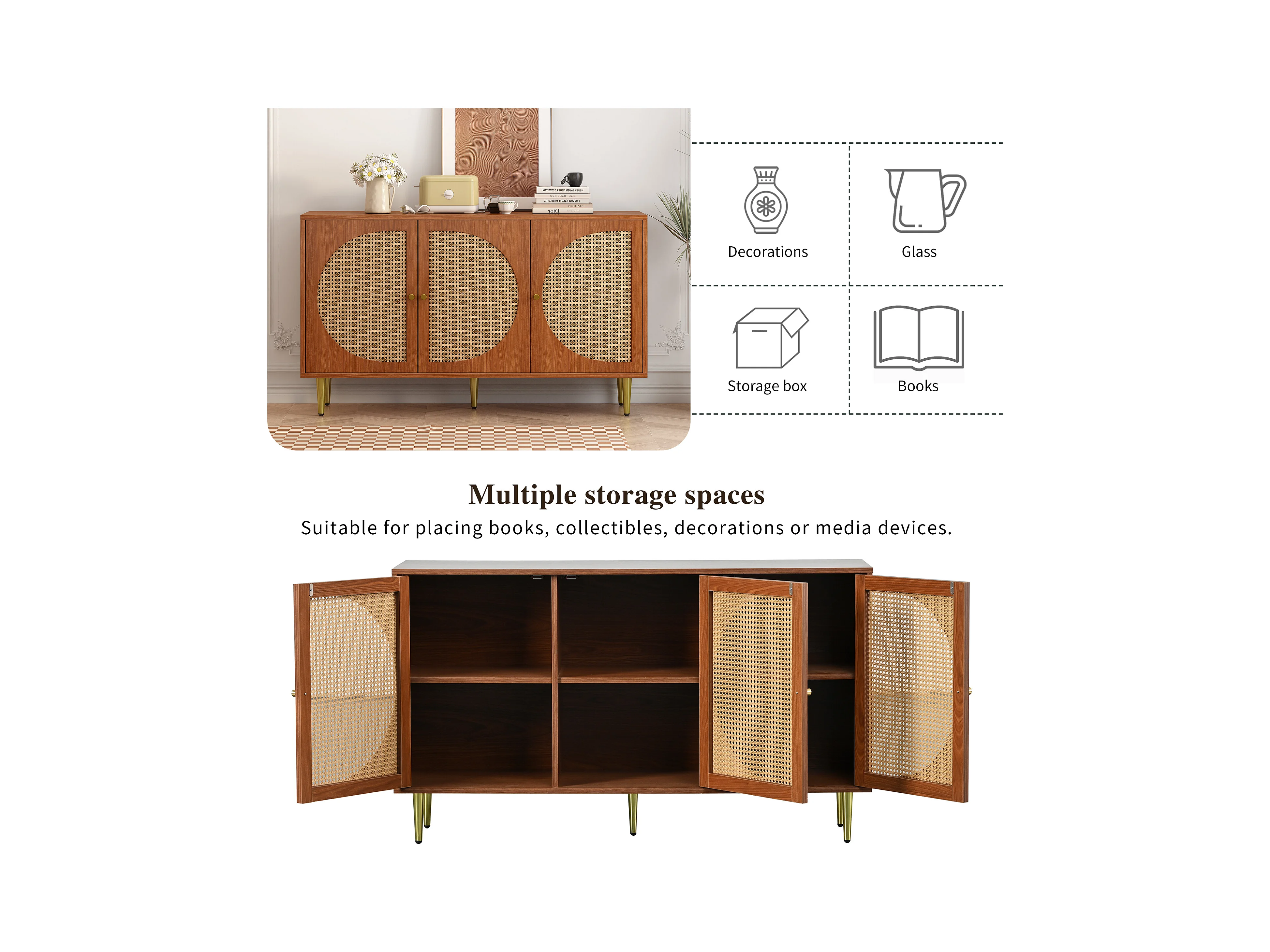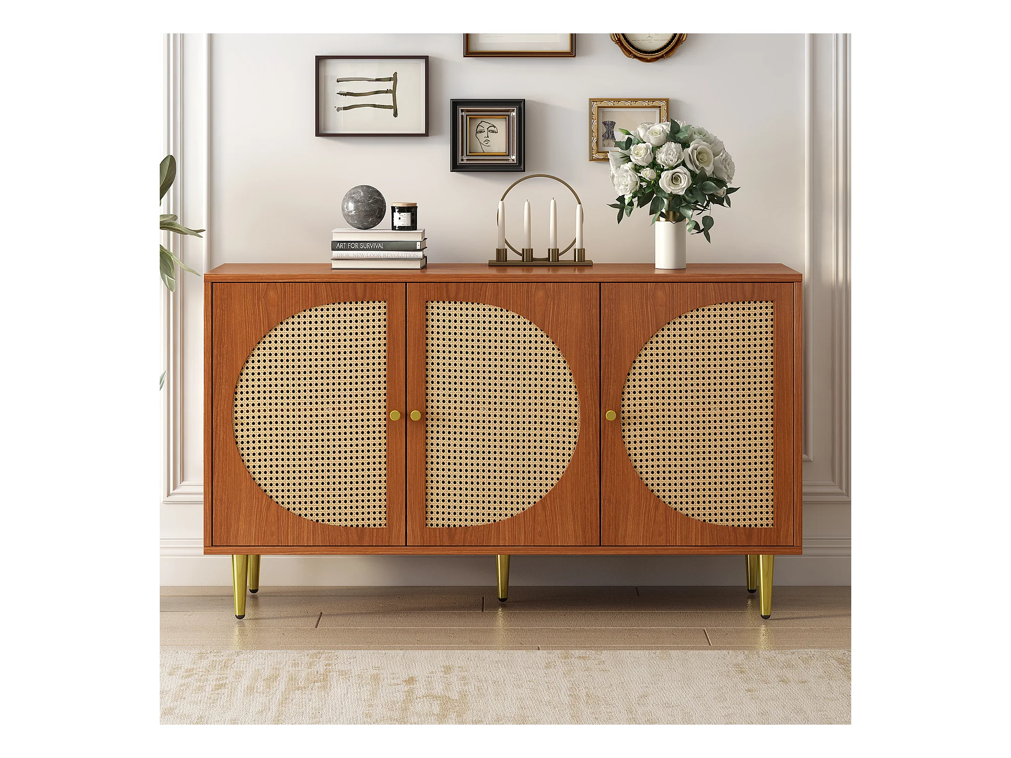 Buffet avec 3 portes en rotin, meuble de rangement, avec poignées en métal, pour salon, chambre et bureau, noyer (129.8x40x76 cm)