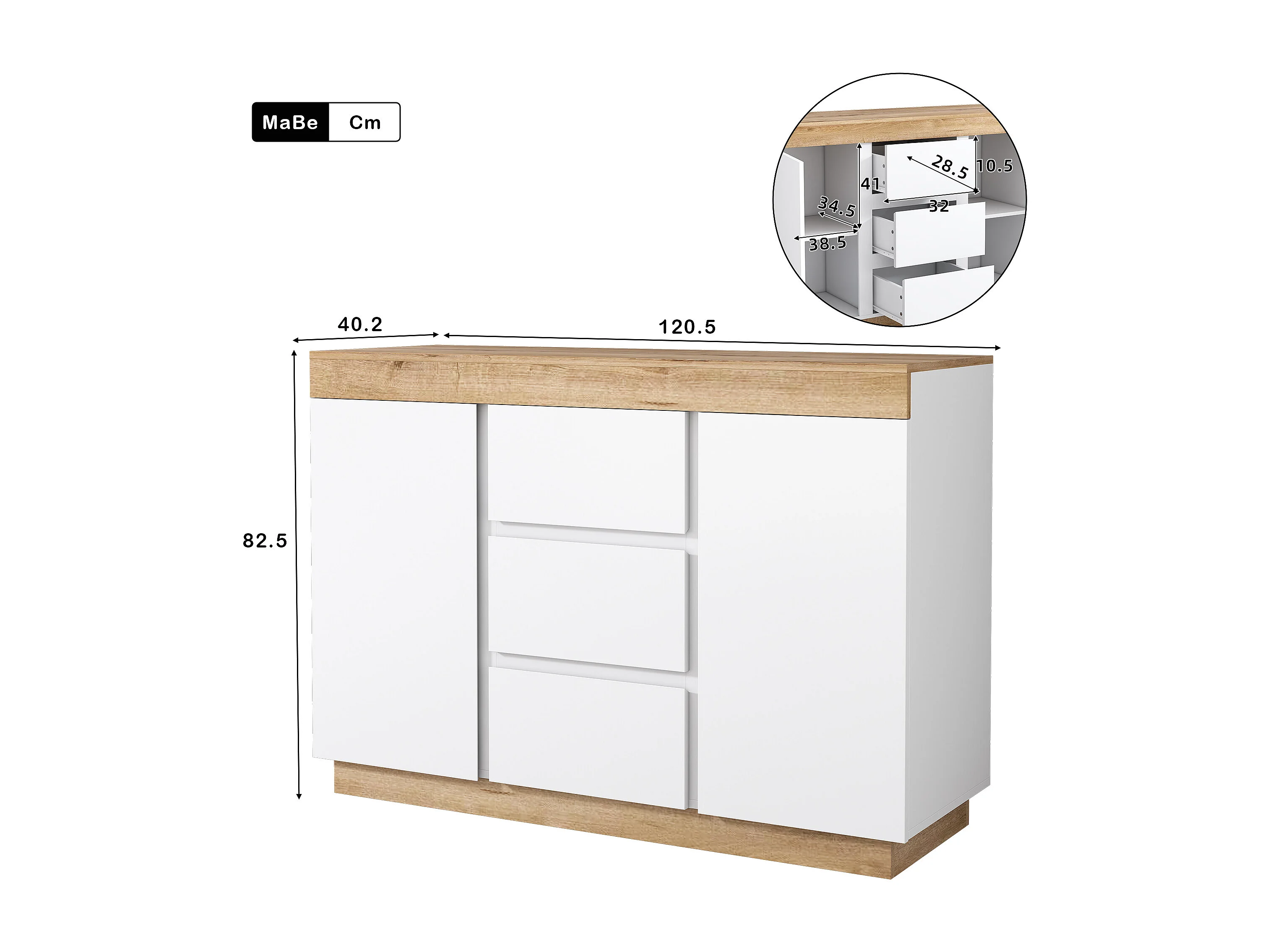 Buffet avec 3 tiroirs et 2 porte - Plateau en couleur bois - Blanc