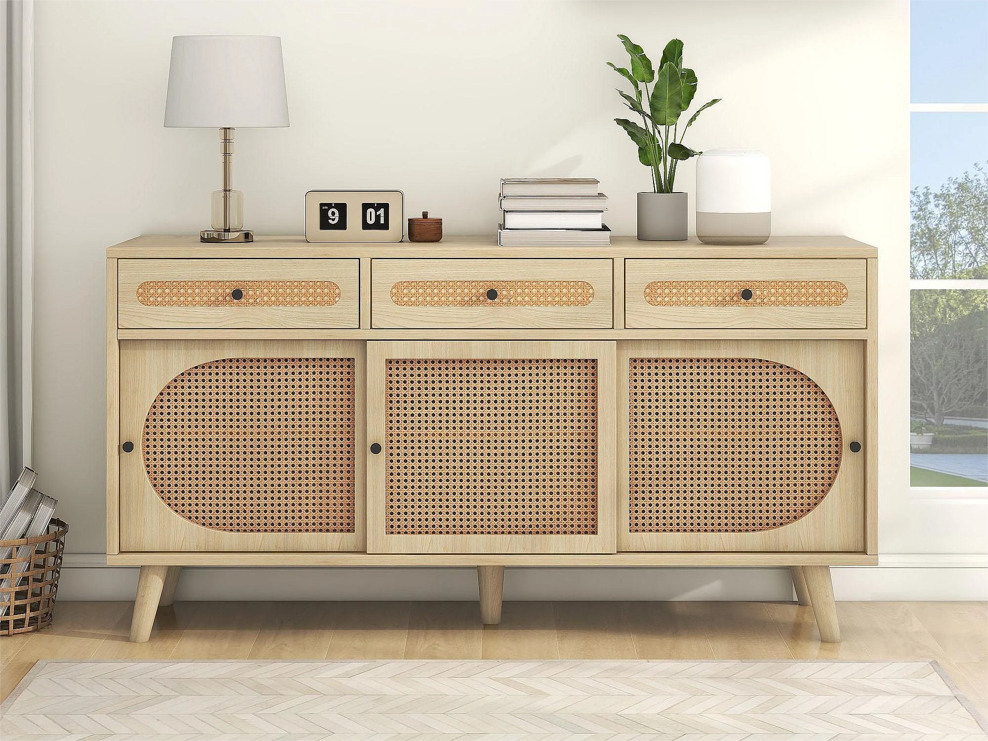 Buffet avec 3 tiroirs et 3 portes coulissantes - rotin et panneaux de particules - étagères réglables - coloris chêne