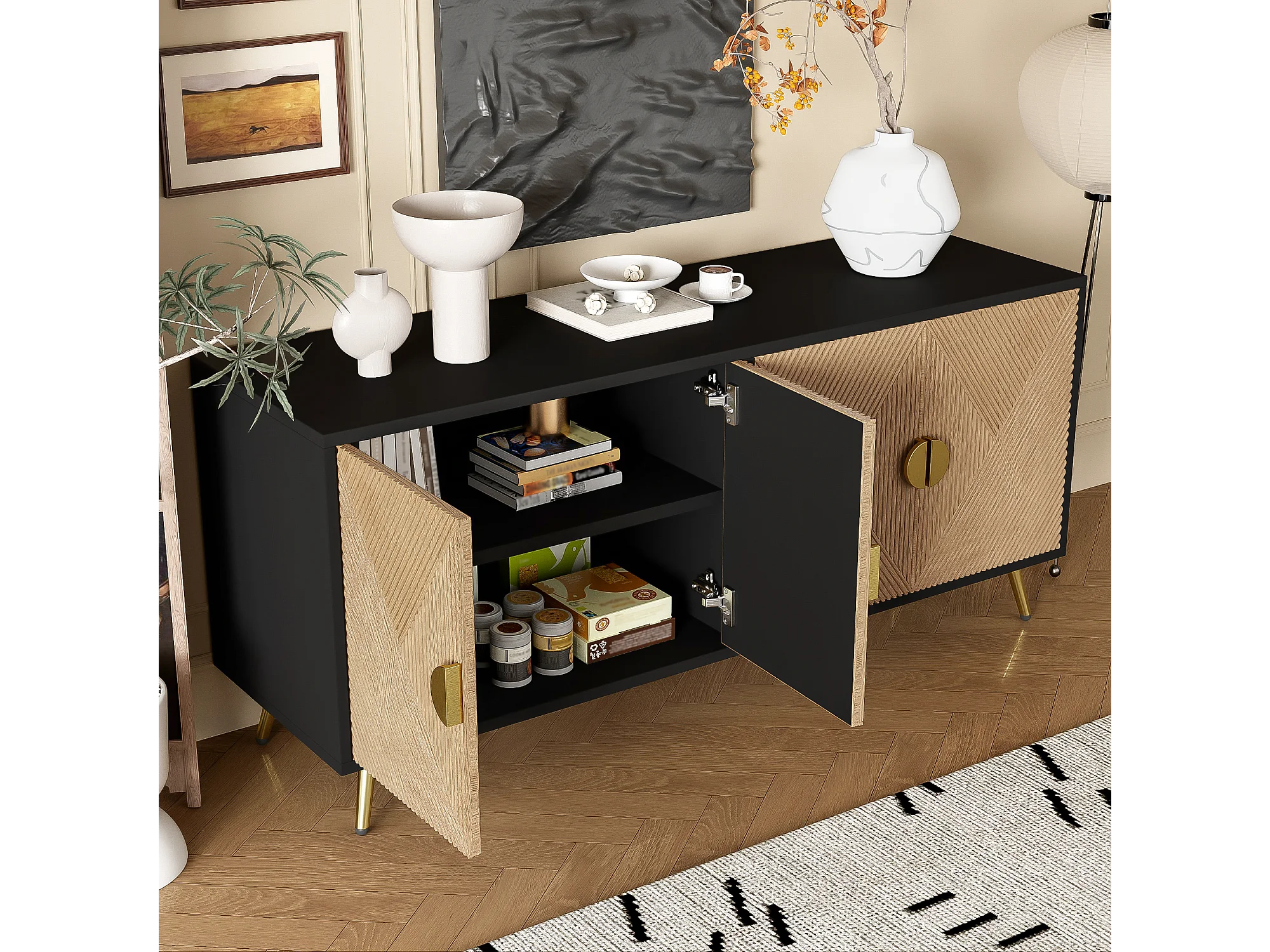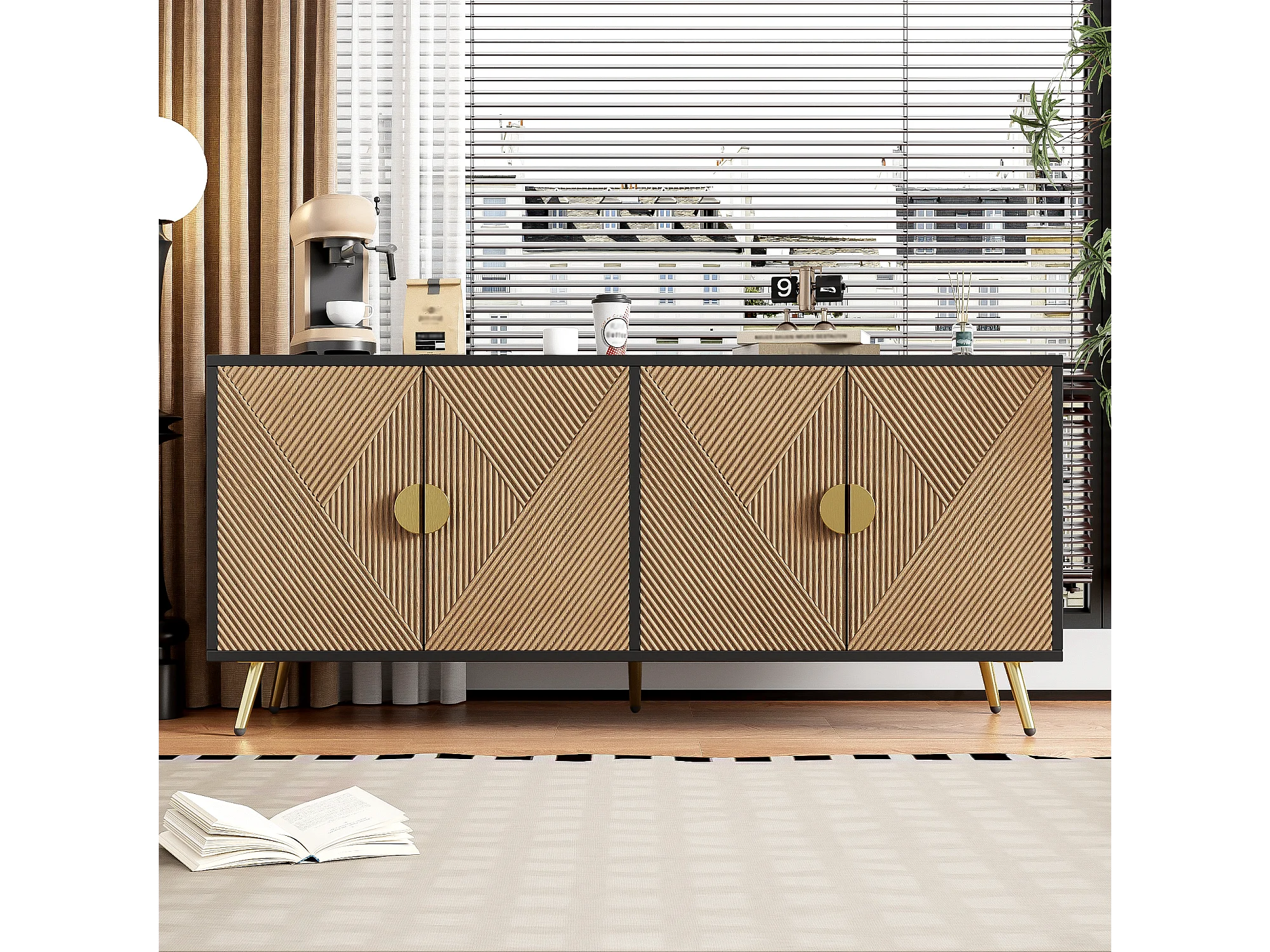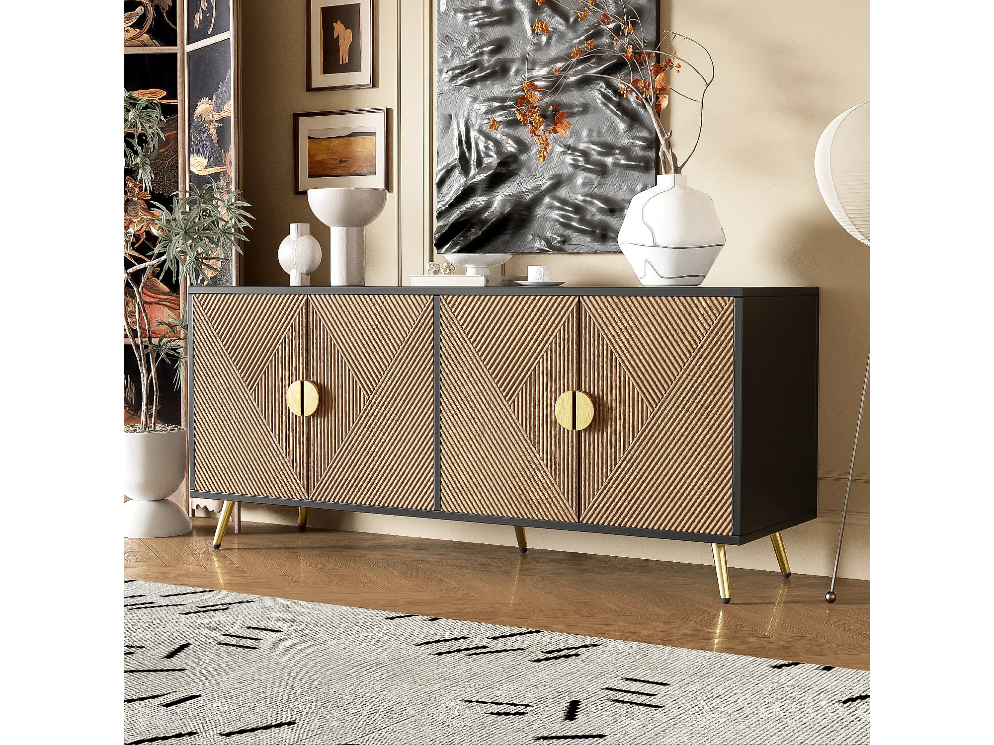 Buffet avec 4 portes, 4 tiroirs, avec éléments dorés, MDF, noir et bois, (160x40x75 cm)
