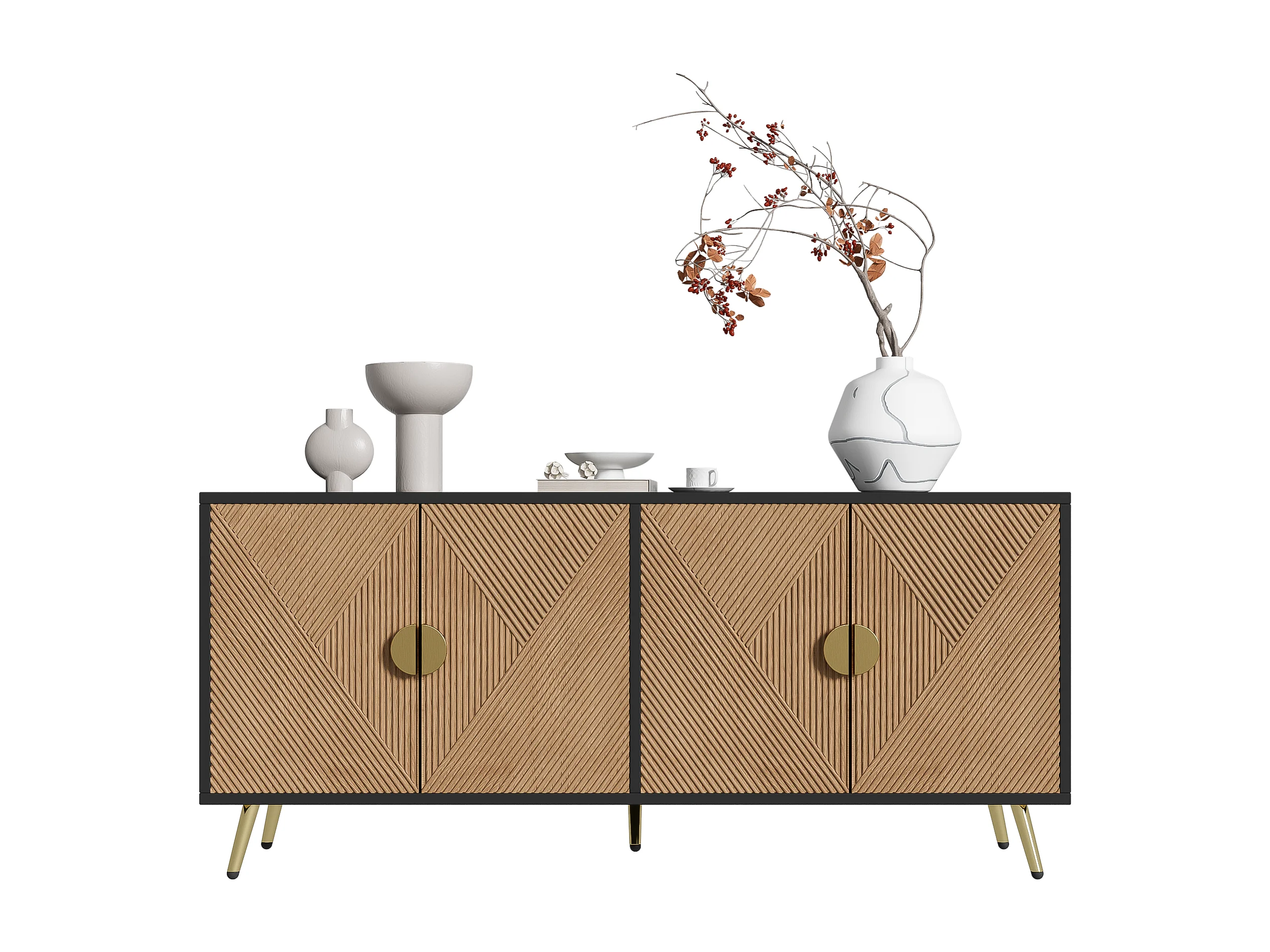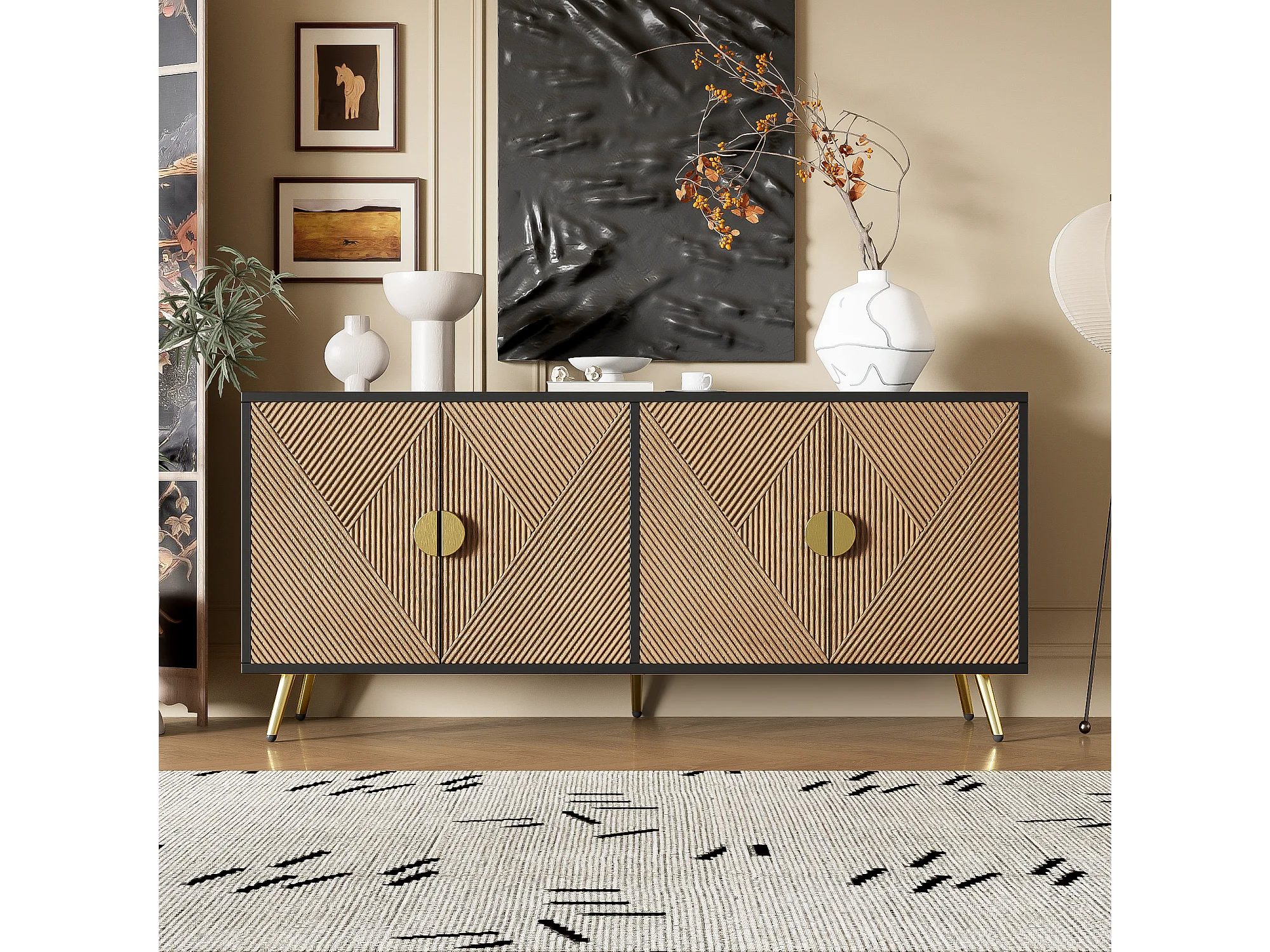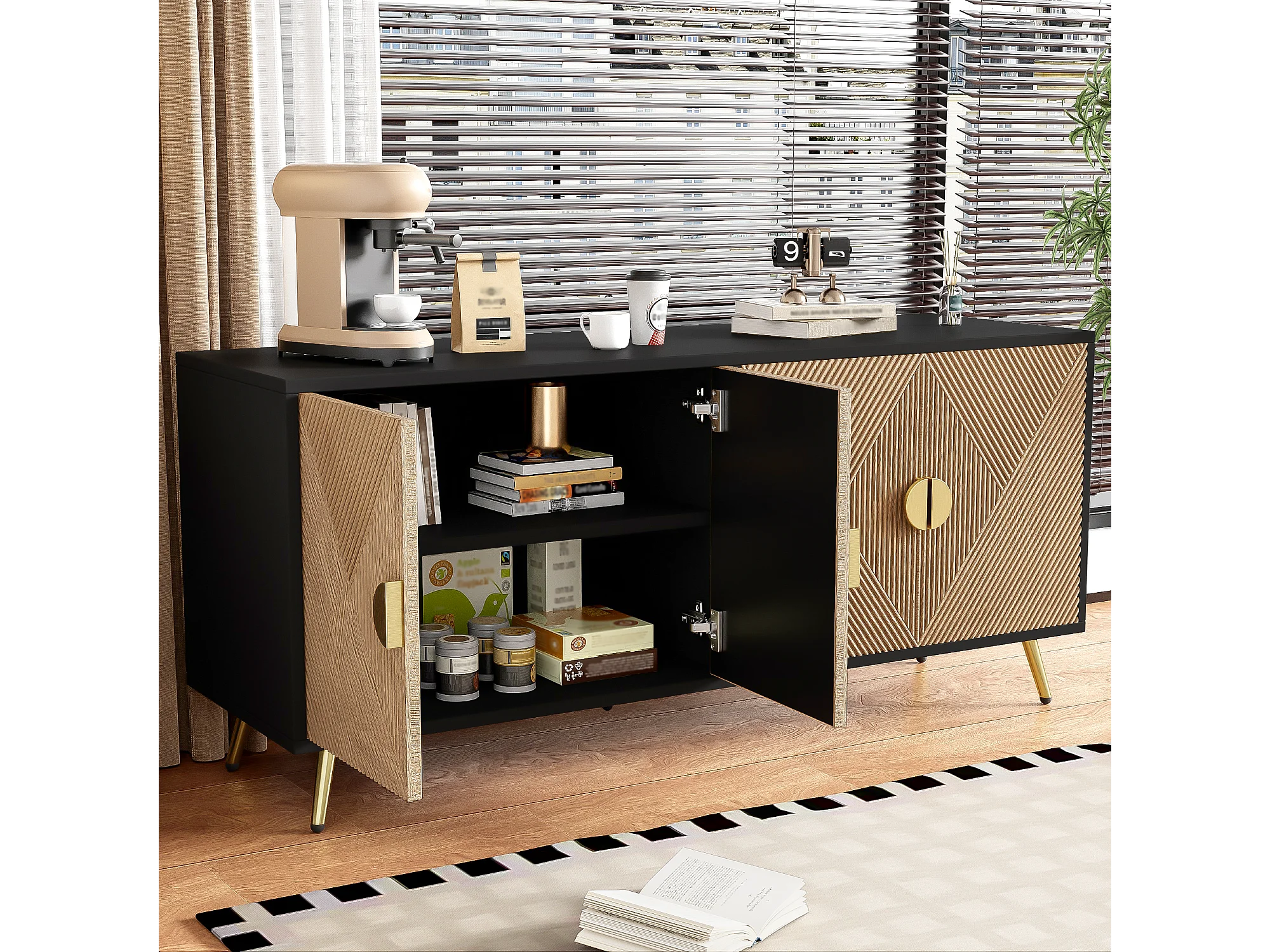 Buffet avec 4 portes, 4 tiroirs, avec éléments dorés, MDF, noir et bois, (160x40x75 cm)