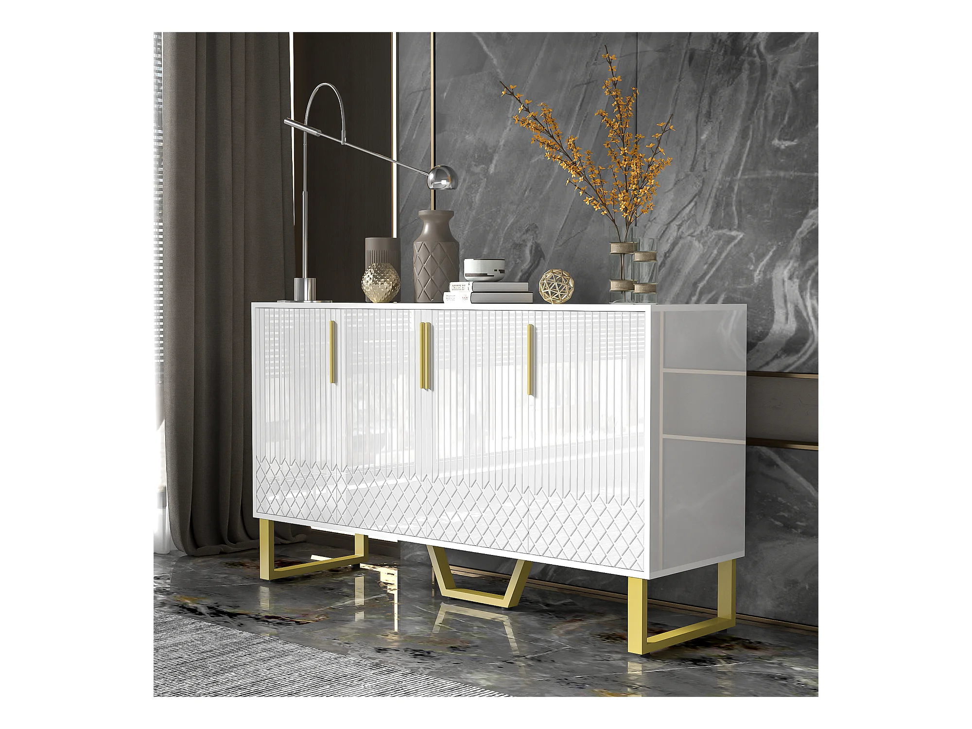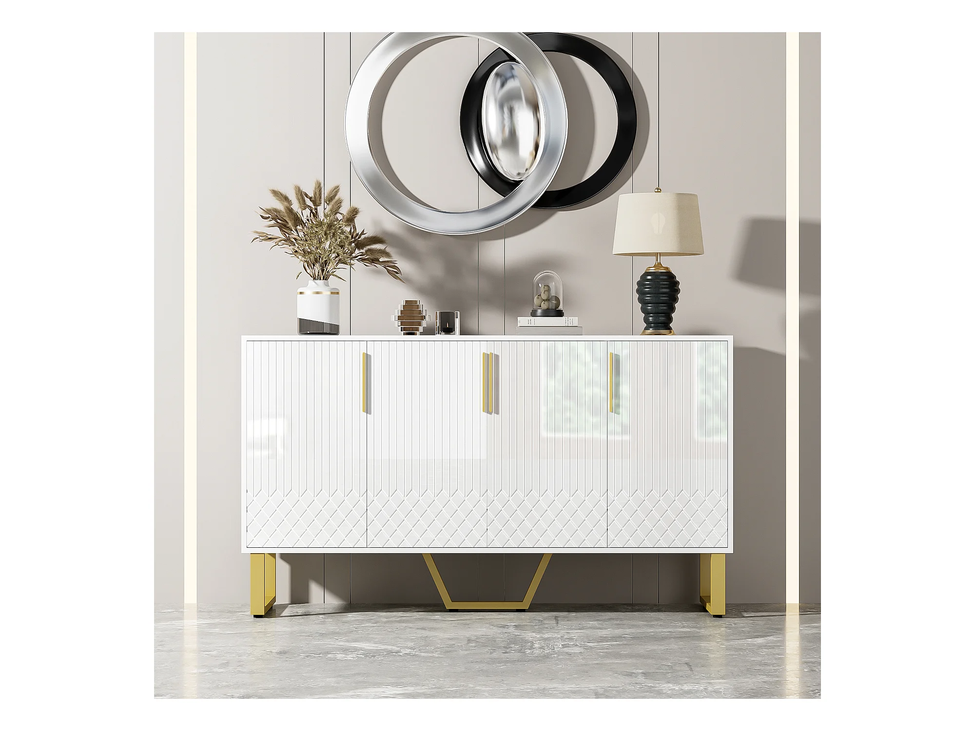 Buffet haut brillant, 4 portes, avec poignées et pieds en métal, design géométrique, MDF, blanc (140x40x80 cm)