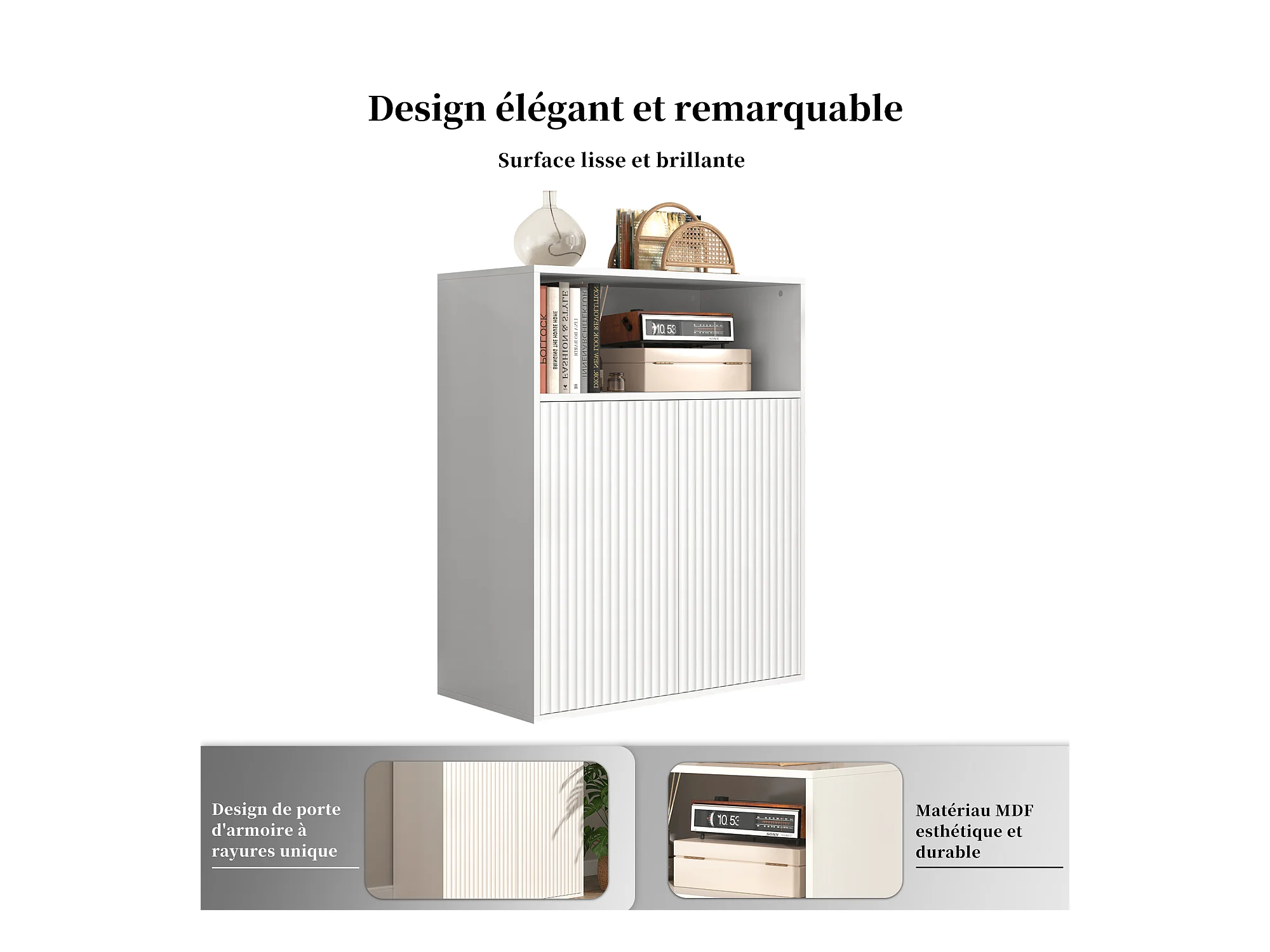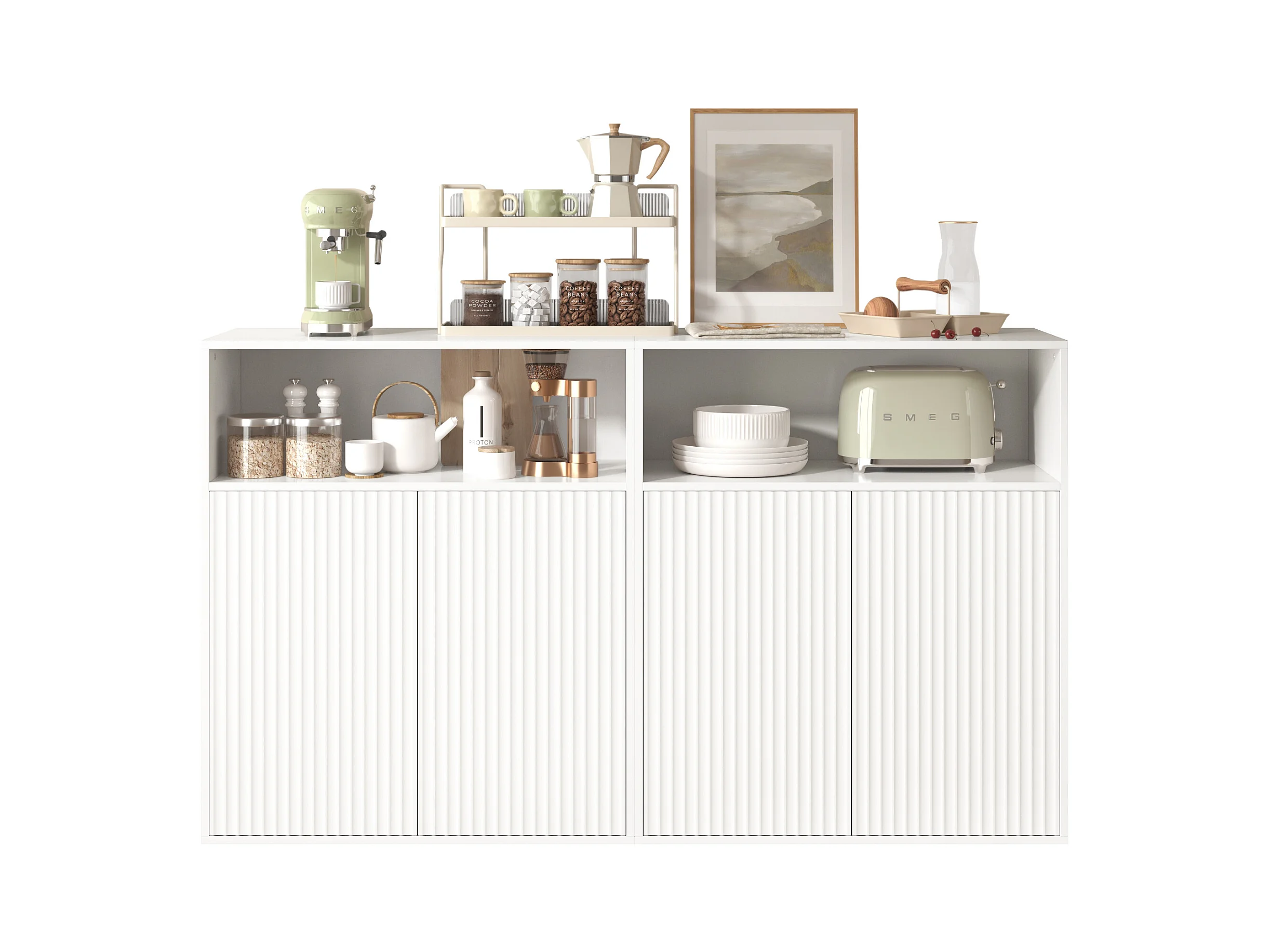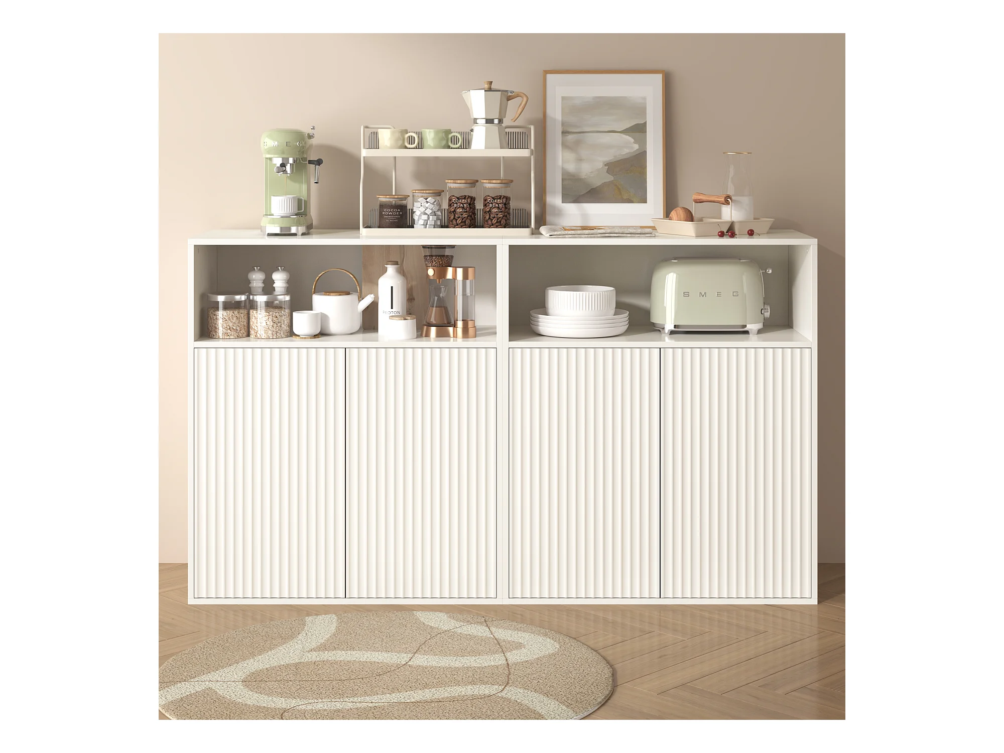 Buffet avec 4 portes magnétiques et 2 niches - 140 x 35 x 90 cm - Bois MDF - Motif rayures verticales - pour salon, cuisine - Blanc