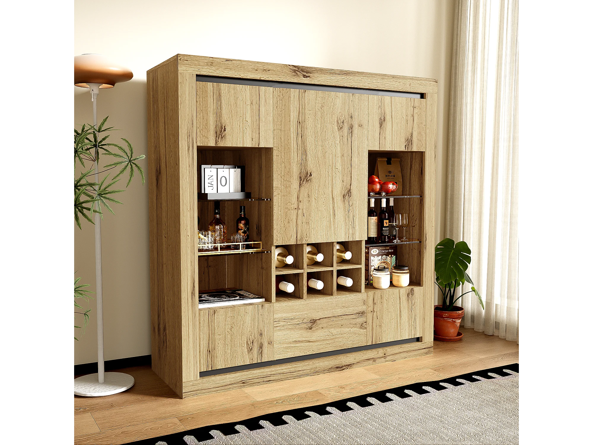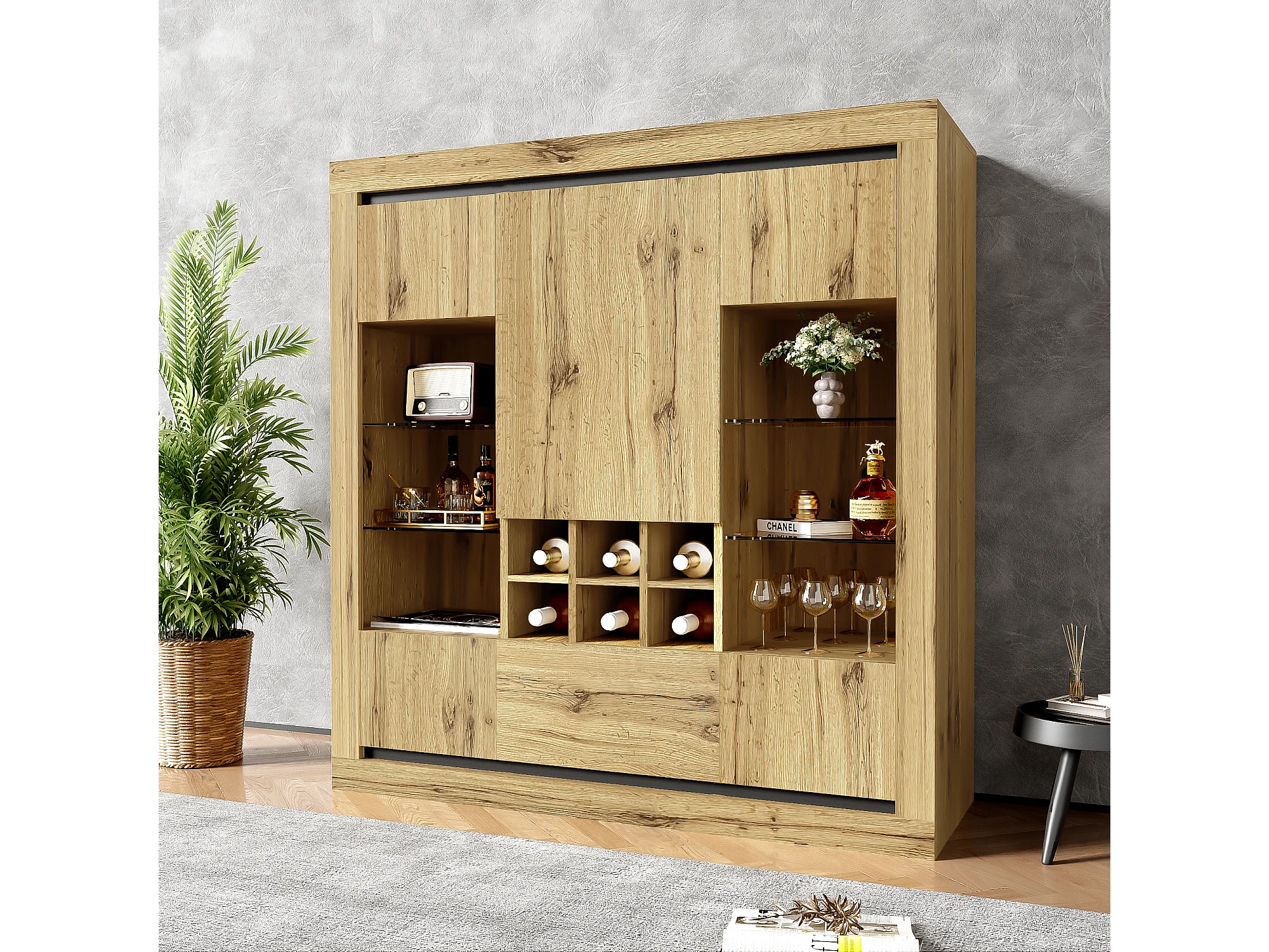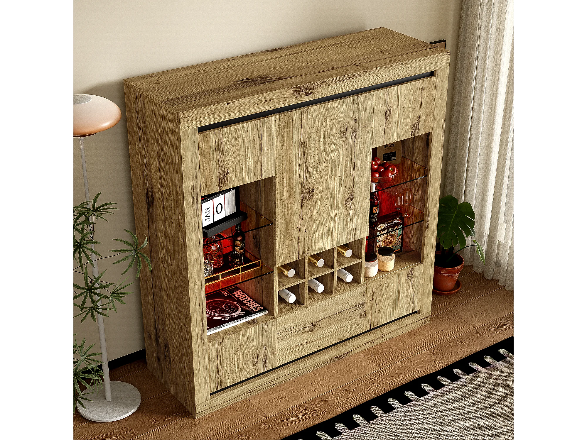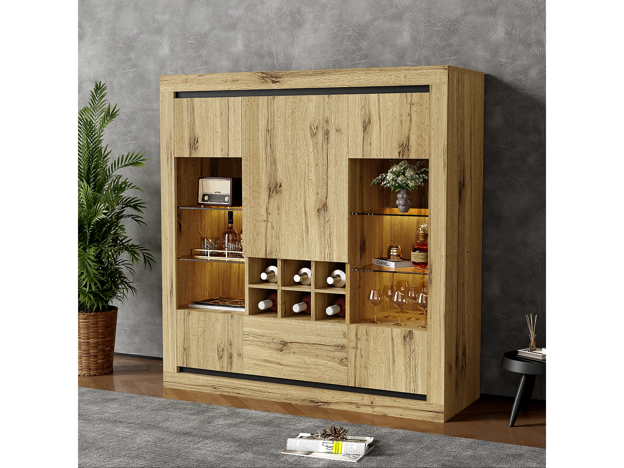 Buffet avec 5 portes, 1 tiroir et casier à vin pour 6 bouteuilles - 110 x 38 x 115 cm - étagères en verre et bois aggloméré - LED - naturel