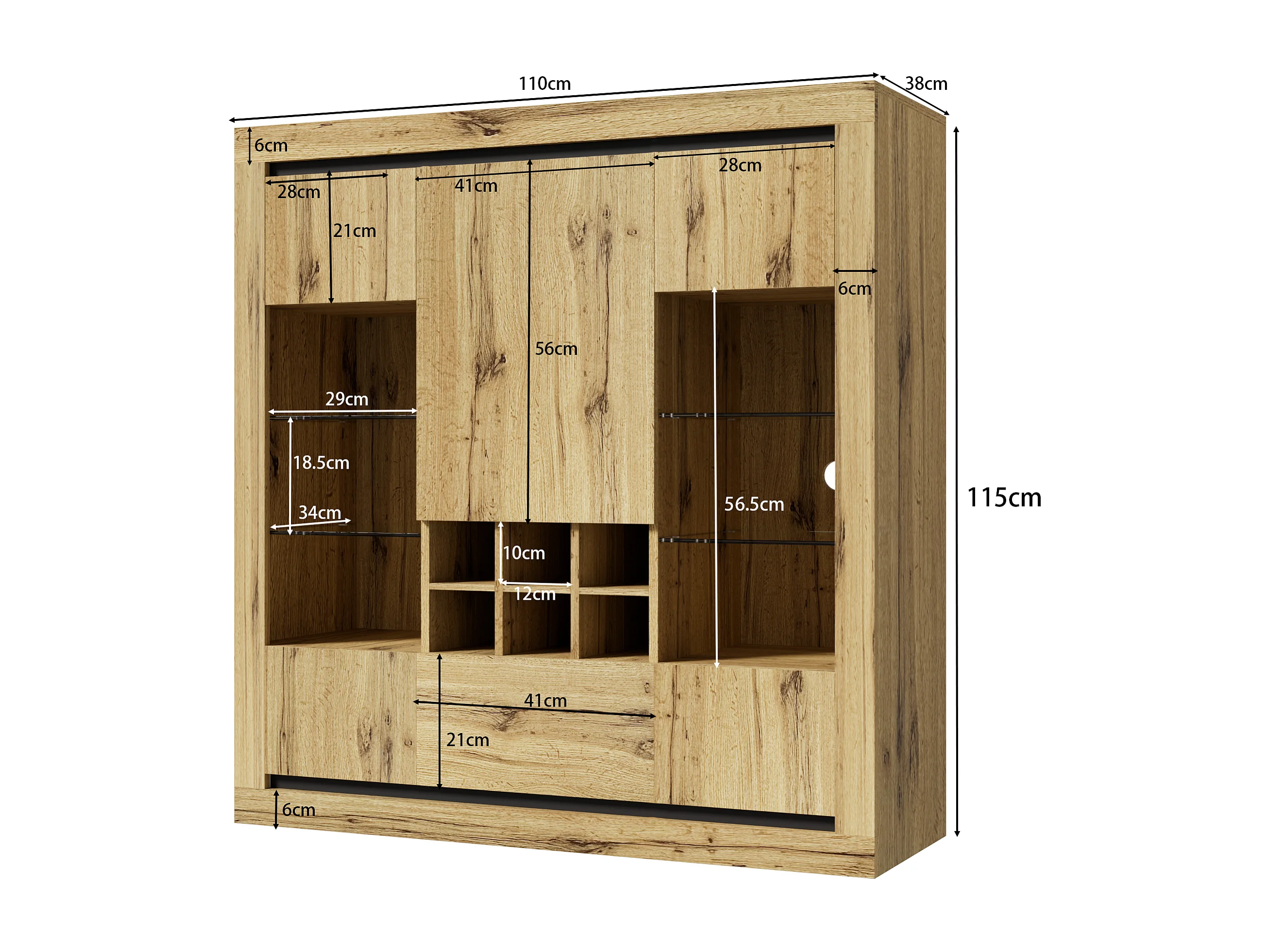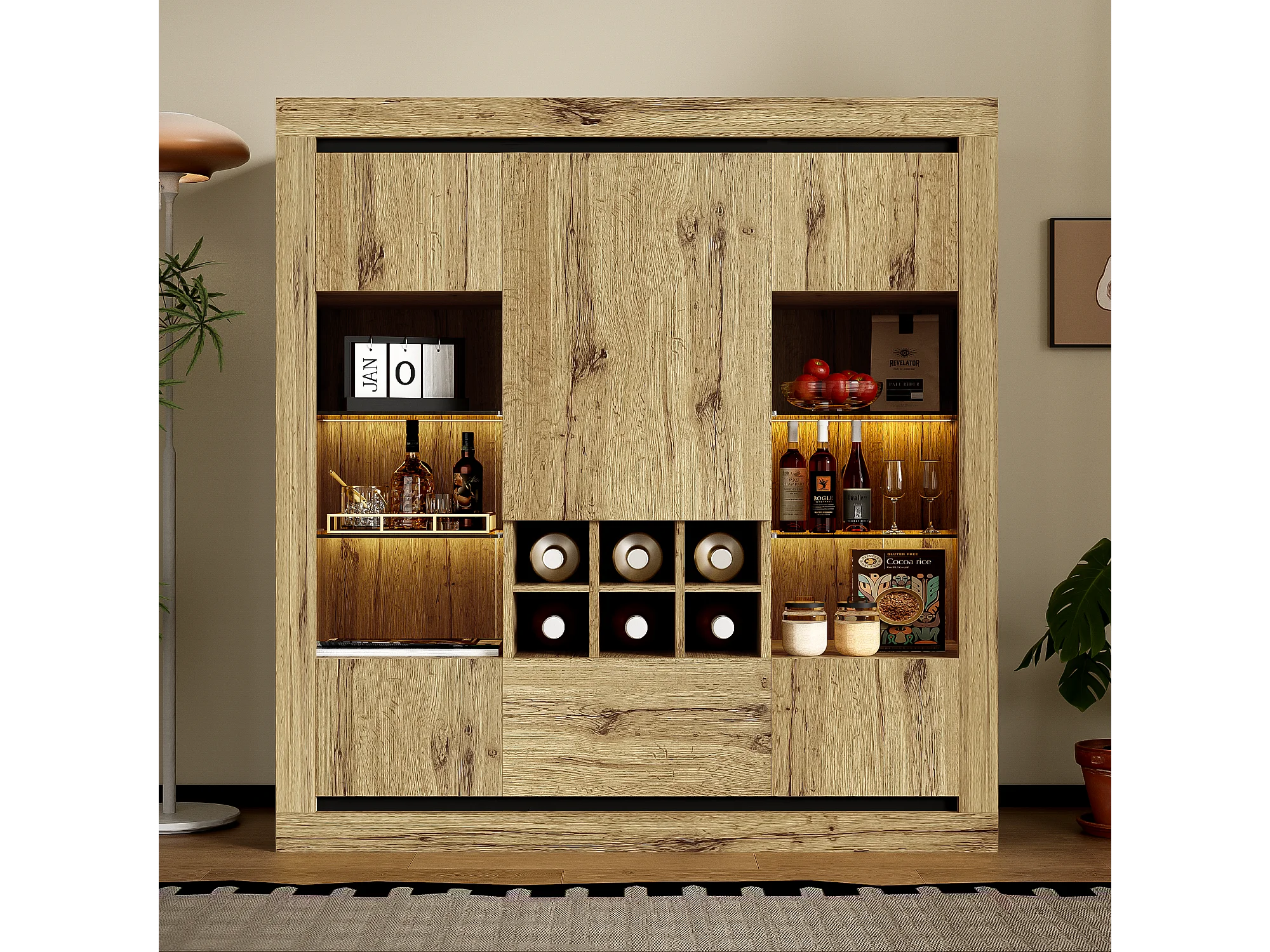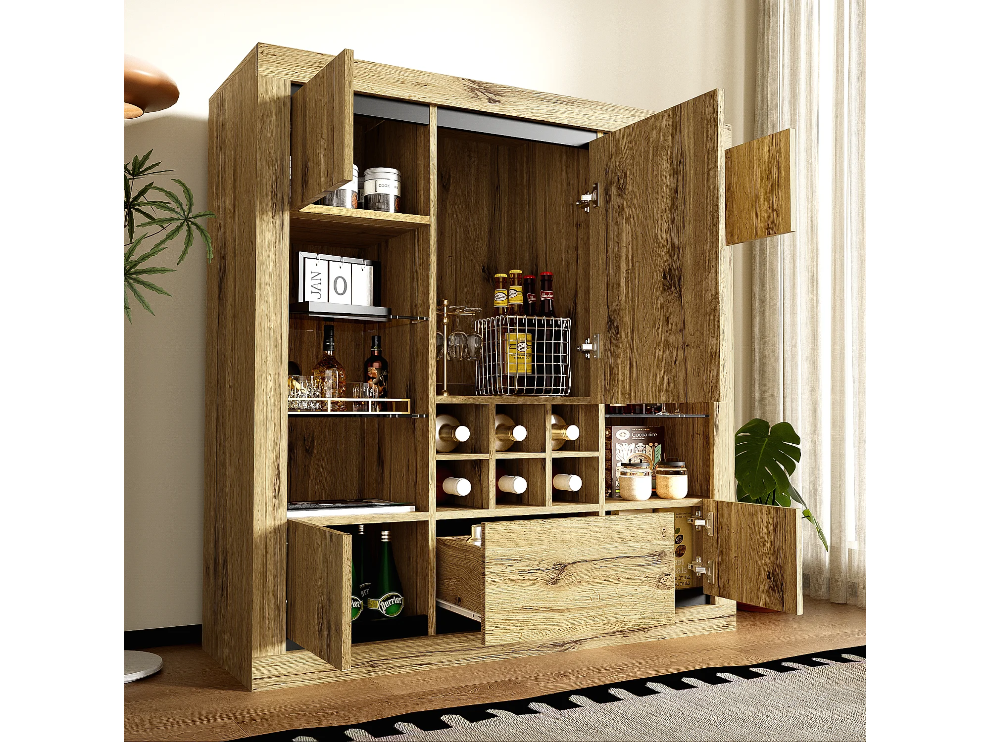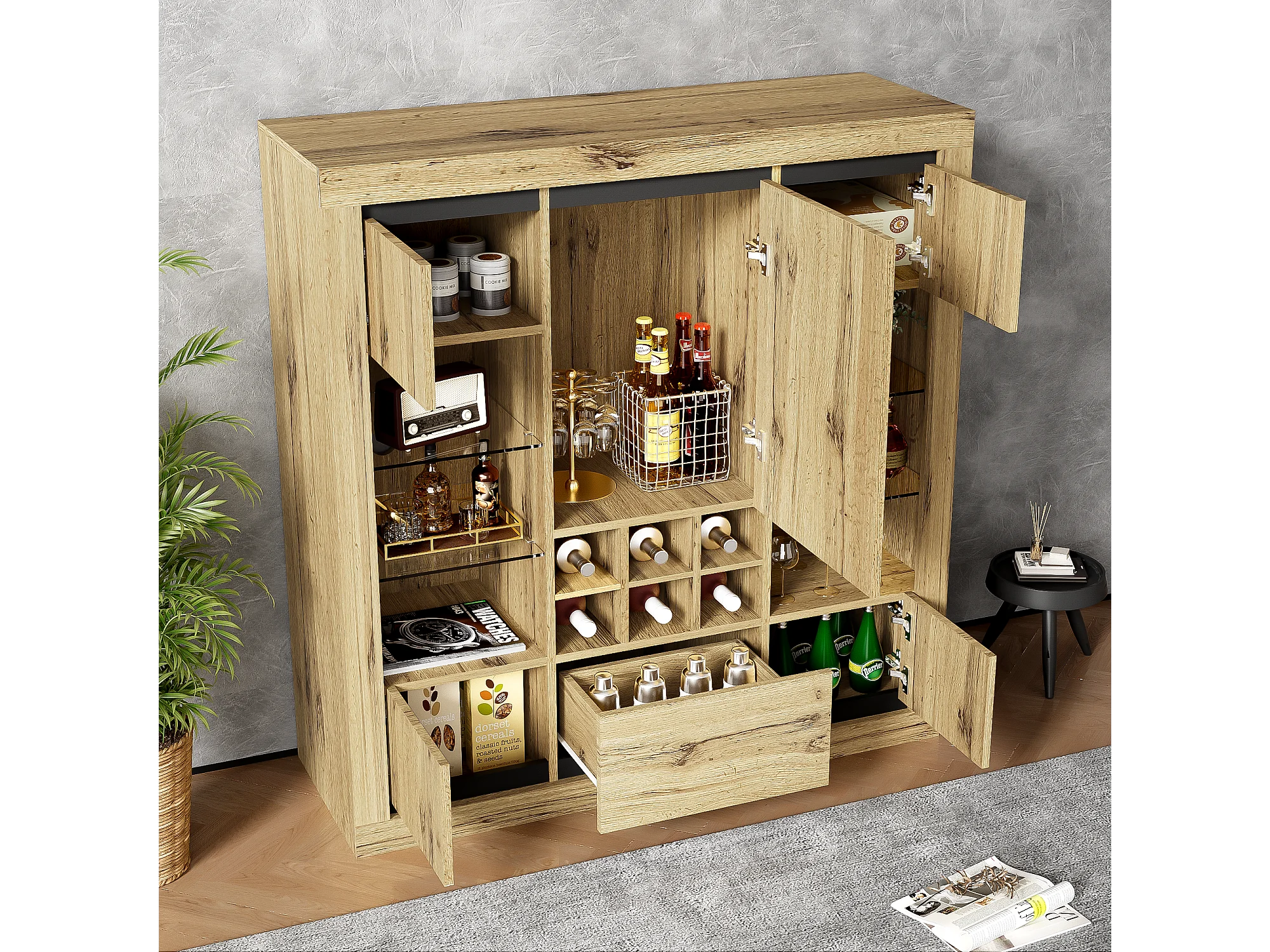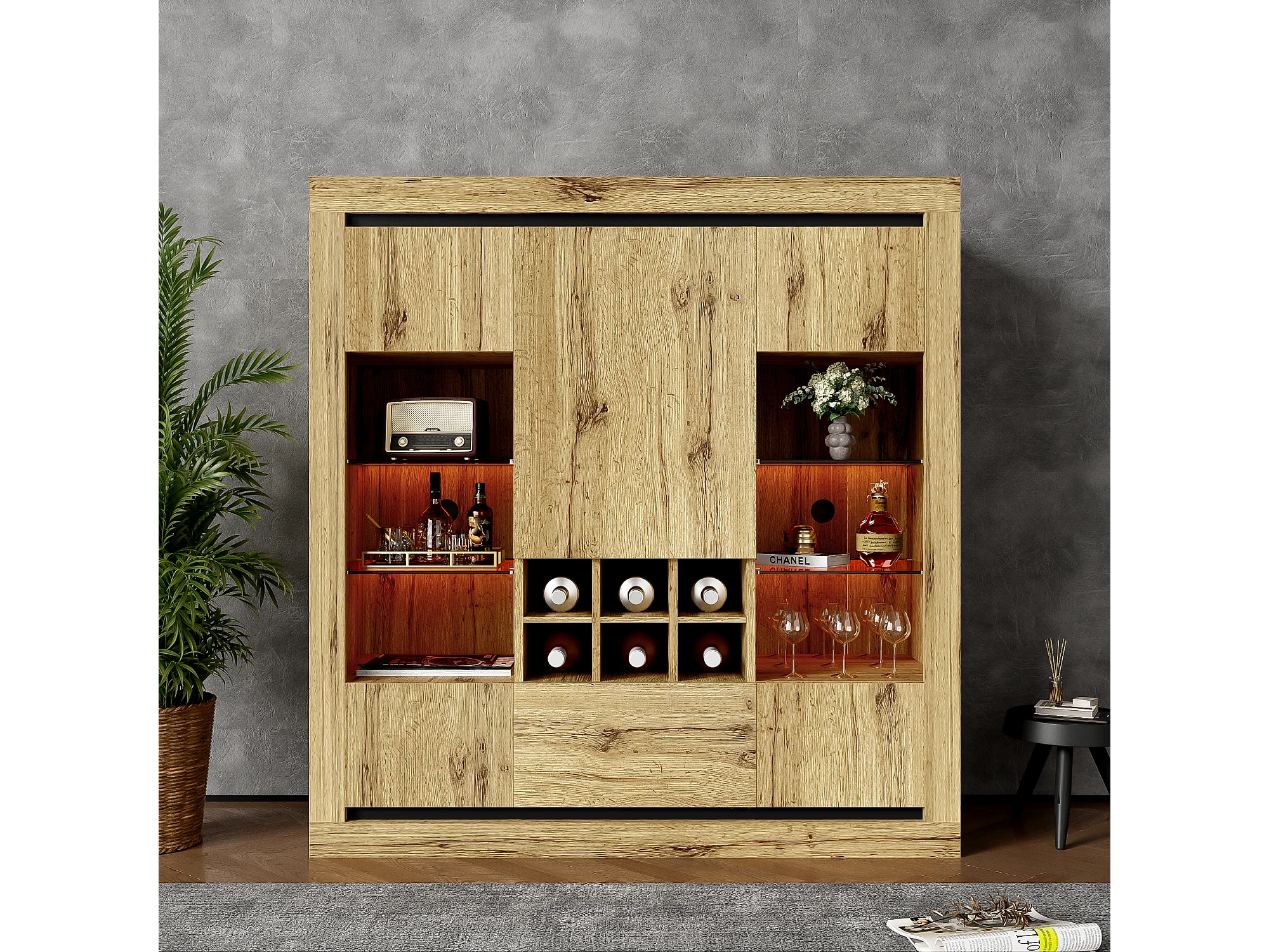 Buffet avec 5 portes, 1 tiroir et casier à vin pour 6 bouteuilles - 110 x 38 x 115 cm - étagères en verre et bois aggloméré - LED - naturel