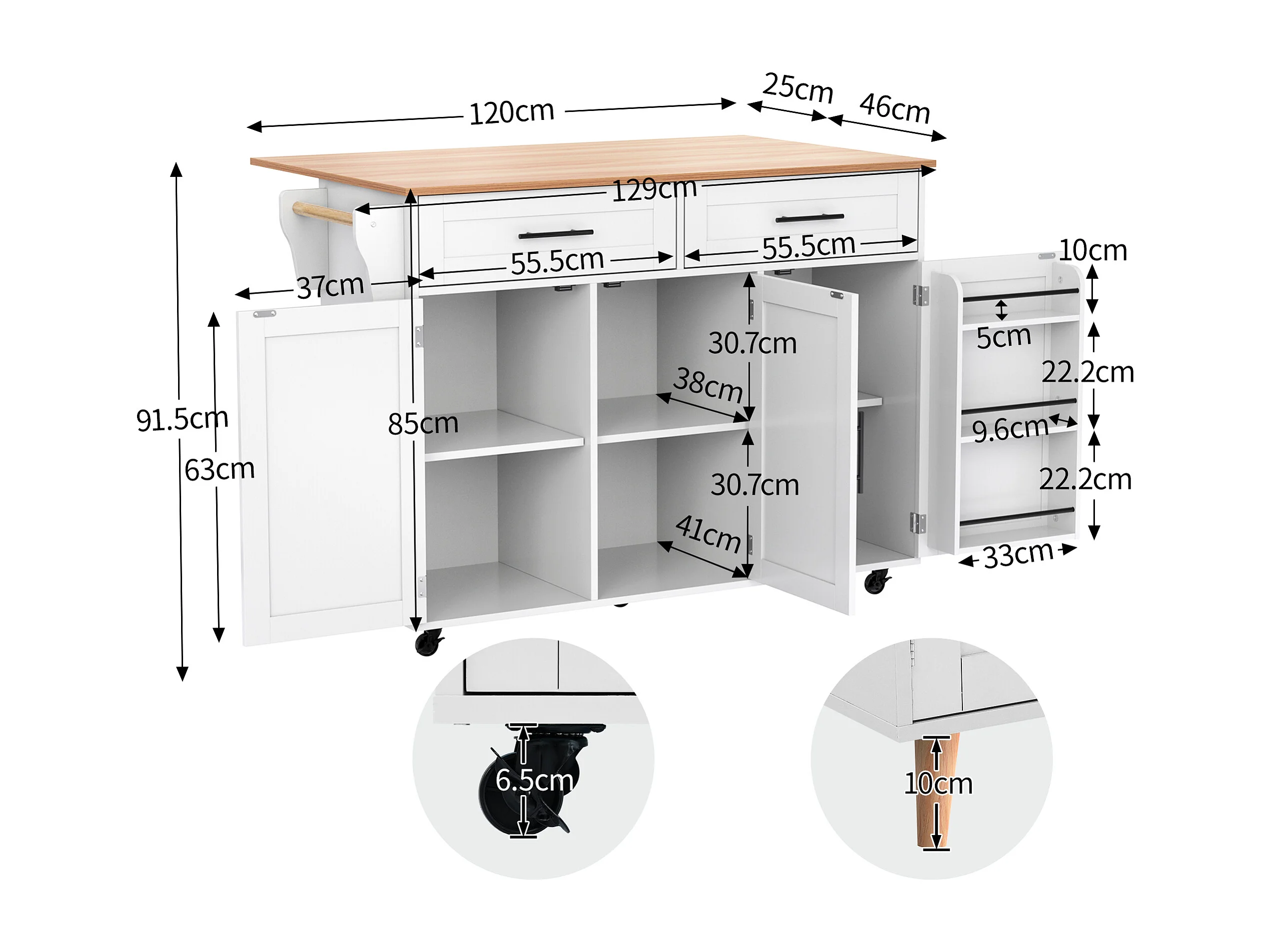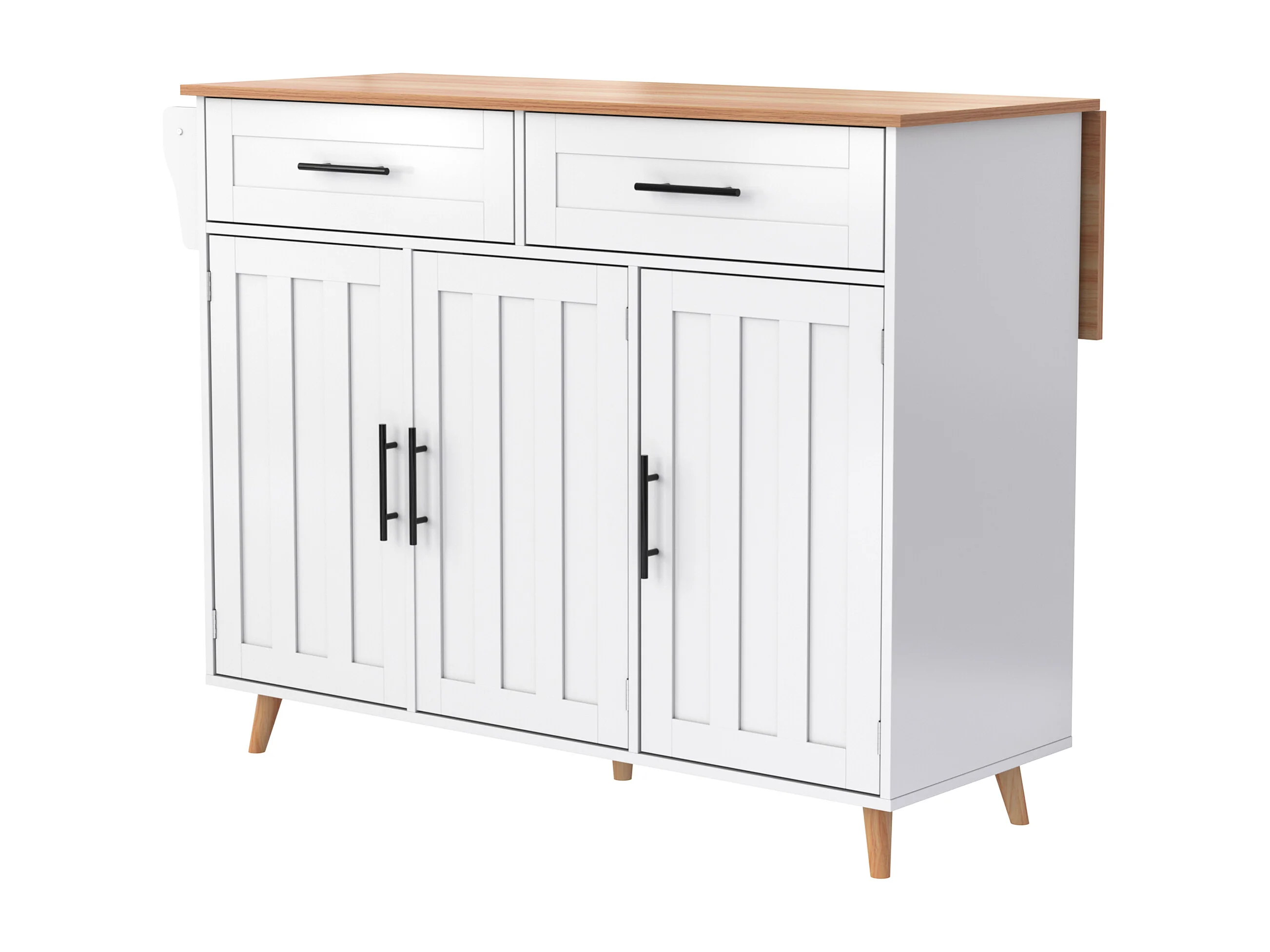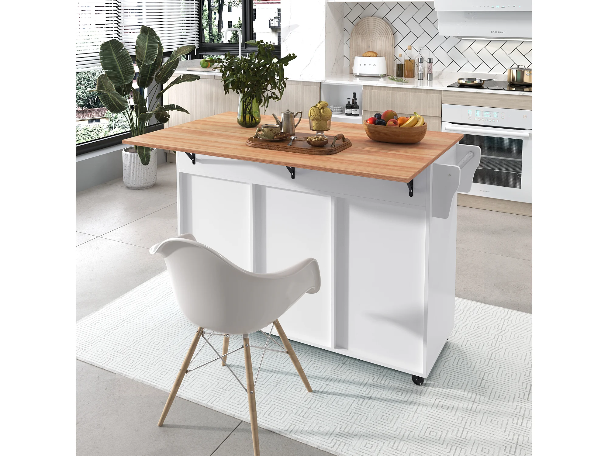 Ilot central de cuisine mobile - Plateau extensible - 2 tiroirs + portes d'armoire de rangement - Blanc