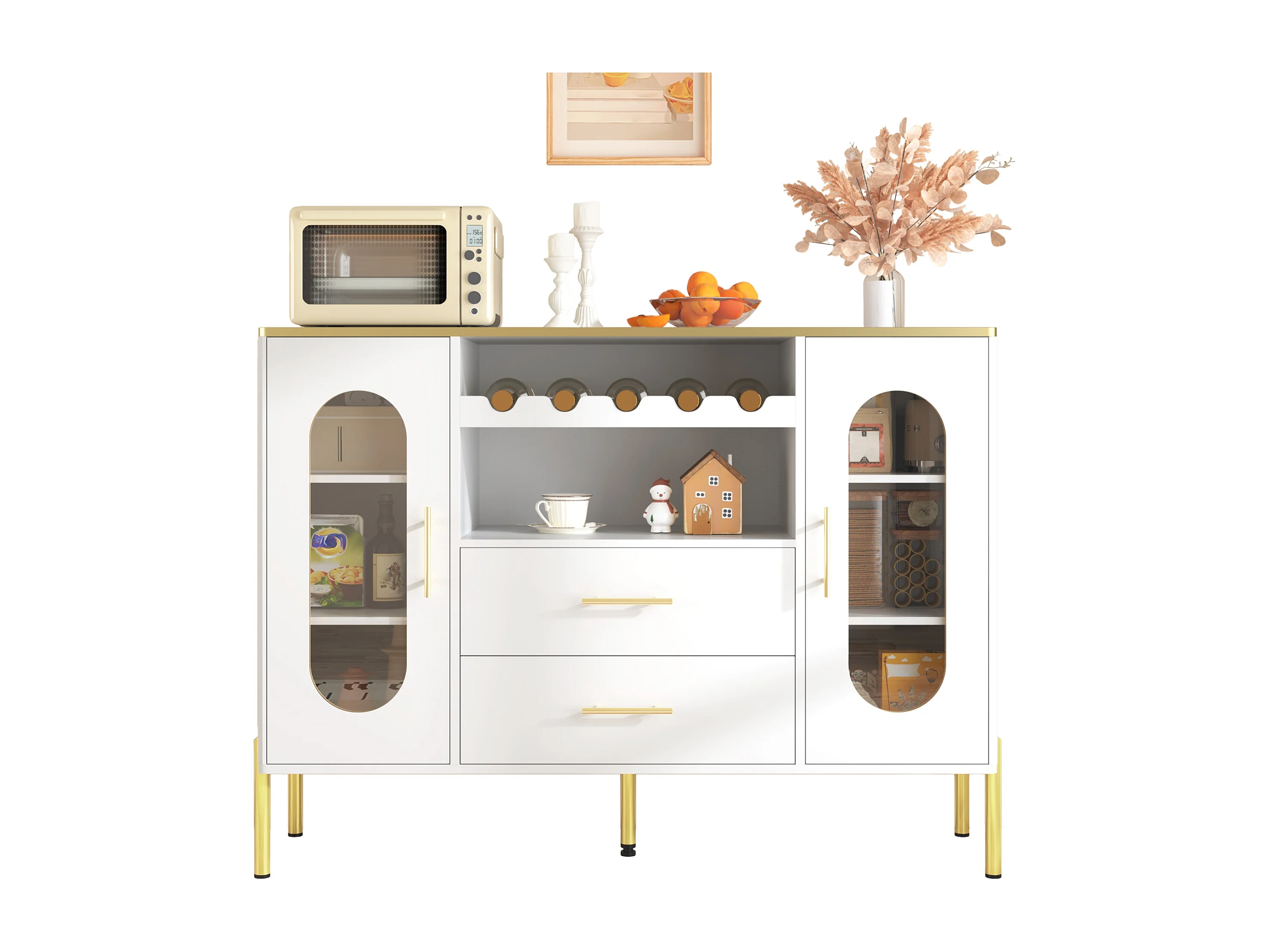 Buffet avec façades vitrées et casier à vin - 120 x38 x 90 cm - avec 2 tiroirs - Pieds réglables - MDF - blanc