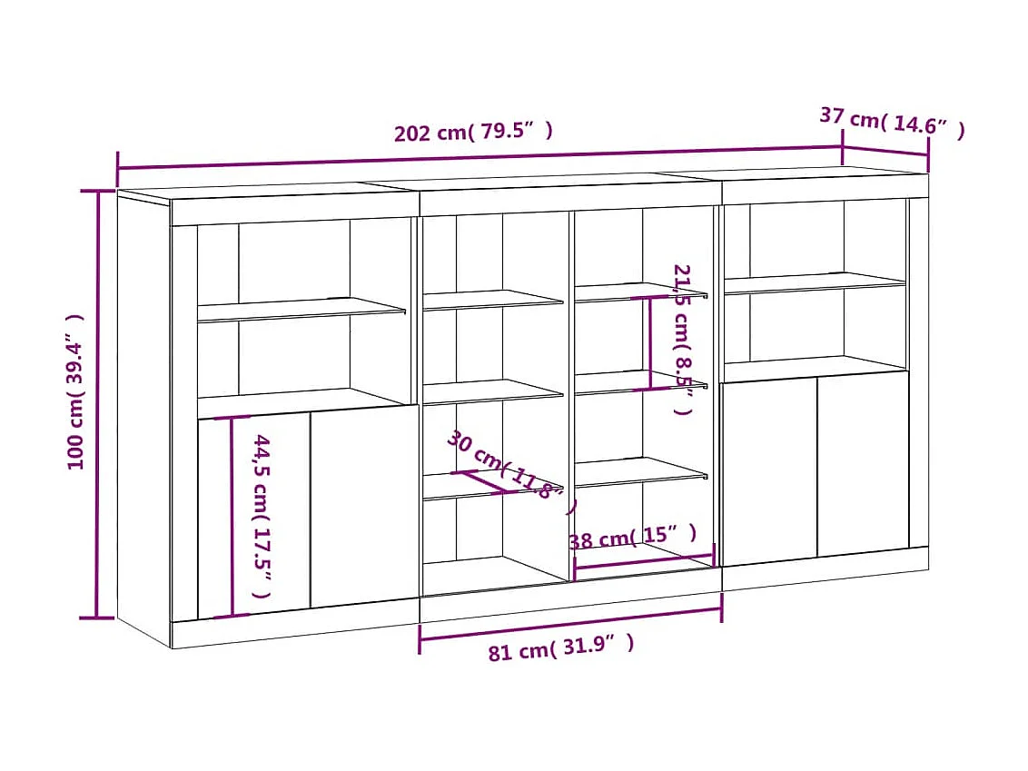 Buffet avec lumières LED gris béton 202x37x100 cm