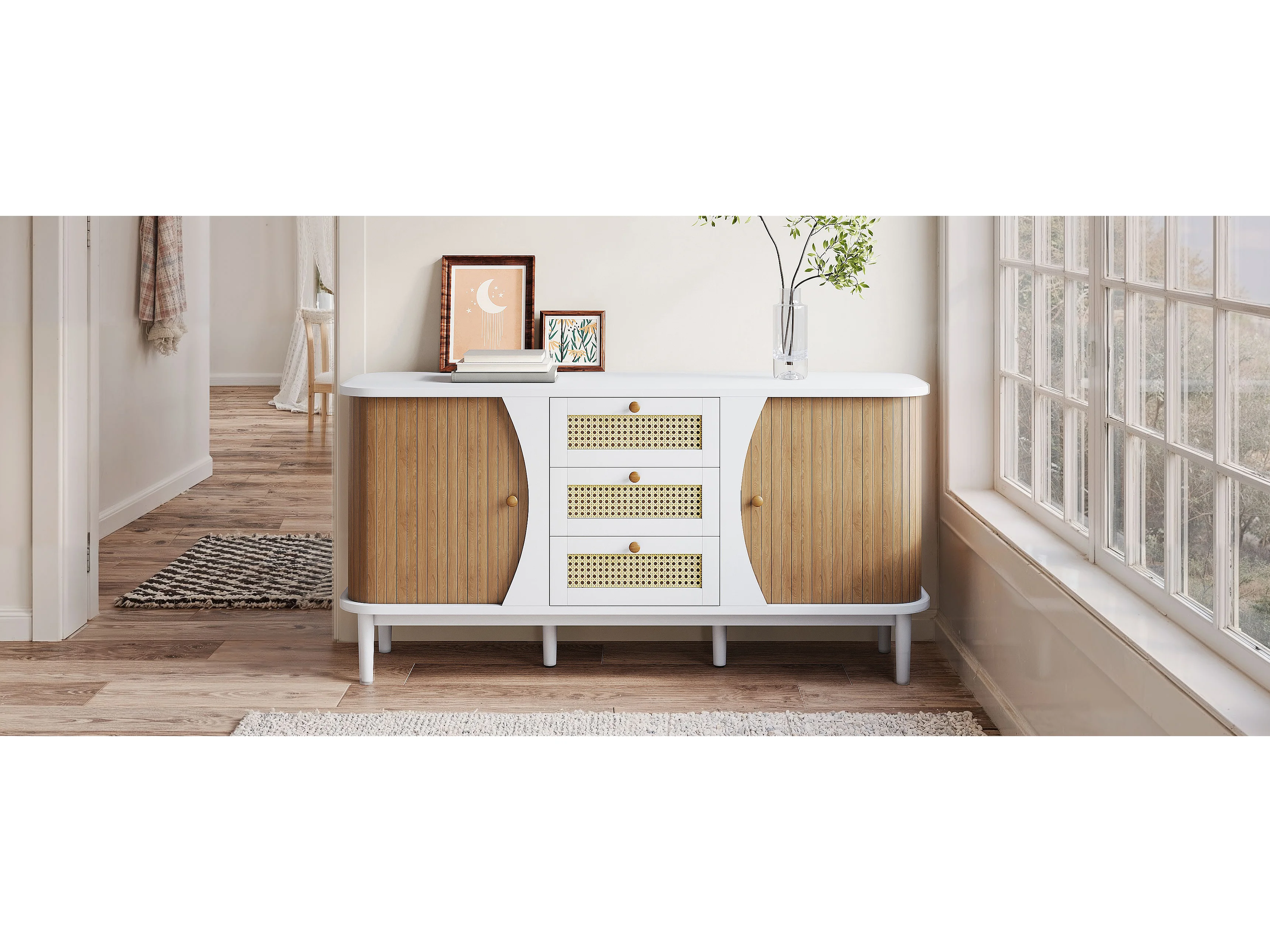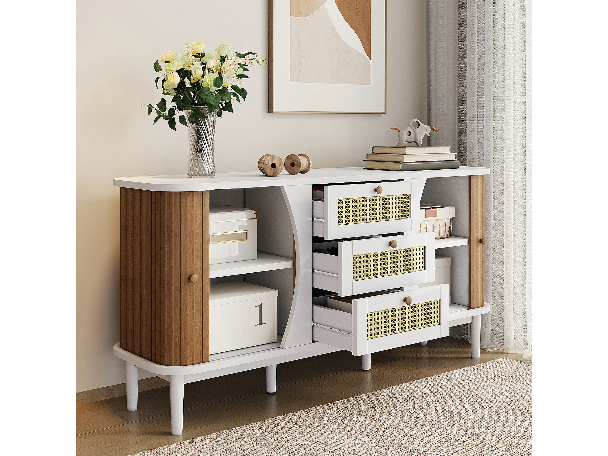 Buffet avec portes coulissantes et étagères réglables, MDF et panneaux de particules, blanc et bois (140.5x40x76cm)