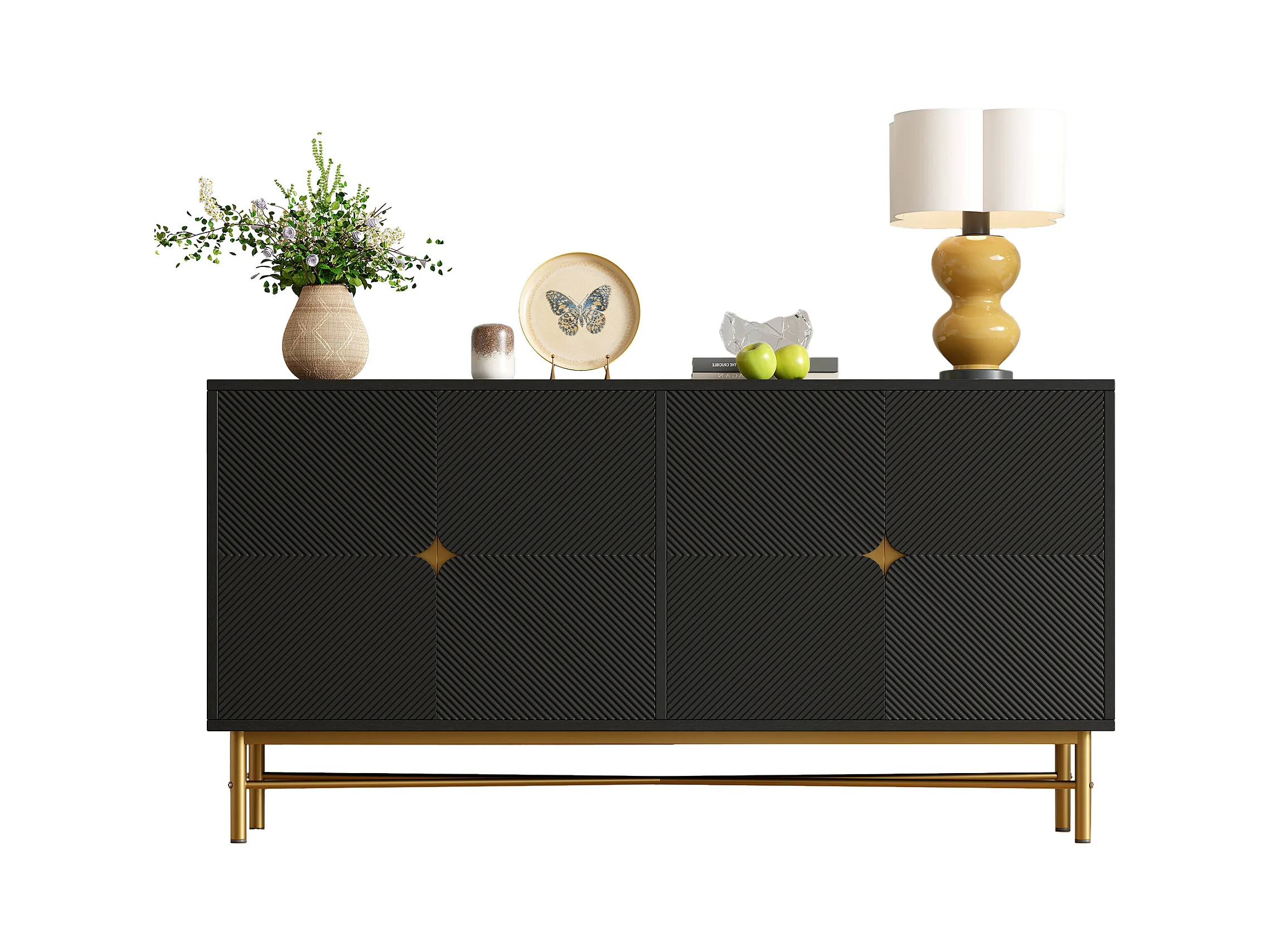 Buffet avec texture en relief, 4 portes, poignées dorées et pieds laqués, noir (160x40x82 cm)