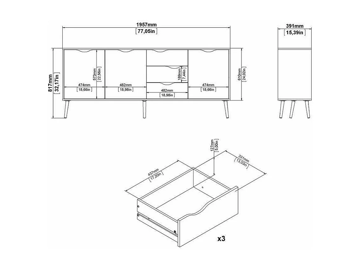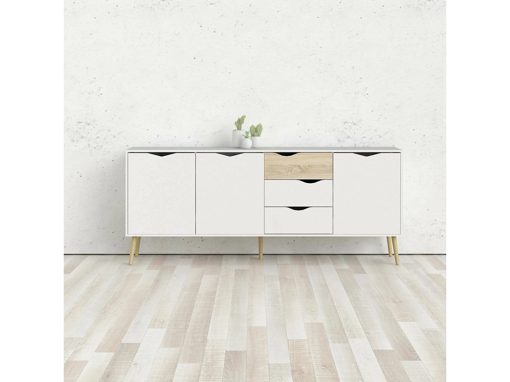 Buffet avec trois portes et trois tiroirs, blanc et chêne, Dimensions 195 x 81 x 39 cm