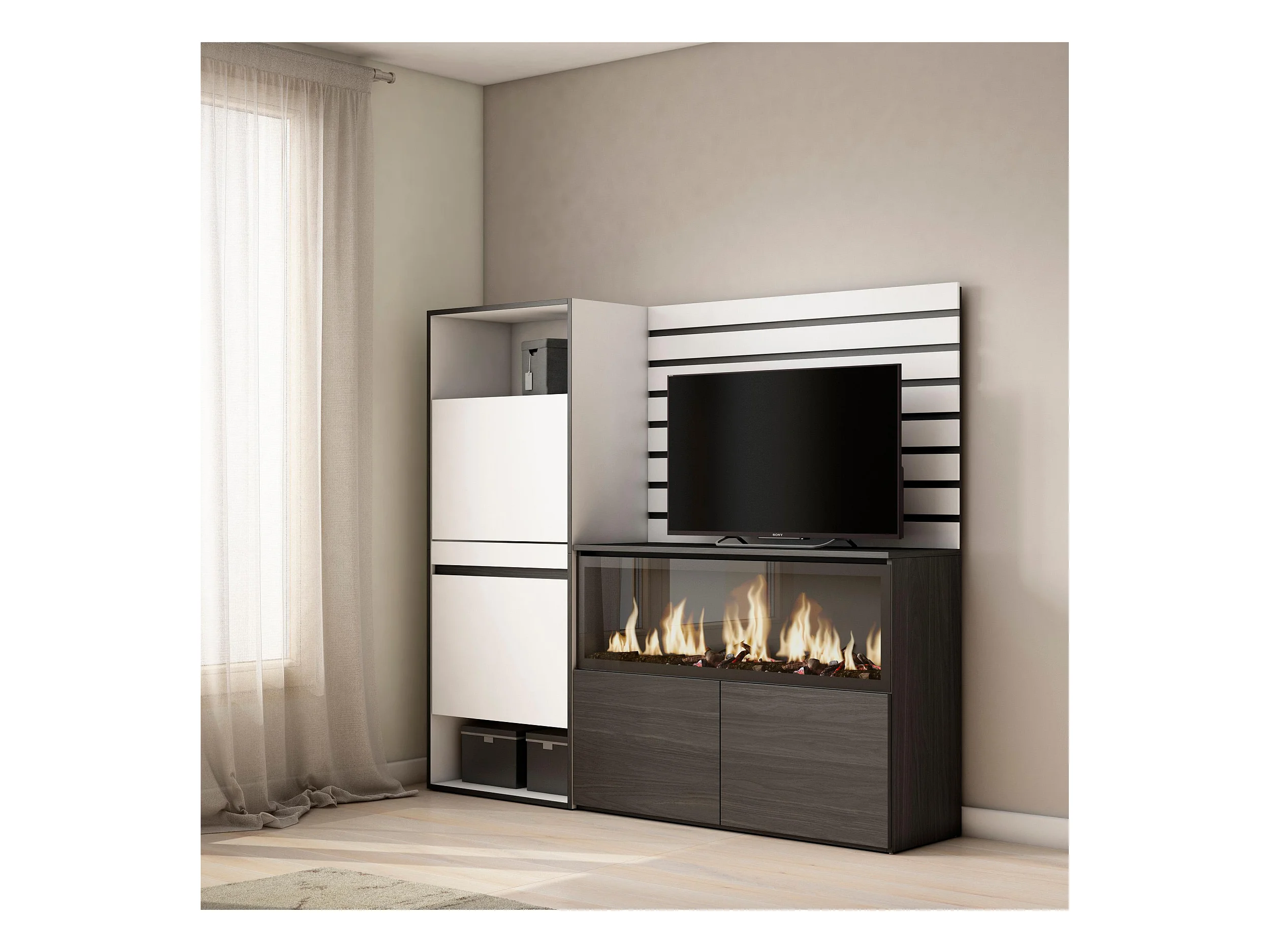 Buffet, Bahut, 334x35x145 cm, Chambre à coucher, pièce, Cheminée électrique XXL, Commode, Buffet, Meuble à Chaussures, Vestiaire ouvert, Blanc