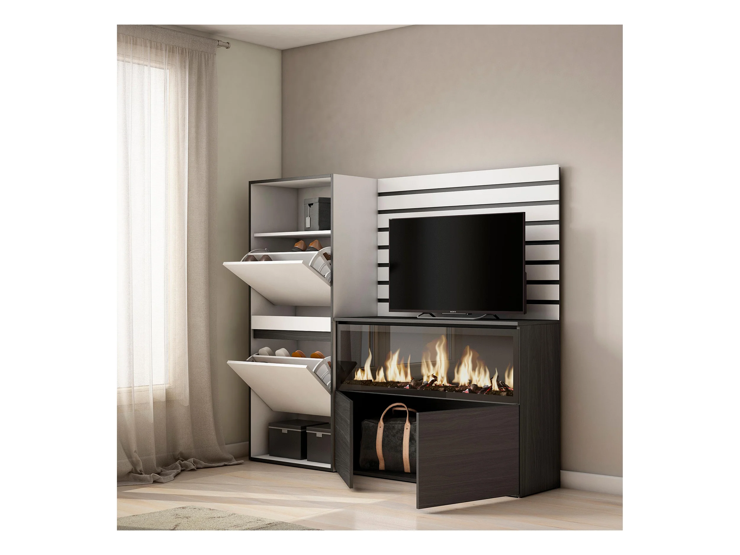 Buffet, Bahut, 227x35x145 cm, Chambre à coucher, pièce, Cheminée électrique XXL, Meuble à Chaussures, Vestiaire ouvert, Blanc