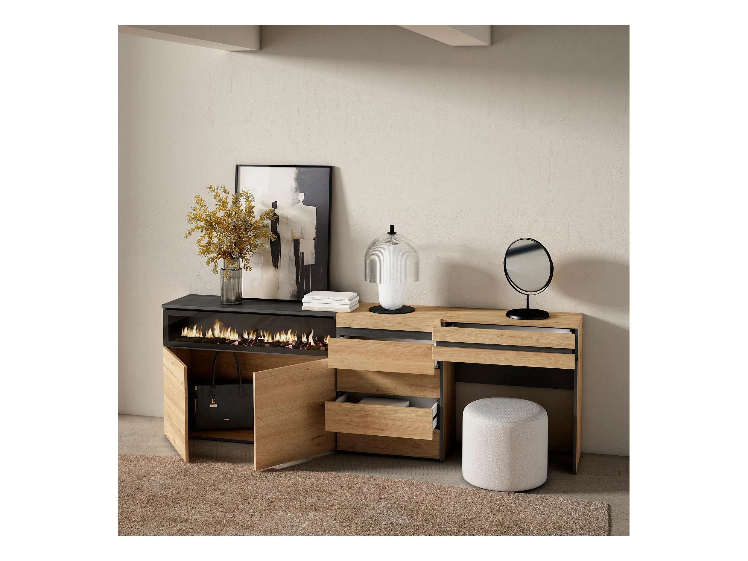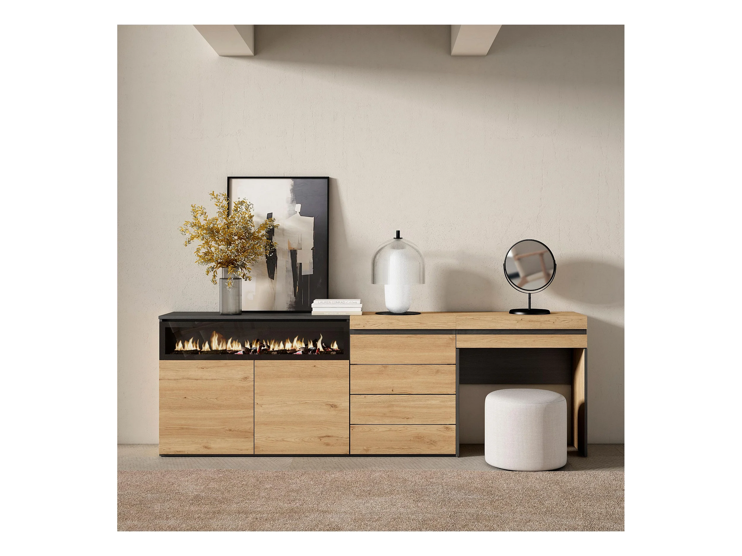 Coiffeuse, 284x35x75 cm, Avec tiroir, Cheminée électrique XXL, Commode, Buffet, Chêne