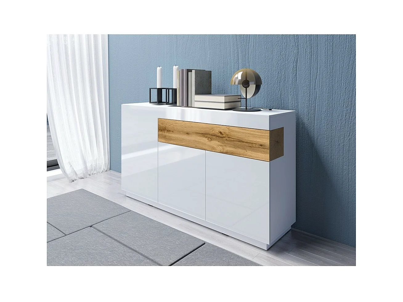 Buffet 3 portes 2 tiroirs KILES – Blanc et chêne – Design moderne spacieux