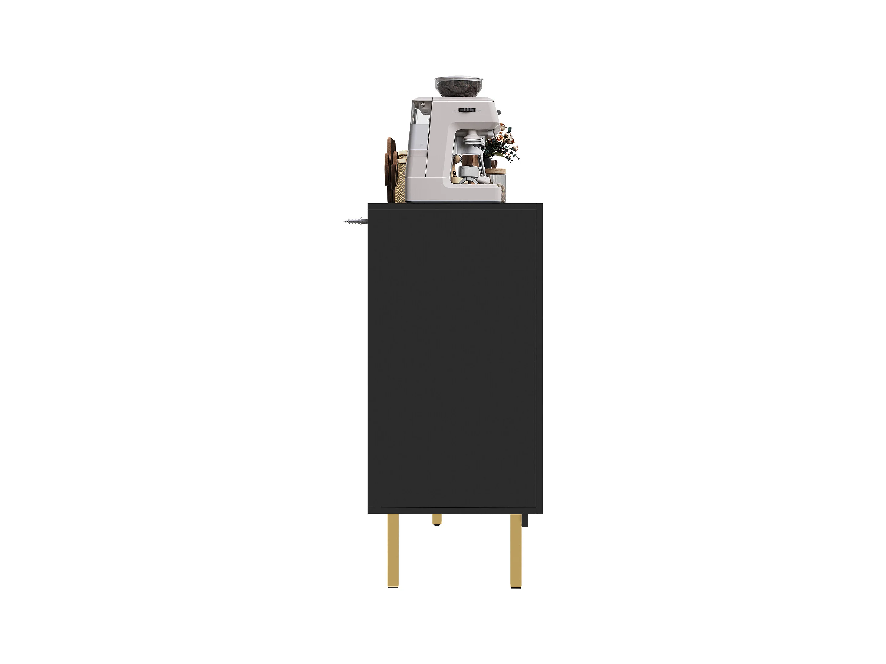 Buffet avec 2 portes et 3 tiroirs, pieds métalliques, design linéaire, MDF, noir et or (140x75x35 cm)