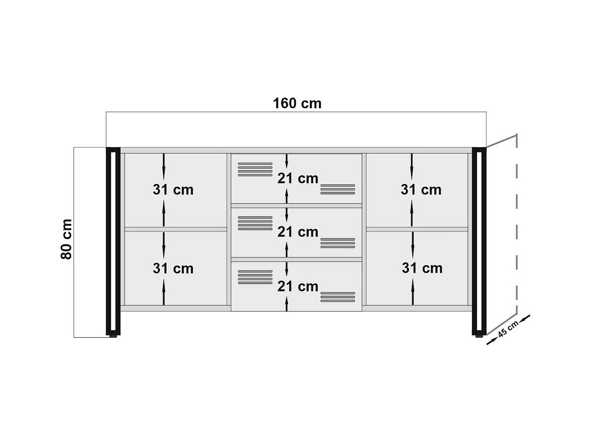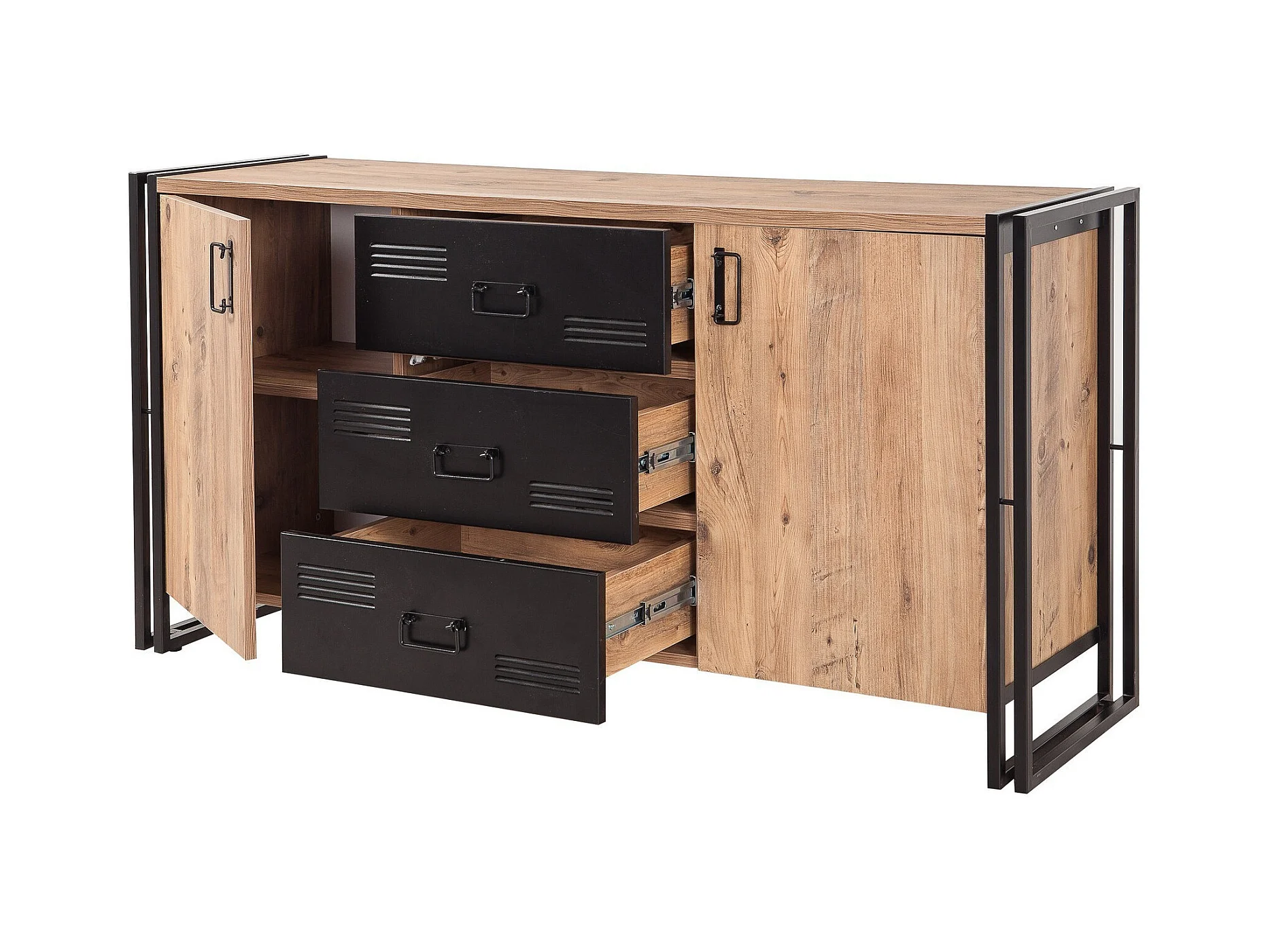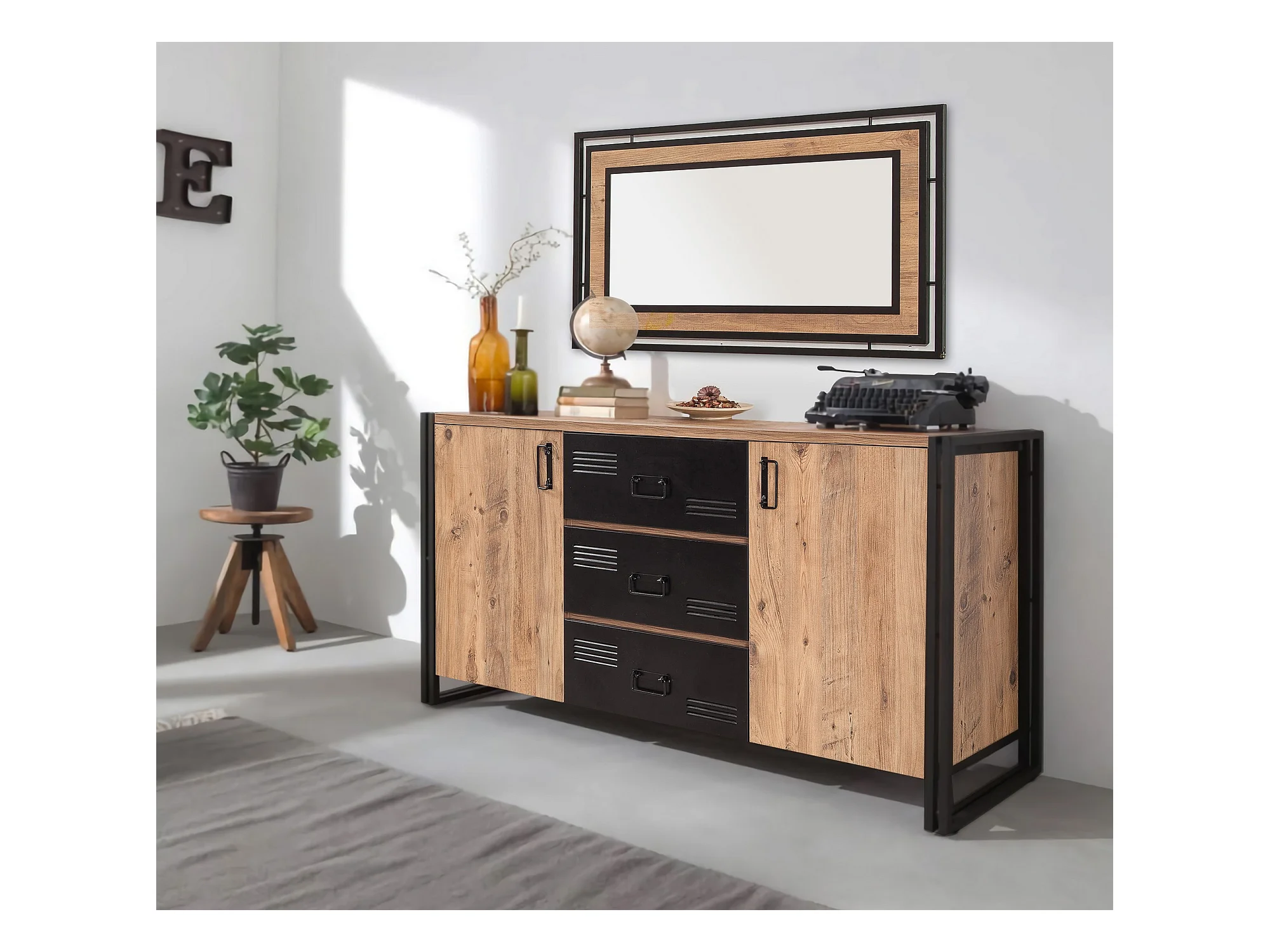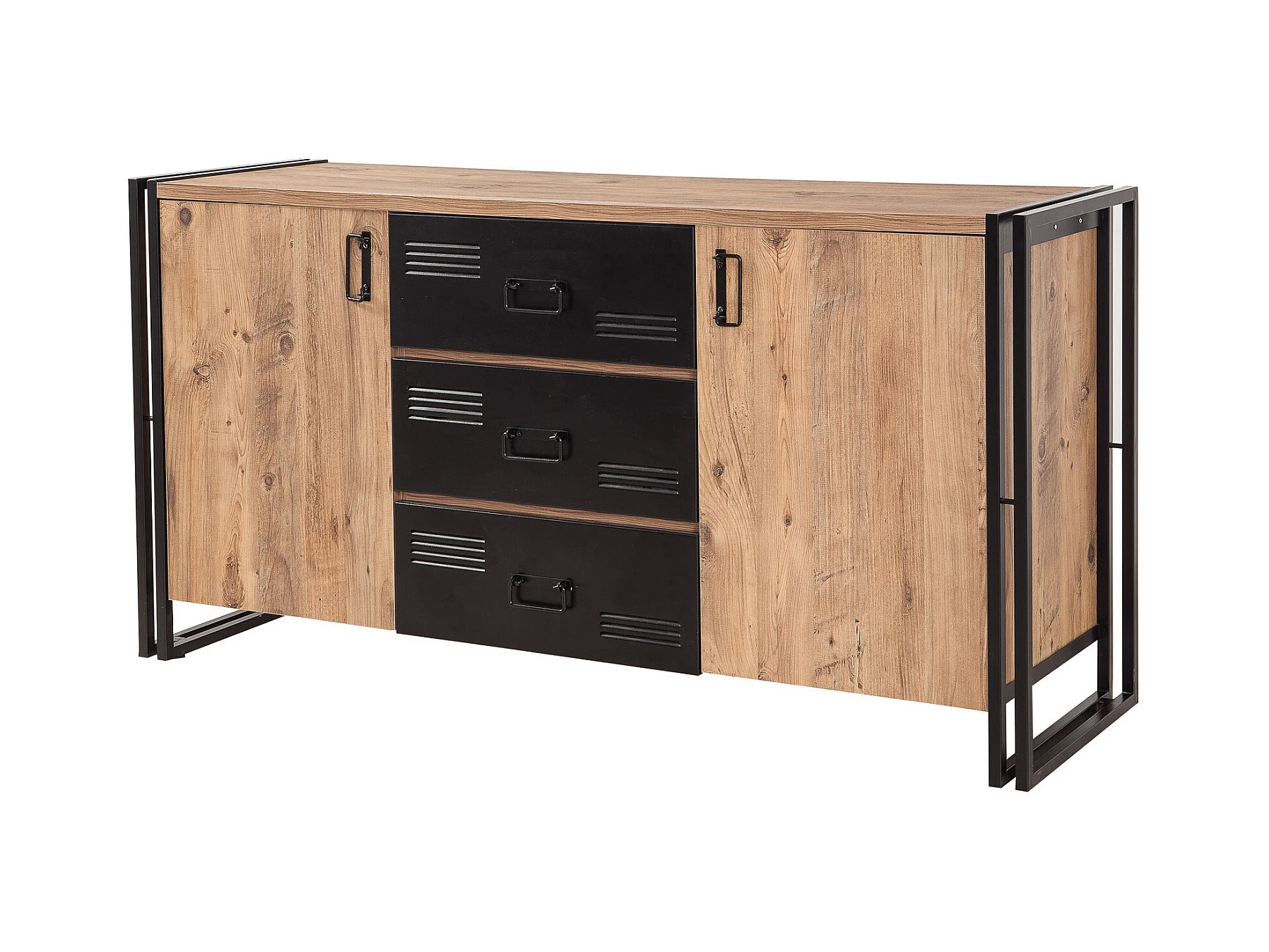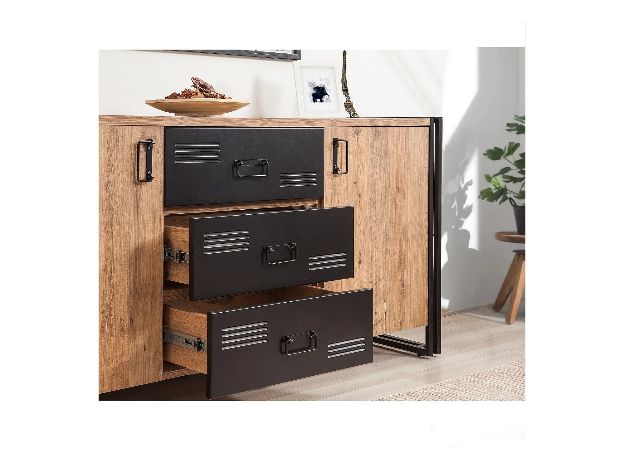 Buffet bas 3 portes et 3 étagères Feneta 180cm Métal Noir et Bois clair