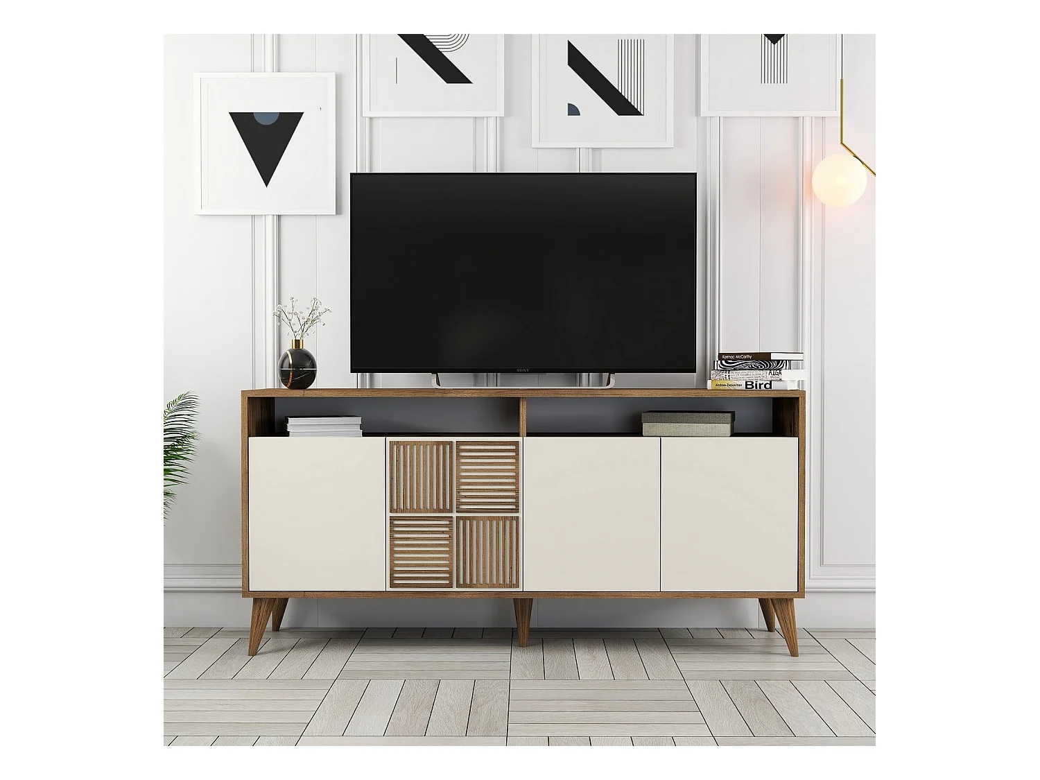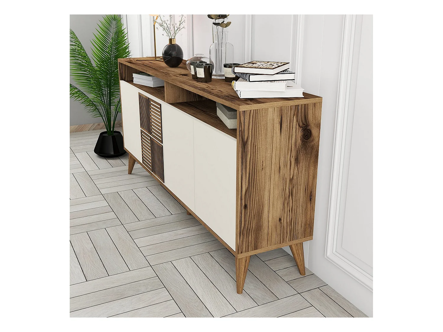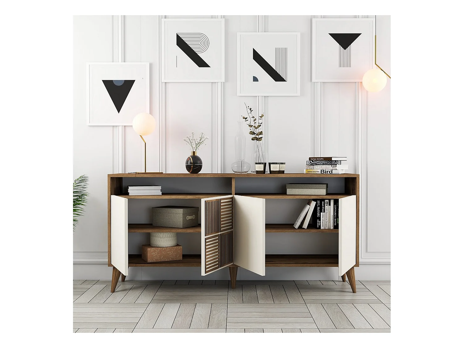 Buffet bas 4 portes et 2 tiroirs Kaltes L160cm Bois et Blanc crème