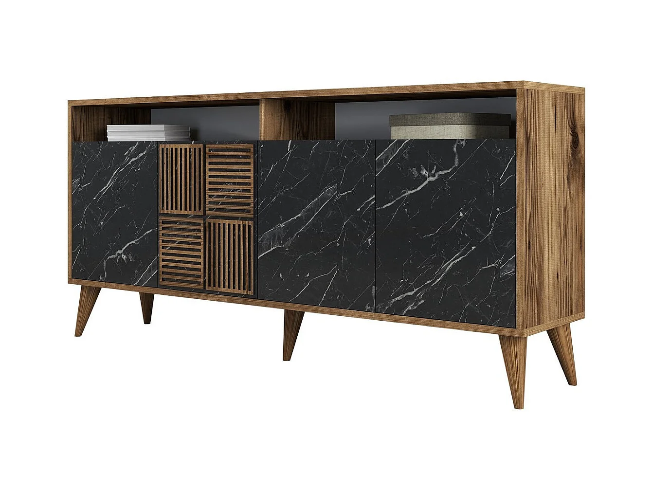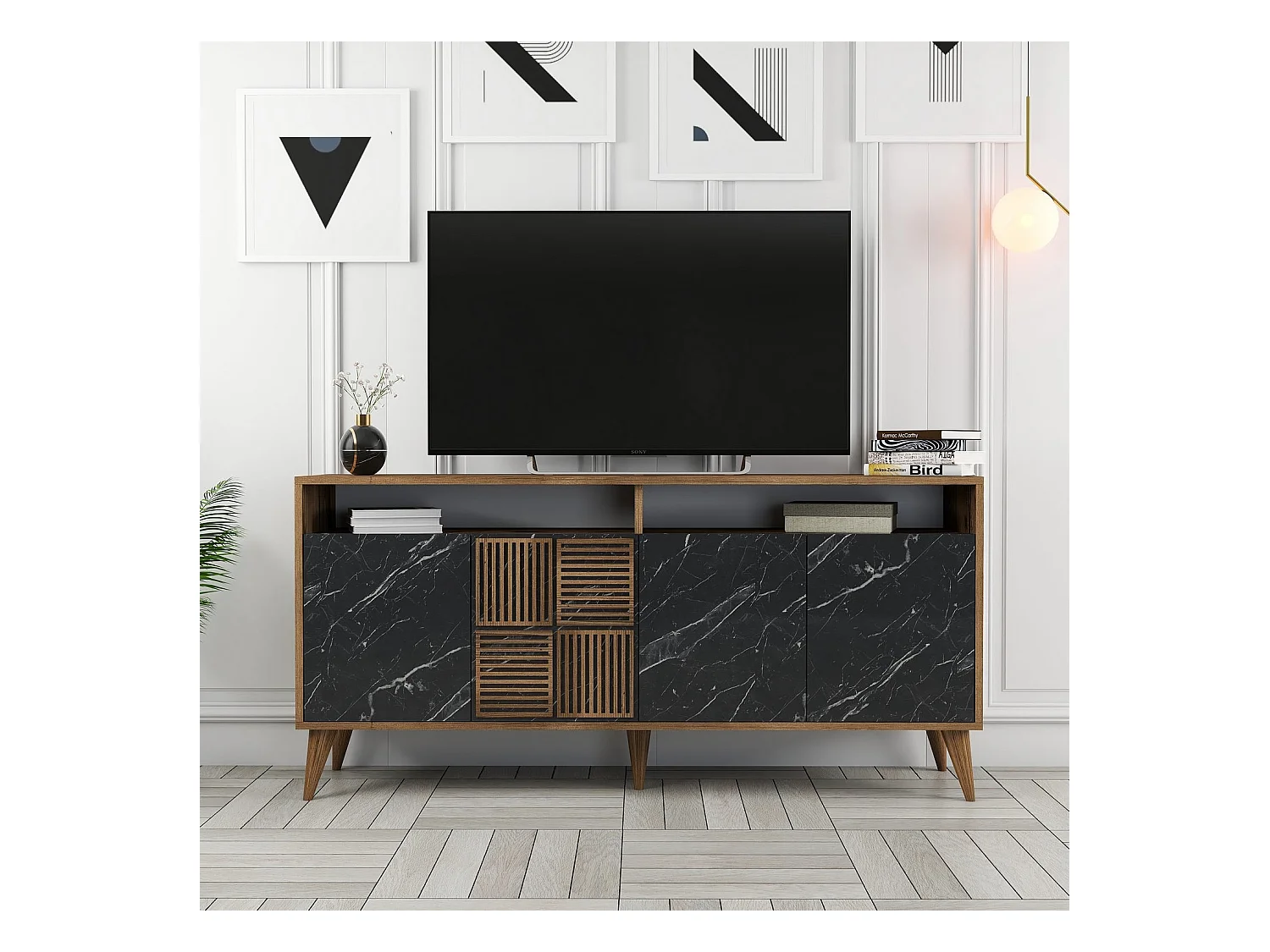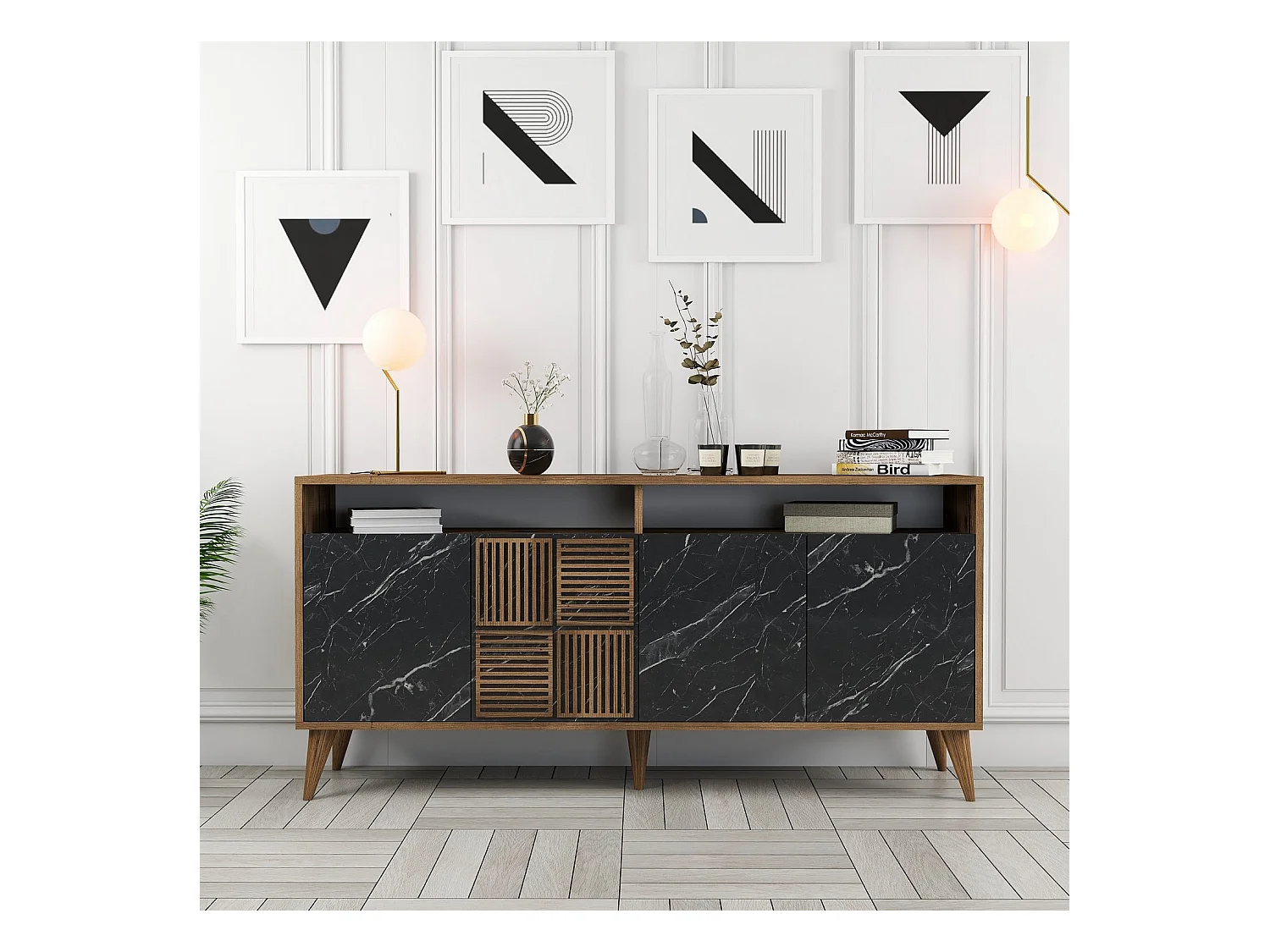 Buffet bas 4 portes et 2 tiroirs Kaltes L160cm Bois et Effet marbre Noir