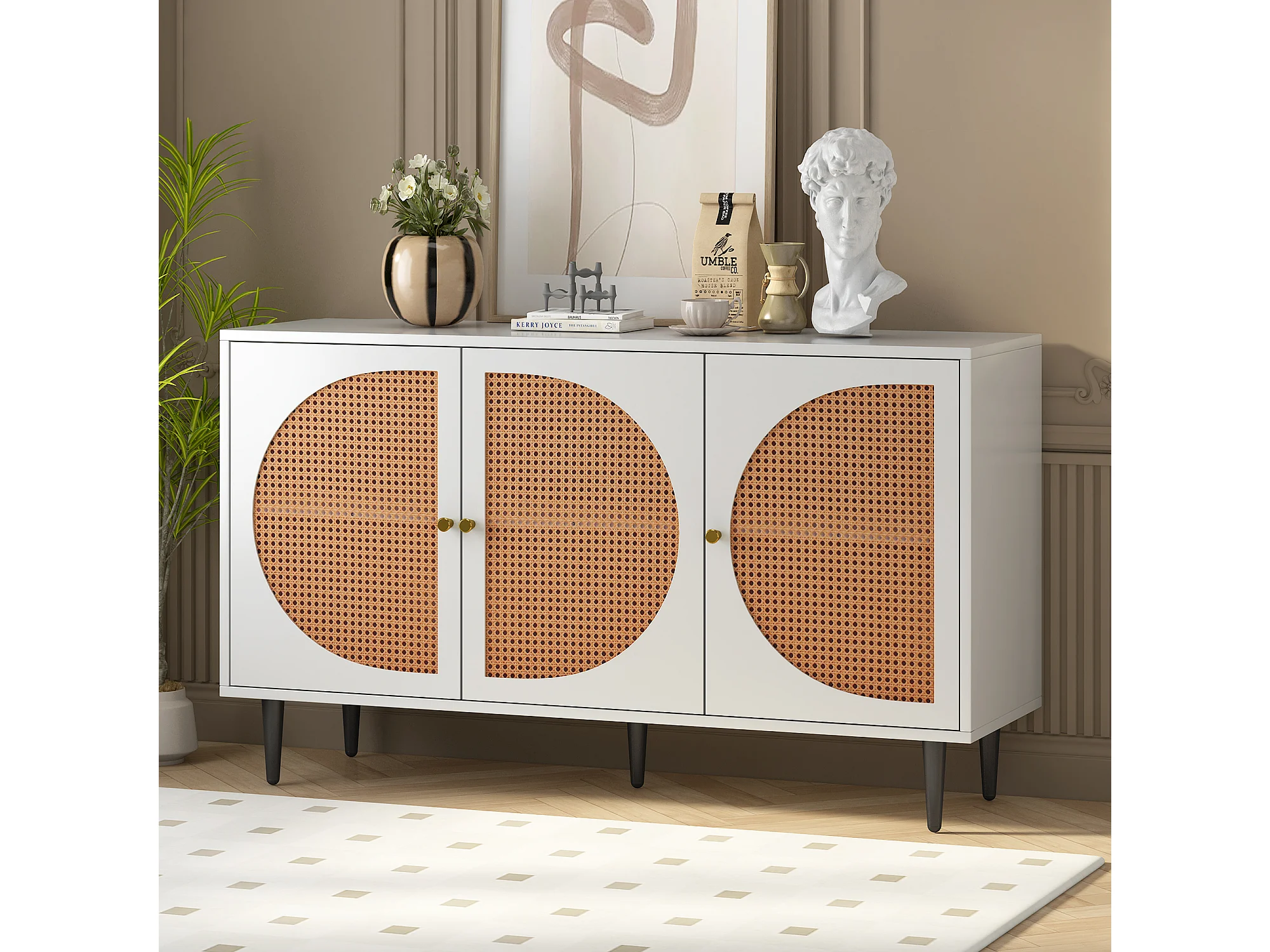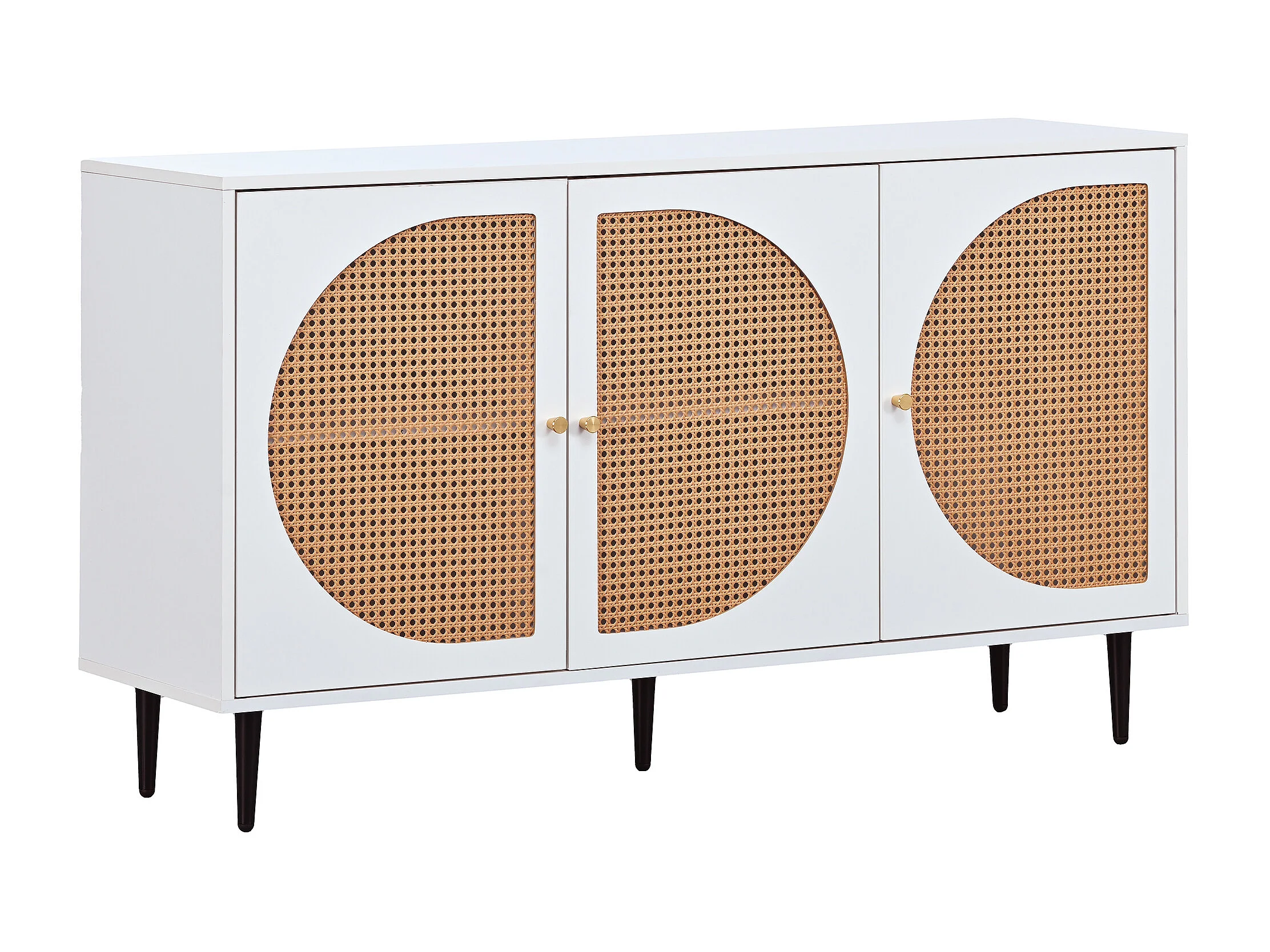 Buffet bas avec 3 portes décorées en rotin, panneaux de particules, style vintage, blanc et chêne, 129,8x 40x 76cm