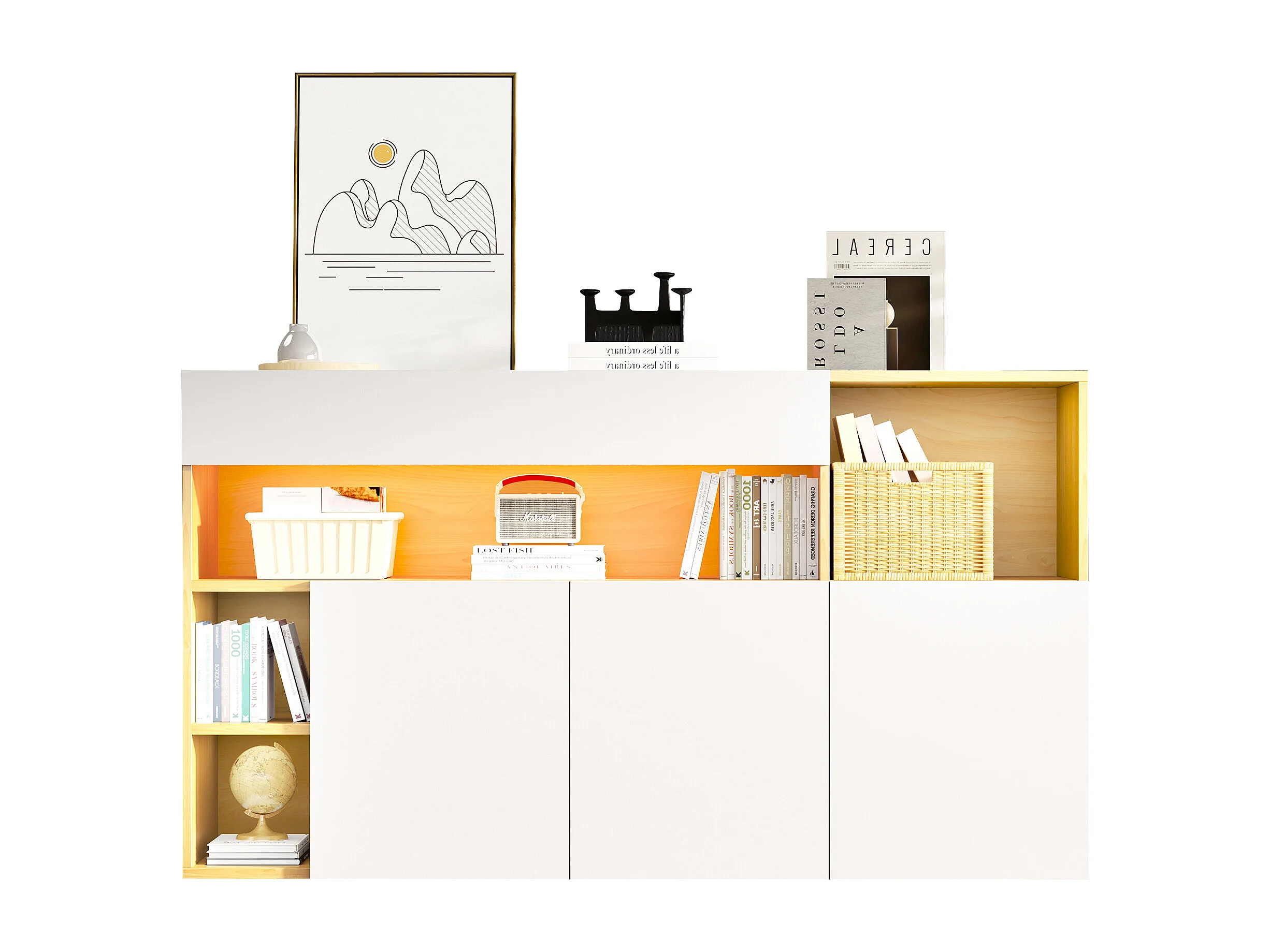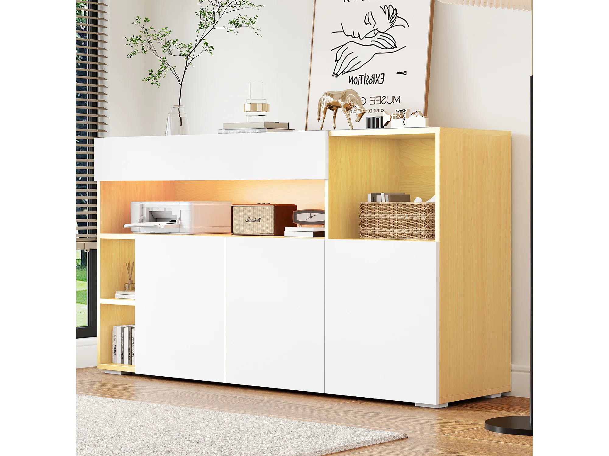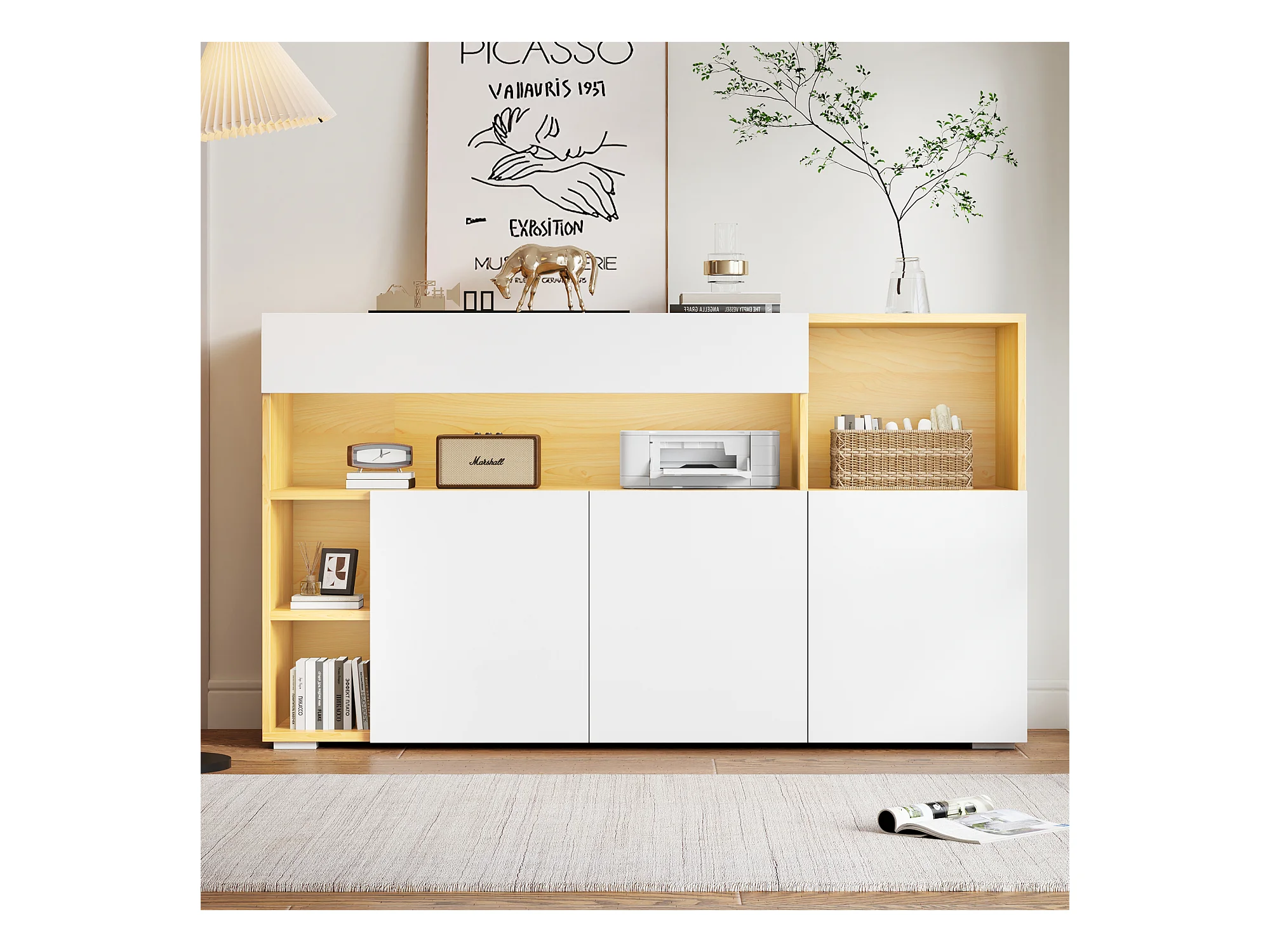 Buffet bas avec 3 portes et 4 niches de rangement - 140 x 40 x 70 cm - LEDs - Panneau de particules - Blanc et chêne