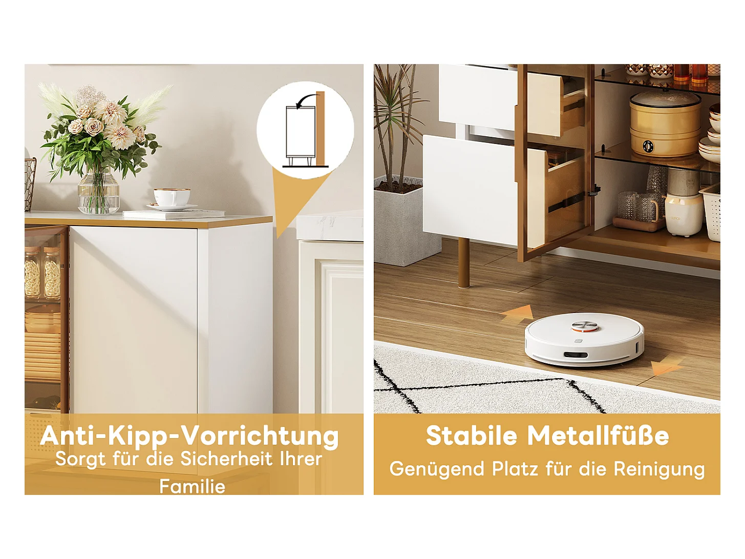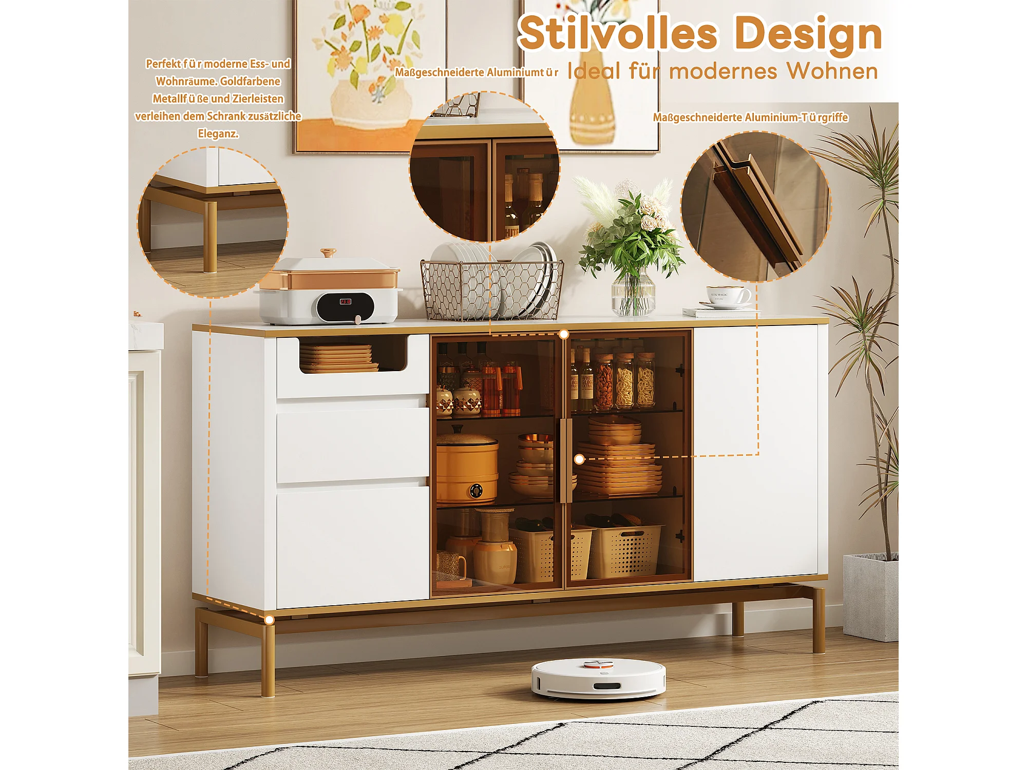 Buffet bas avec 3 tiroirs et 3 portes en verre et bois - 150 x 40 x 80 cm - MDF et pièds en métal - Effet marbre - Naturel et or