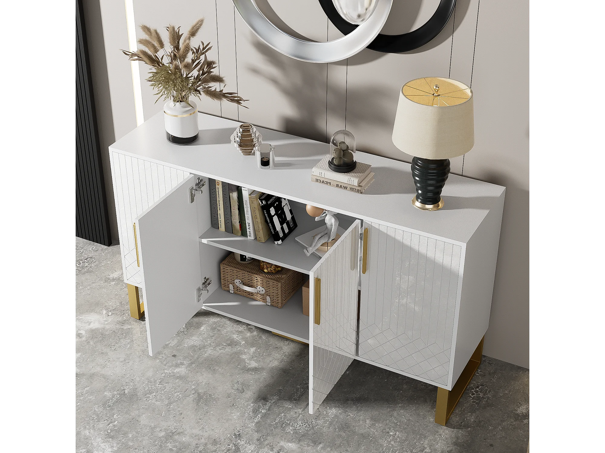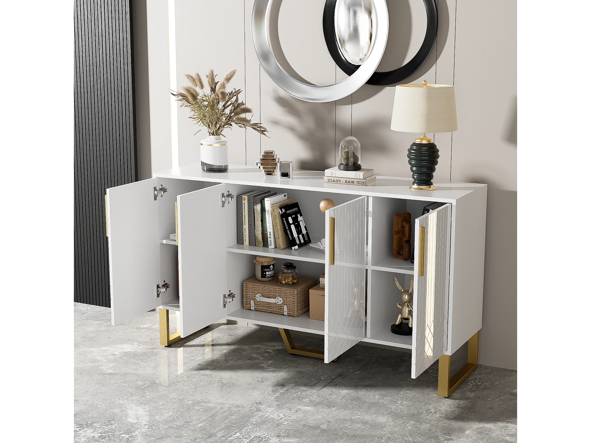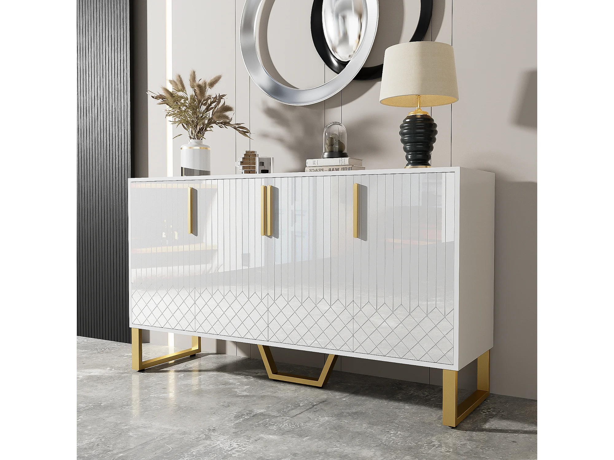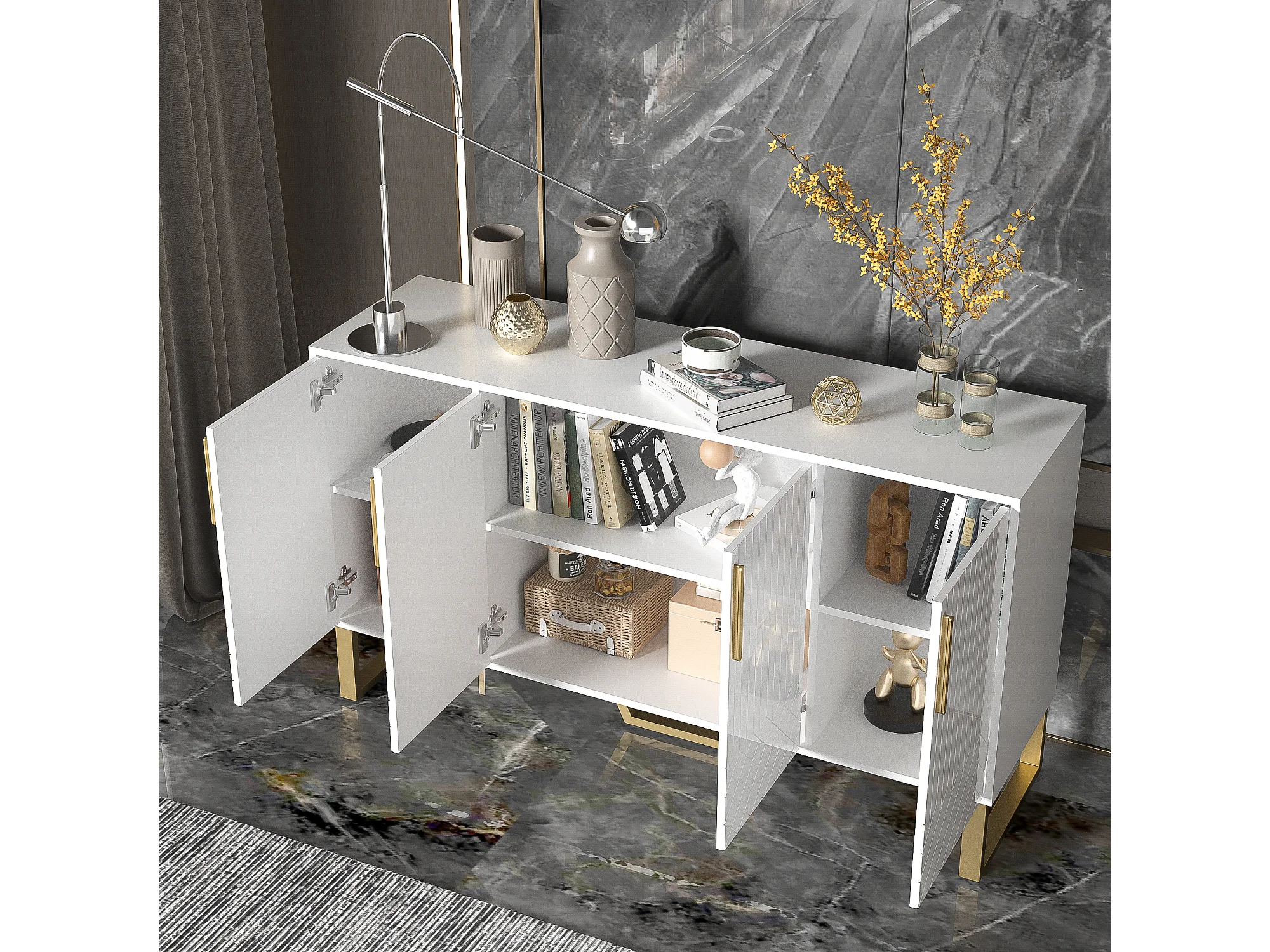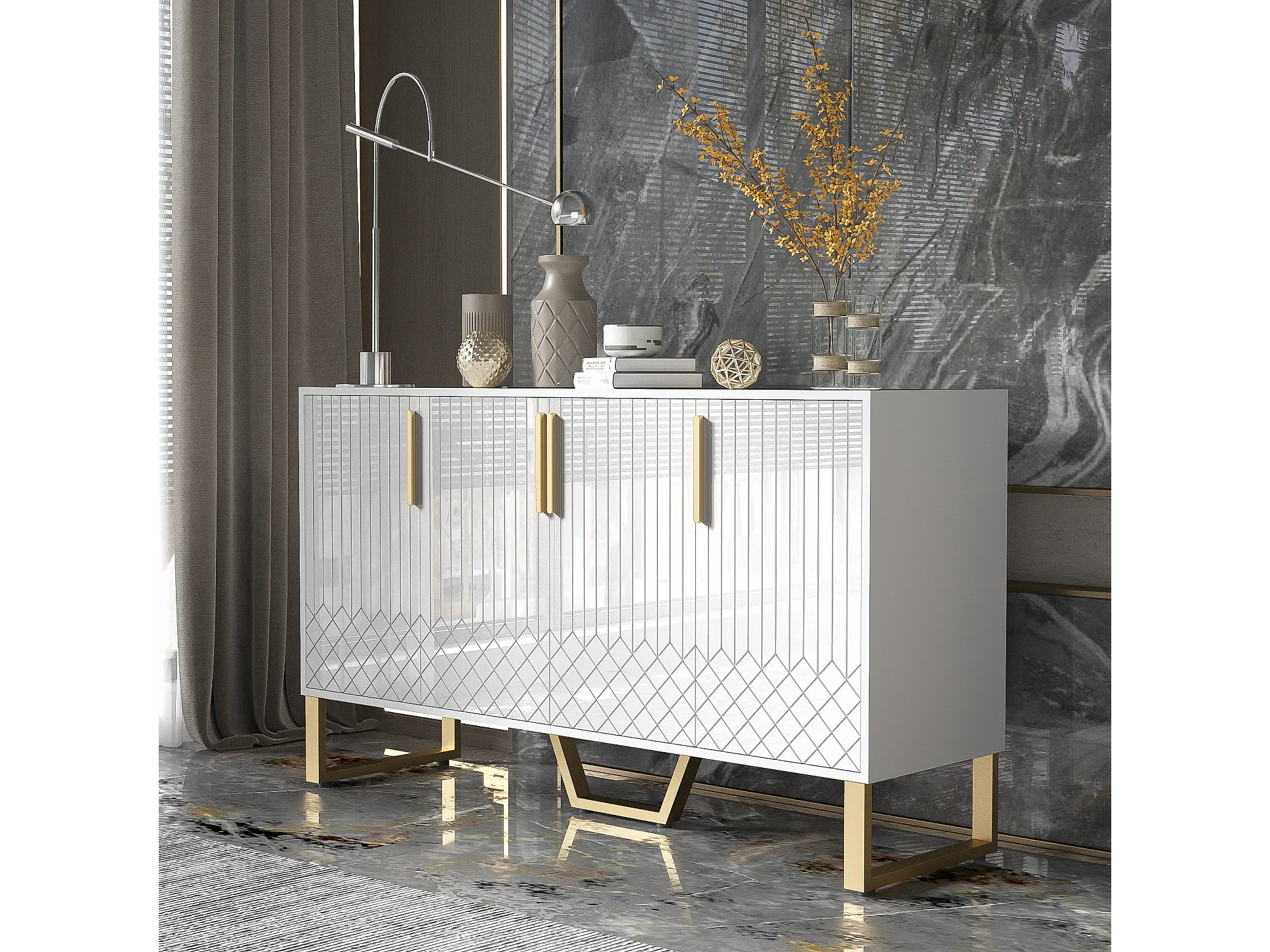 Buffet bas avec 4 portes - 140 L x 40 P x 80 H cm - Bois MDF et pièds en métal doré - Blanc brillant