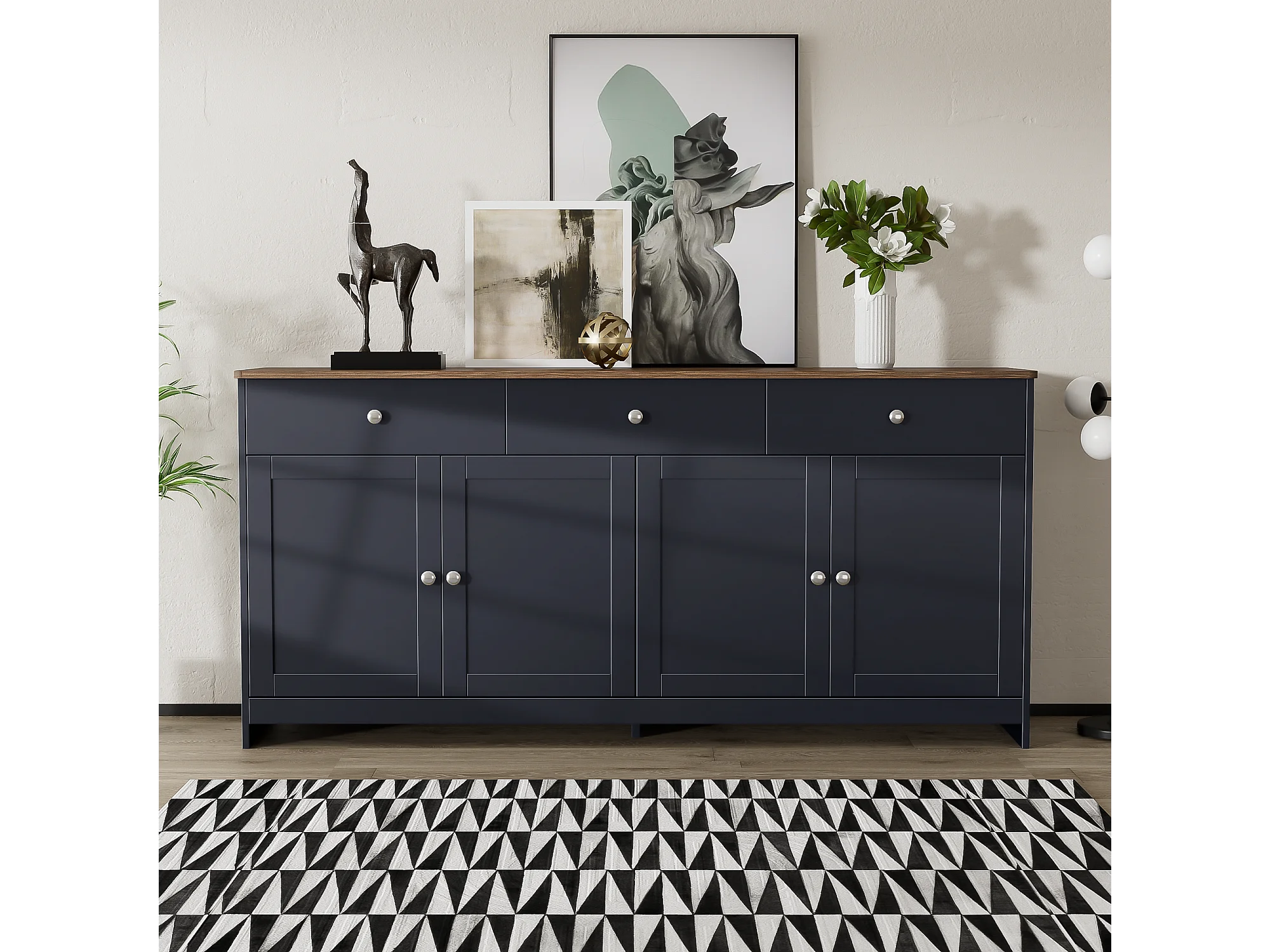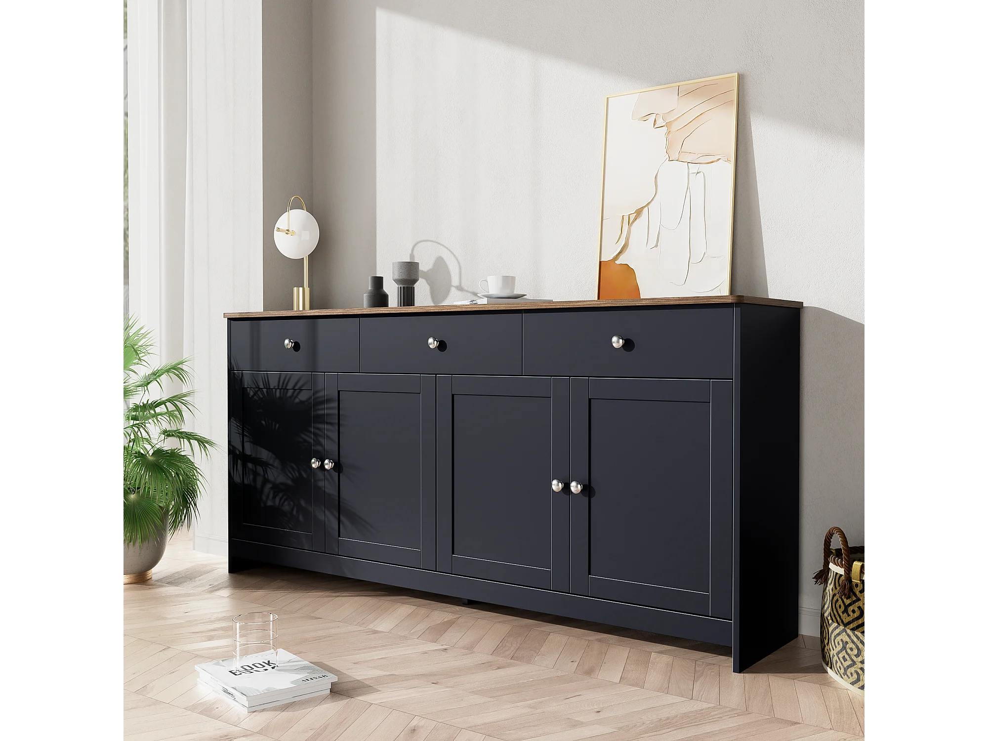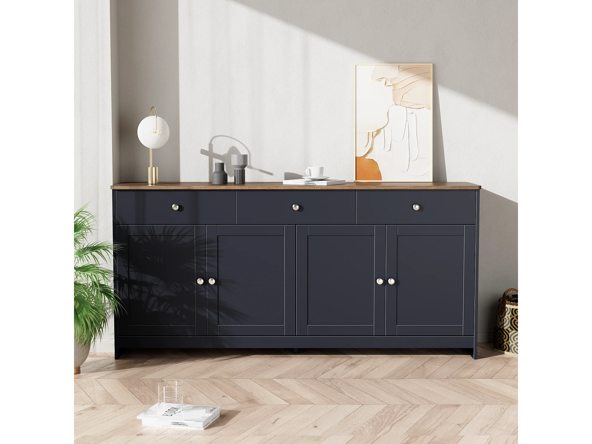 Buffet bas avec 4 portes et 3 tiroirs pour salon - 160 L x 37 l x 75H cm - bois MDF - bois et gris noir