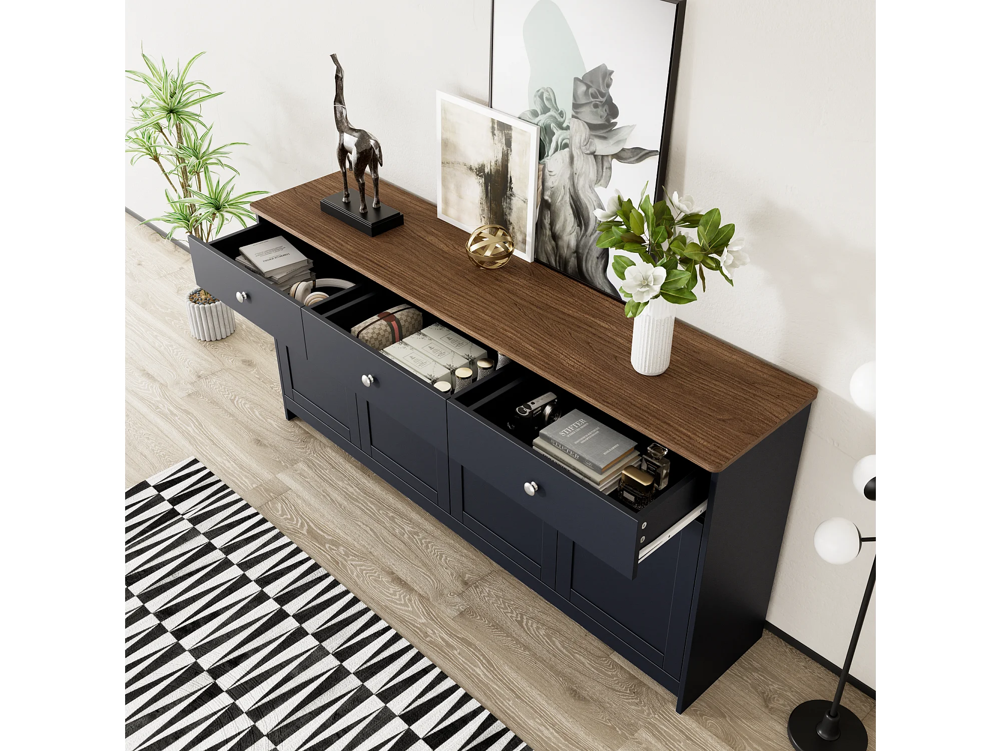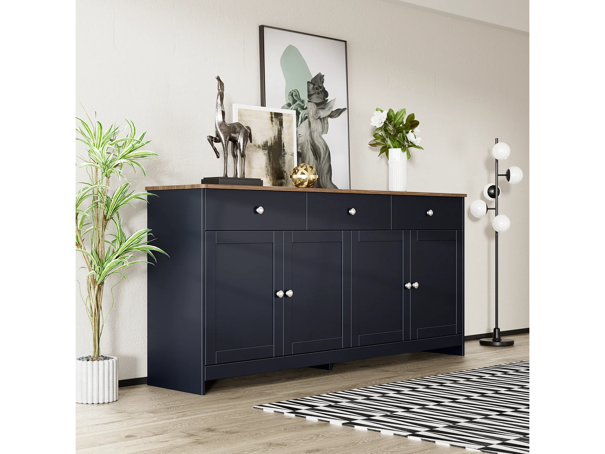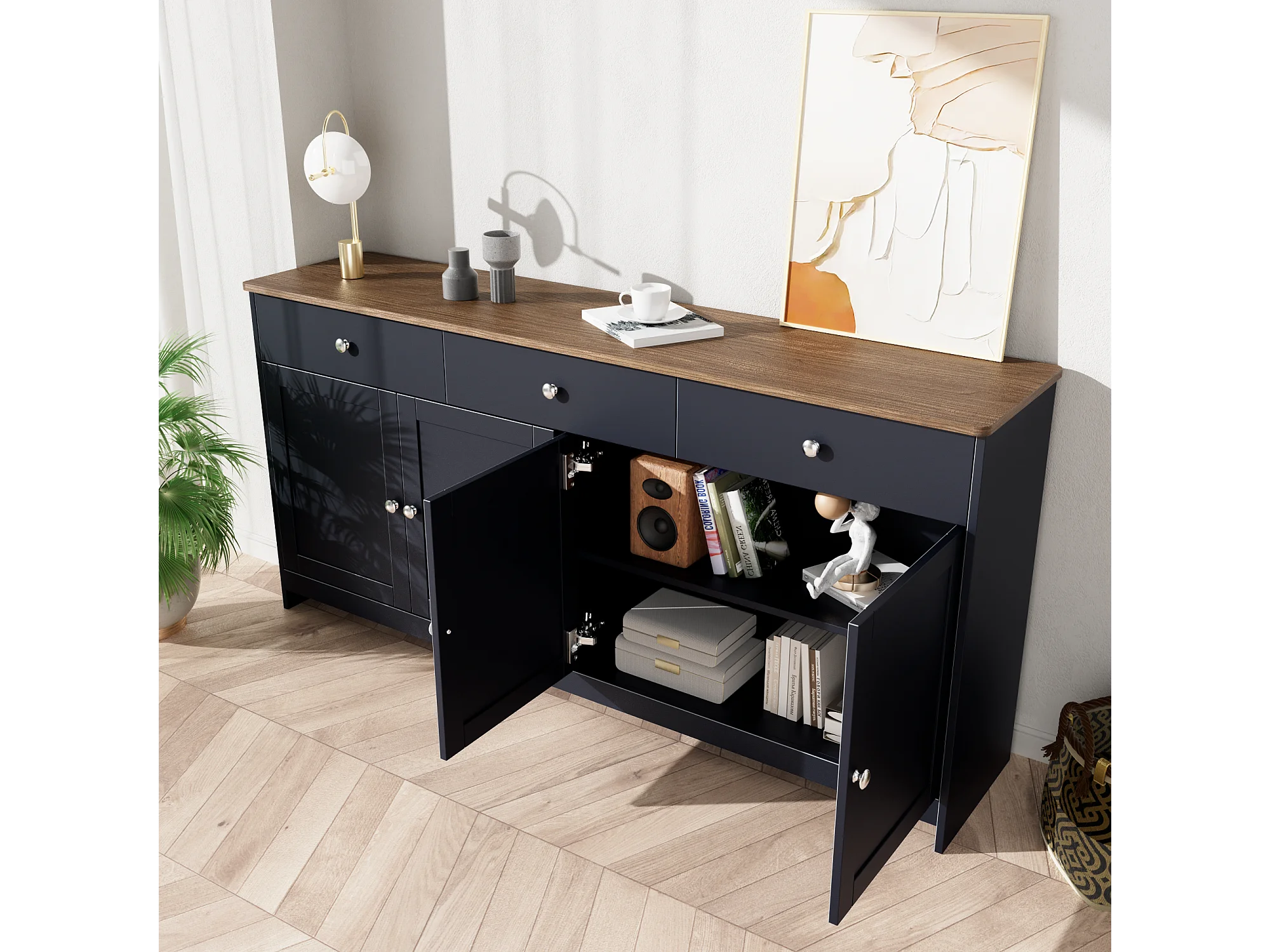 Buffet bas avec 4 portes et 3 tiroirs pour salon - 160 L x 37 l x 75H cm - bois MDF - bois et gris noir