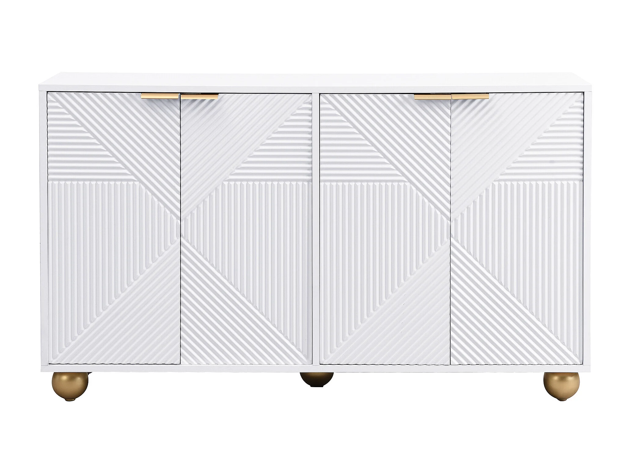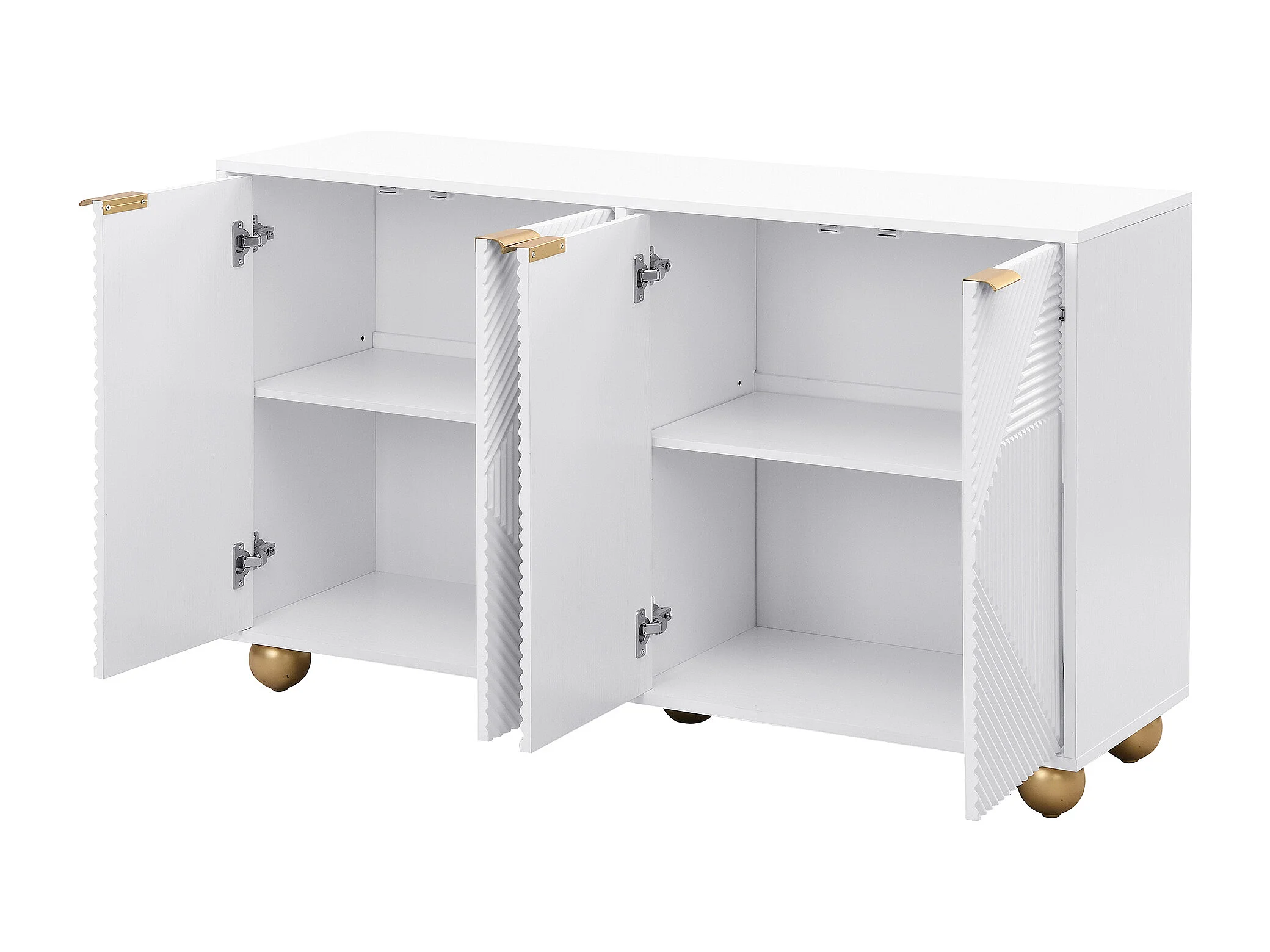 Buffet blanc avec 4 portes texturées, étagères intérieures réglables et pieds boule dorés