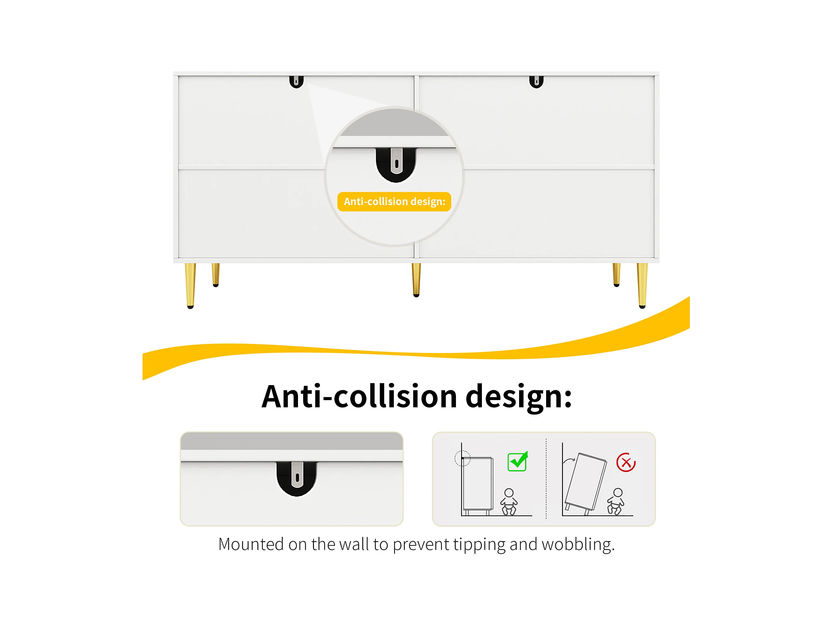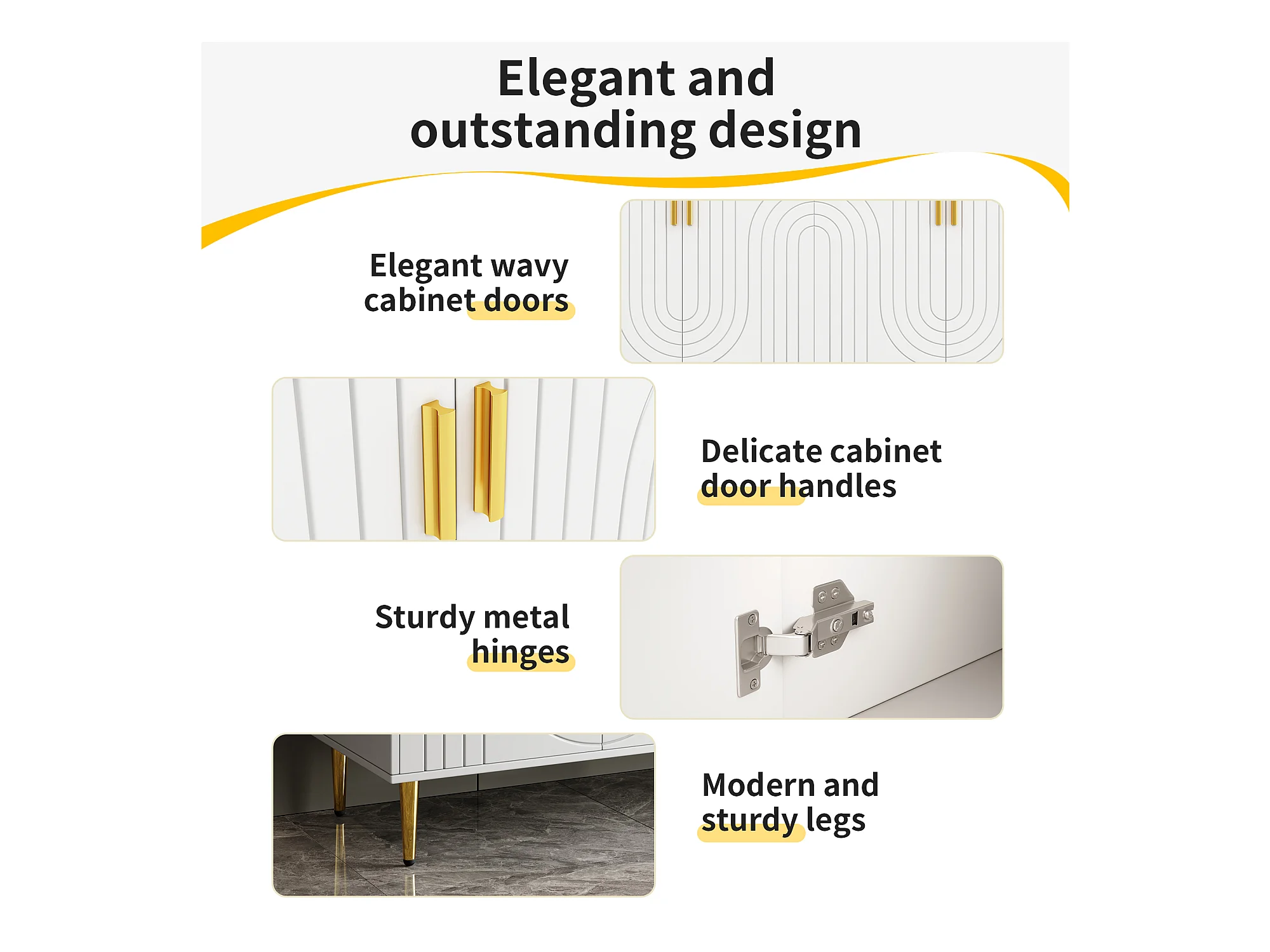 Buffet blanc avec design unique en vagues, poignées et pieds dorés, MDF, pour un espace de salle à manger élégant (152x40x75 cm)