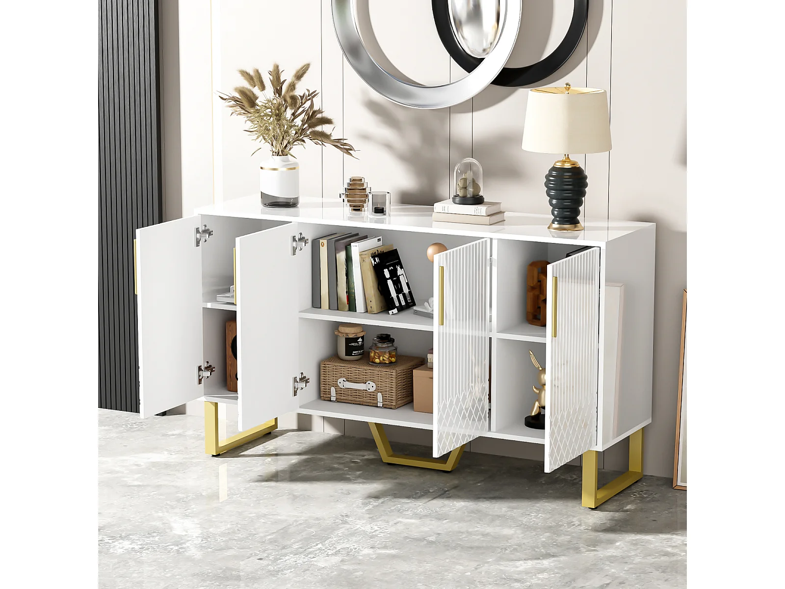 Buffet blanc brillant 140x40x80 cm, 4 portes, poignées et pieds métalliques, design géométrique, style moderne