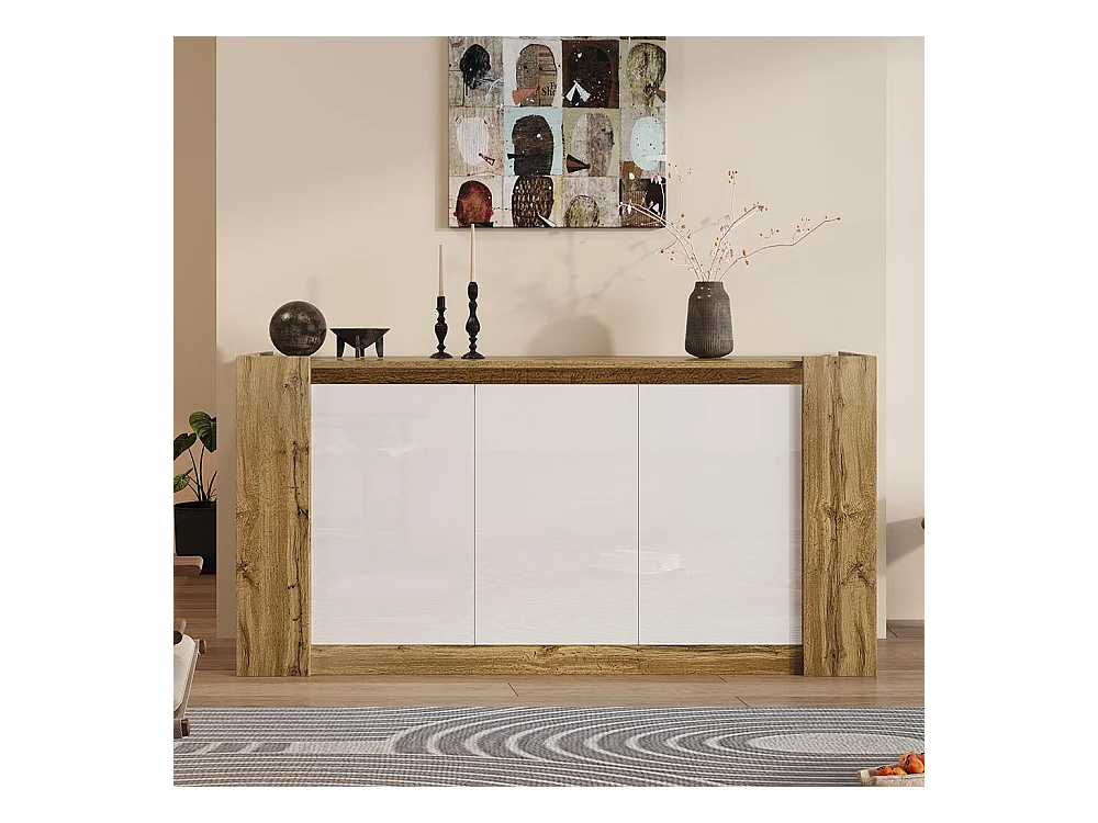 Buffet, blanc brillant et meuble en bois avec portes biseautées pouvant également être utilisées comme tirettes