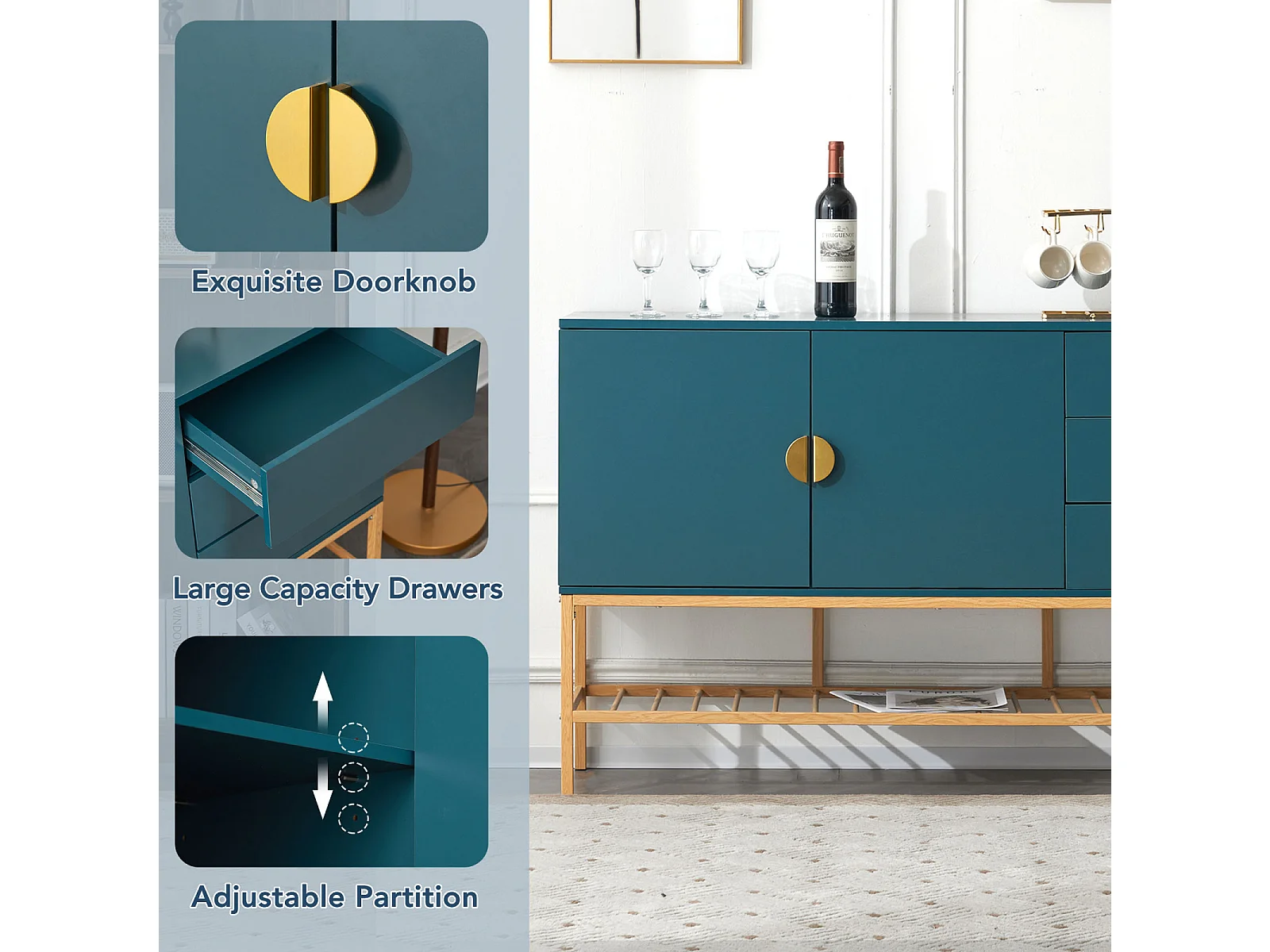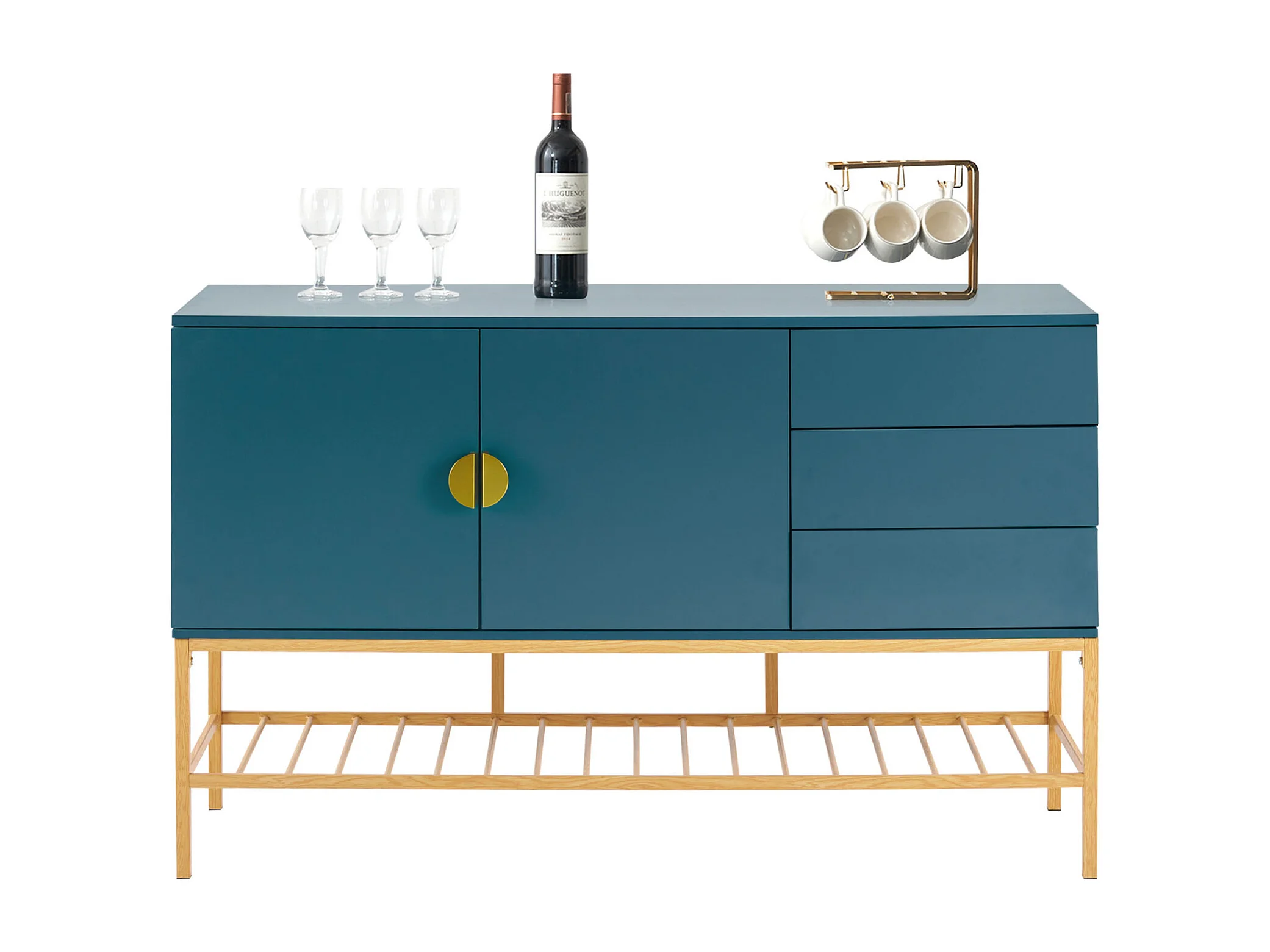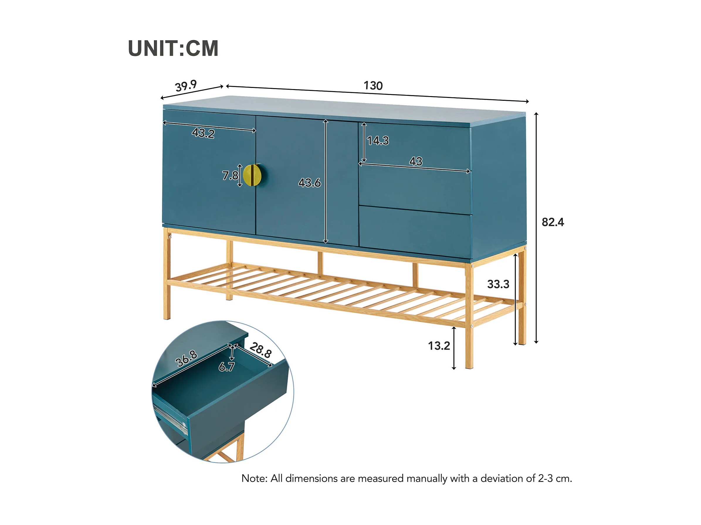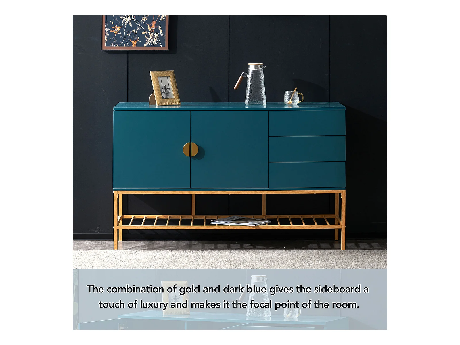 Buffet bleu 130x39.9x82.4cm, Buffet Armoire en MDF, écorations dorées style classique