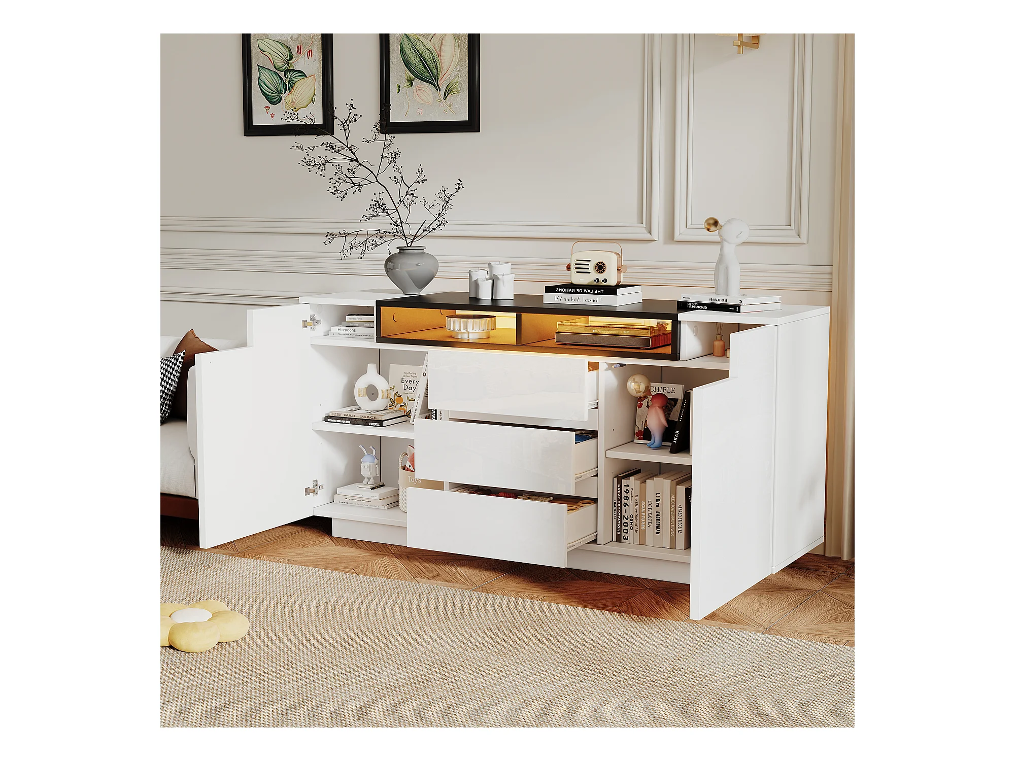 Buffet brillant 140x60x48 cm - 2 portes et 3 tiroirs - avec LED - Étagères réglables - Blanc + Noir